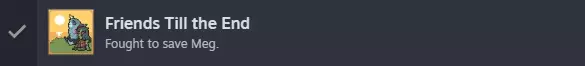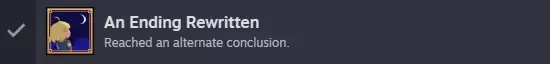 我们会有一些过场动画。 战斗:持续攻击直到战斗结束。 重新获得控制权后,向下然后向右走。 战斗:选择【交谈】,然后使用所有【玩具】,接着选择【回忆】和最后一个【玩具】,在出现提示时选择唯一可用的选项来结束战斗。 随后会有几段剧情过场动画,包括类似制作人员名单的部分,一直观看直到重新获得控制权。 然后检查房子周围的物品,之后离开,会有更多过场动画和真正的最终制作人员名单。完整观看它们以获得AN ENDING REWRITTEN成就,从而100%完成这款优秀的小游戏!