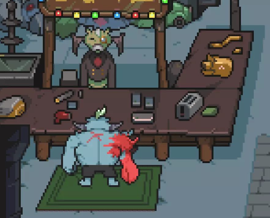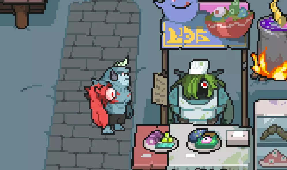 完成后前往村庄。 怪物村 你可以在这里四处看看或与村民交谈,准备好后就去左上角的商店,和这位商人聊聊。