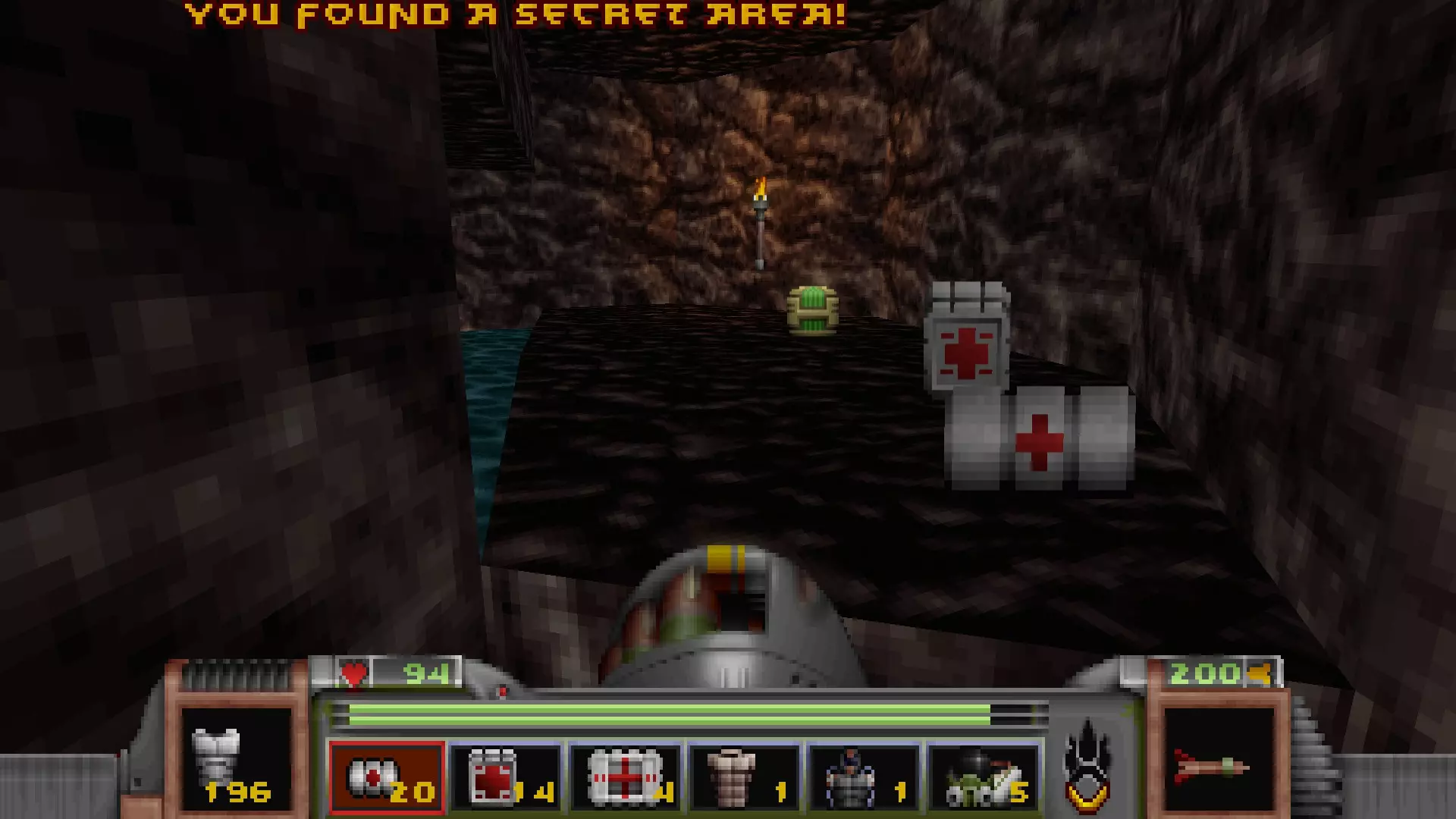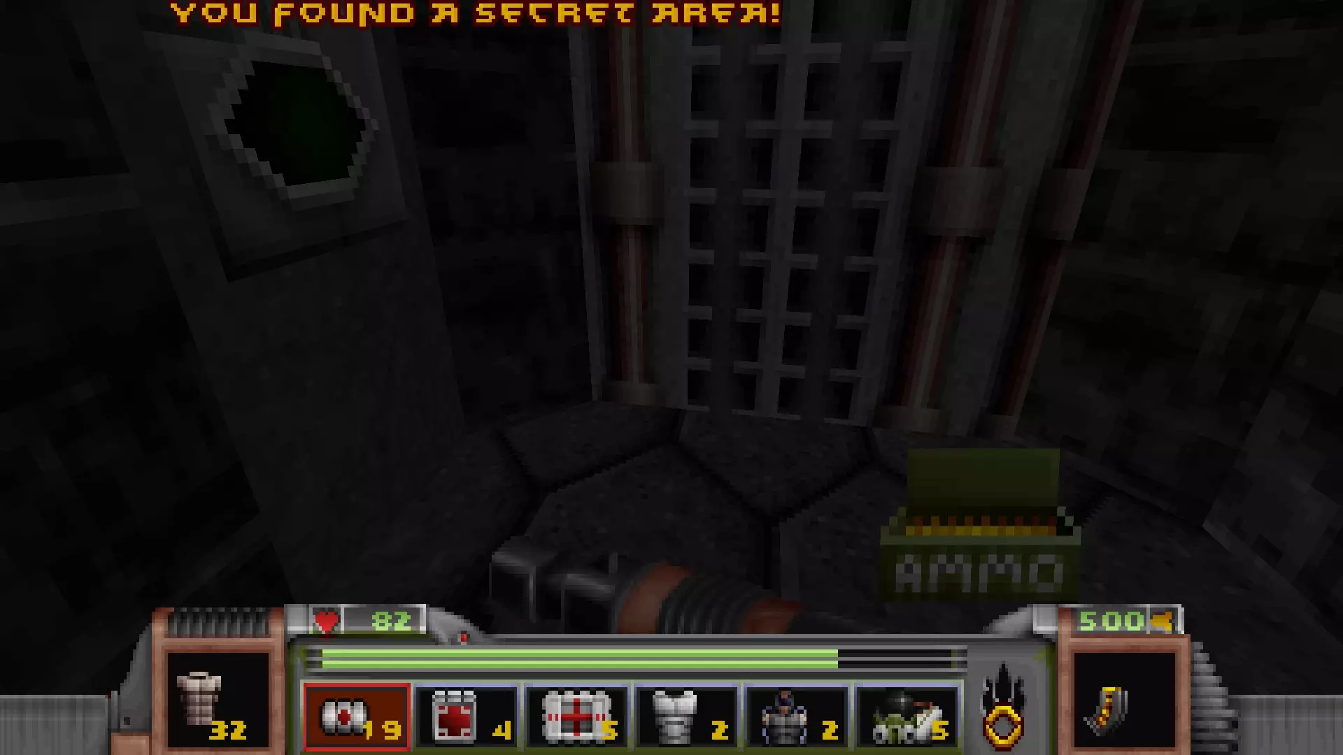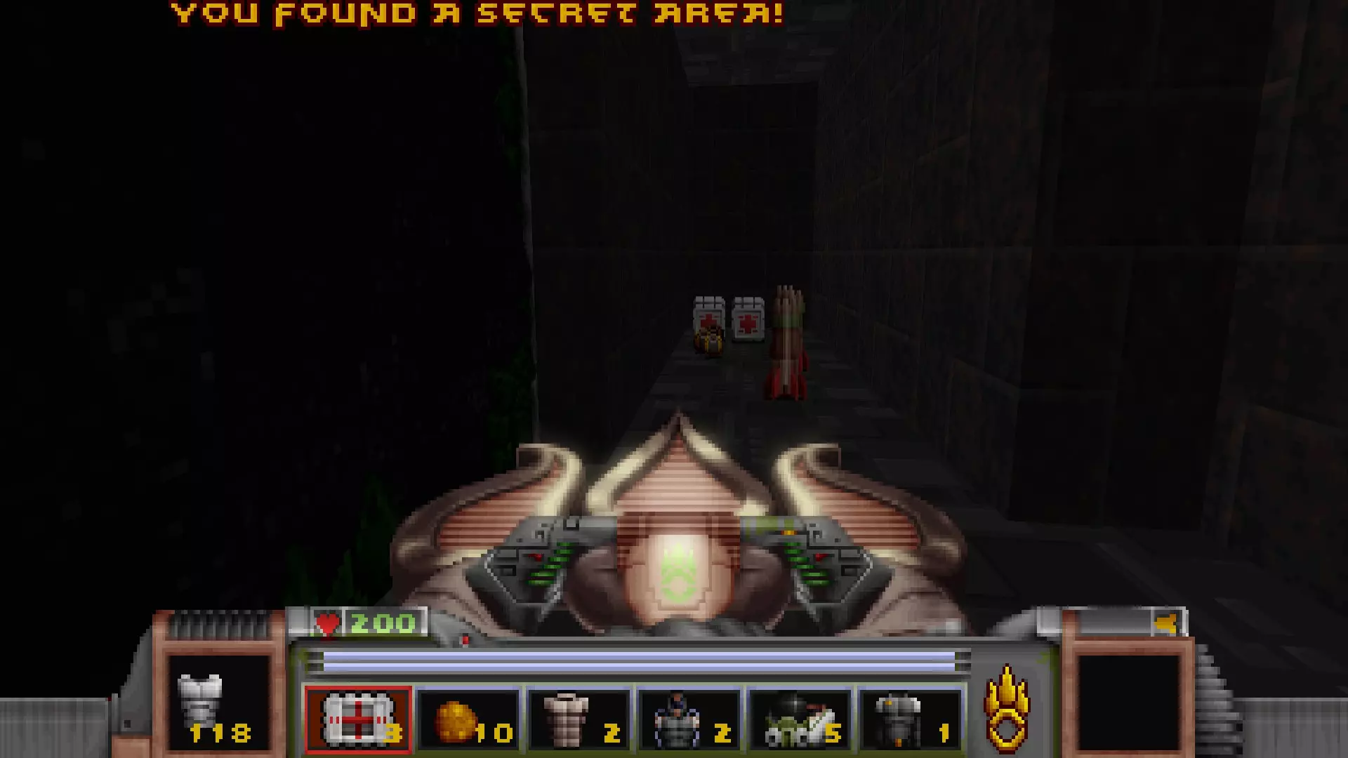 第一个开关就在旁边,它会打开开关右侧的一扇金属门,露出一个类似《黑暗力量》风格的房间,里面有四根绿色柱子。 在房间另一端再按下一个开关,会打开中间的一面墙,露出第一个秘密区域,同时也会解锁通往第二个秘密区域的道路。