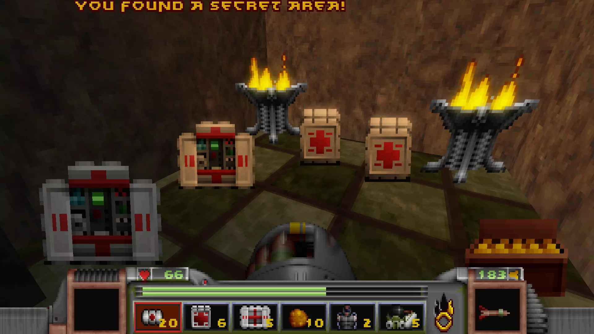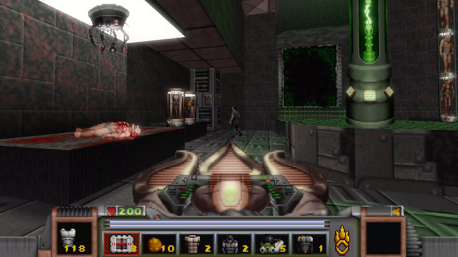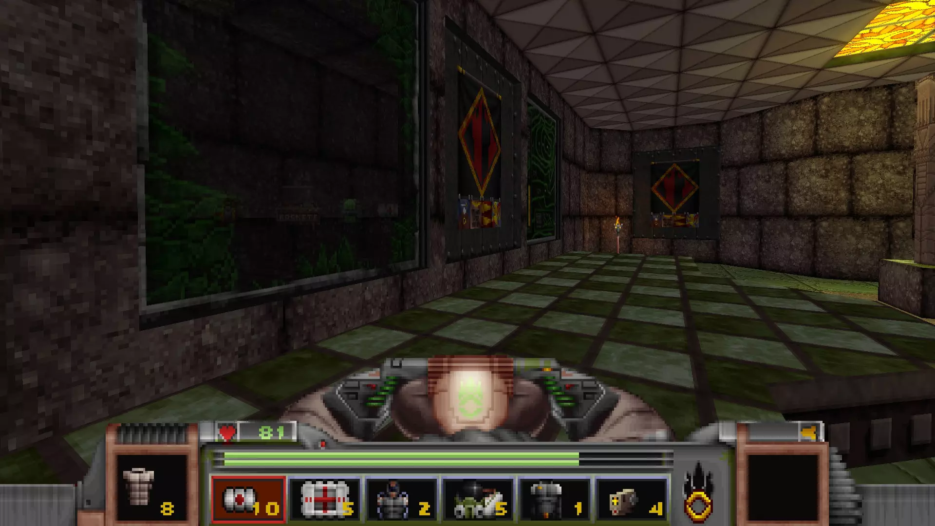 第一个开关就在旁边,它会打开开关右侧的一扇金属门,露出一个类似《黑暗力量》风格的房间,里面有四根绿色柱子。 在房间另一端再按下一个开关,会打开中间的一面墙,露出第一个秘密区域,同时也会解锁通往第二个秘密区域的道路。