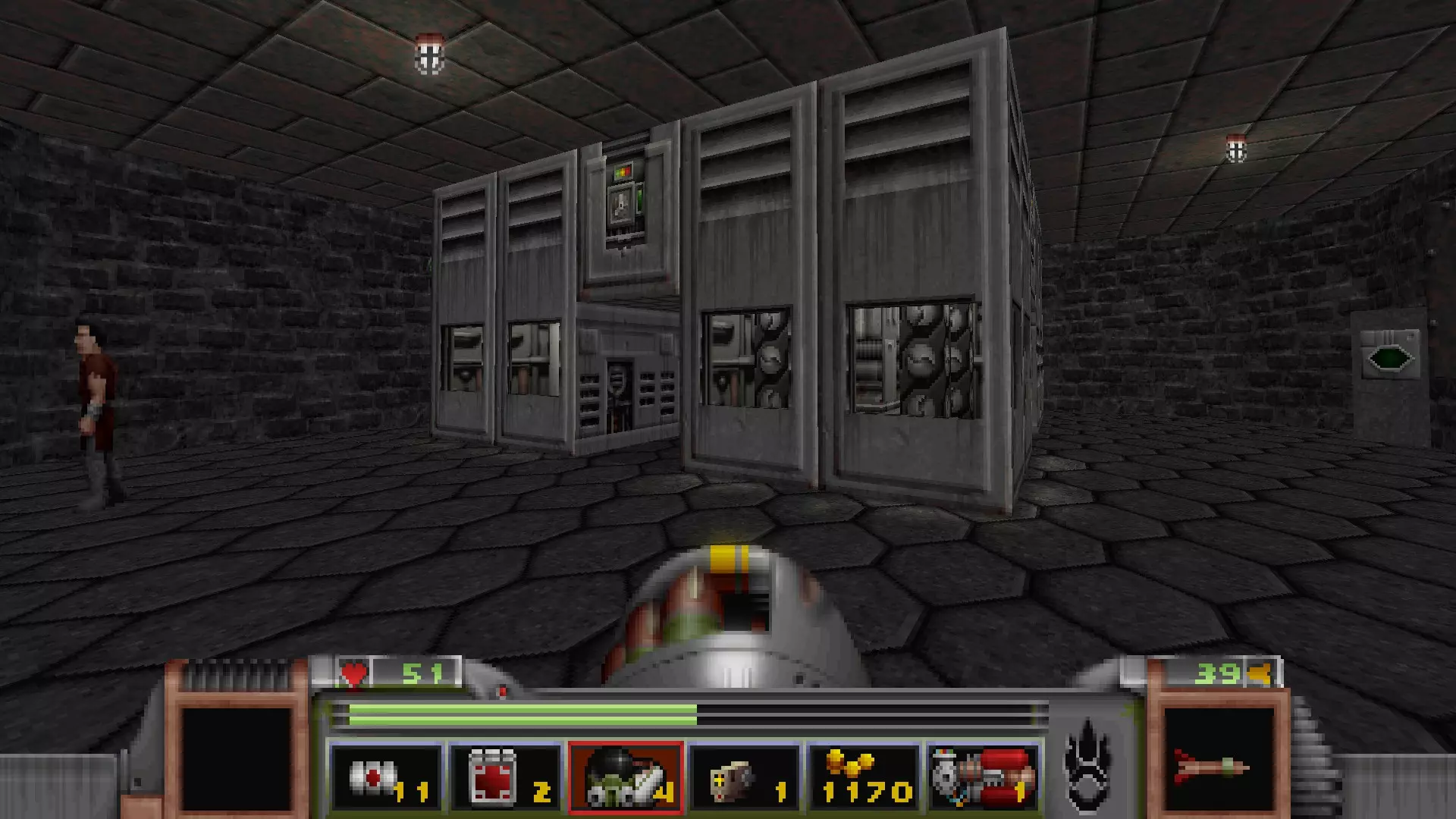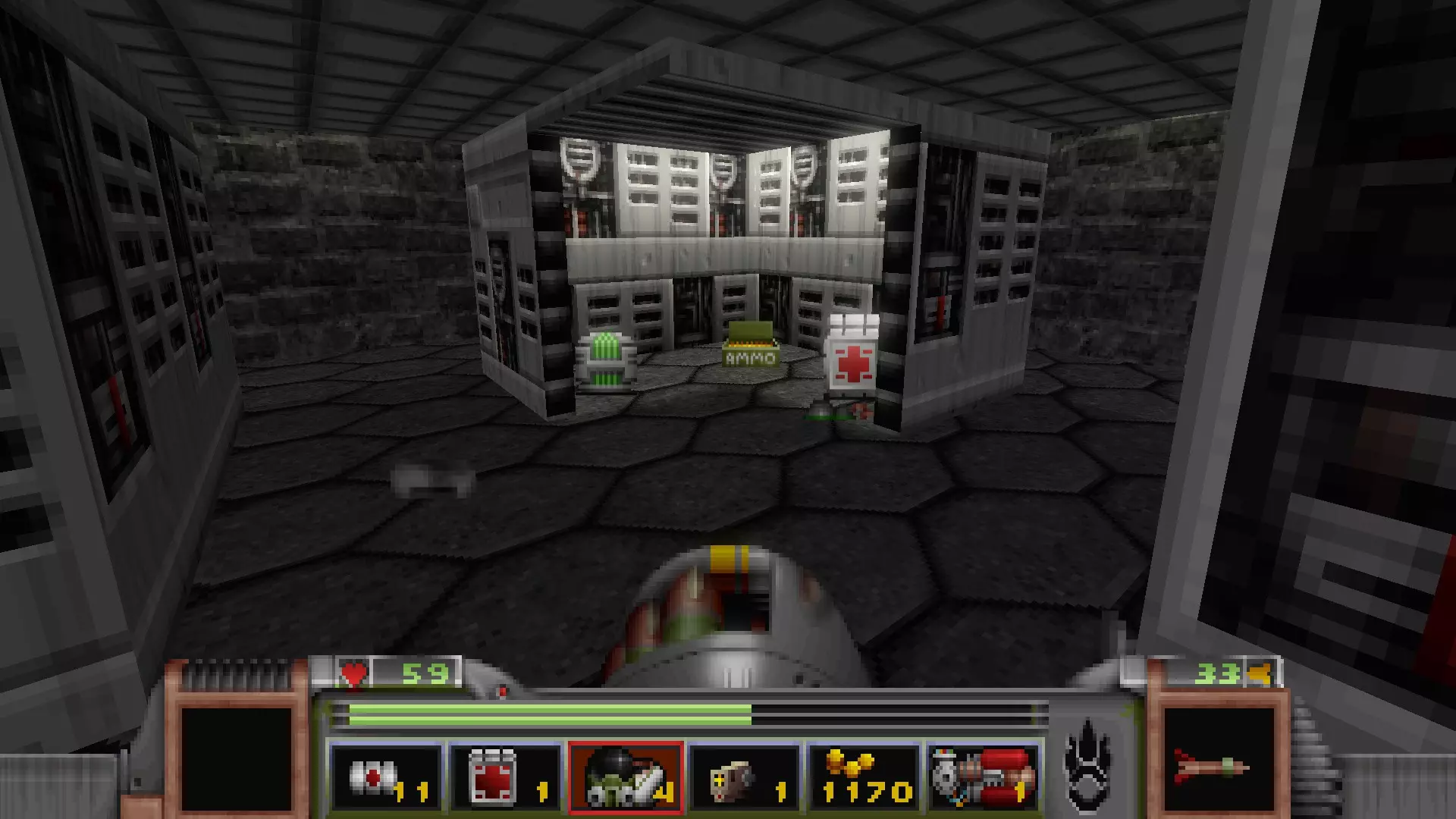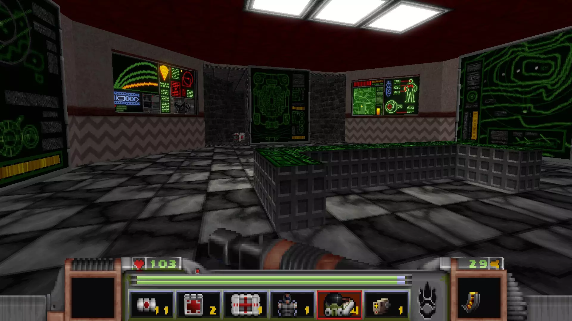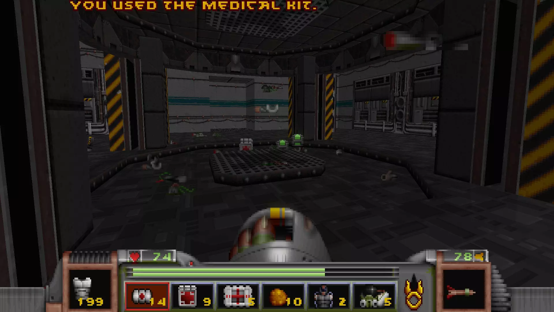 回到有通往反应堆核心秘密通道的区域,但不要走那三级台阶,而是走一个更大的楼梯下去,会遇到一名技术人员,他正在谈论大型绿色显示器附近的武器 stash。杀死他会获得金钥匙,可用于仓库水边的位置。进入这里还会打开技术人员身后的柱子,露出一个哨兵和一些好东西。秘密区域内包含的物品:导弹箱、医疗包