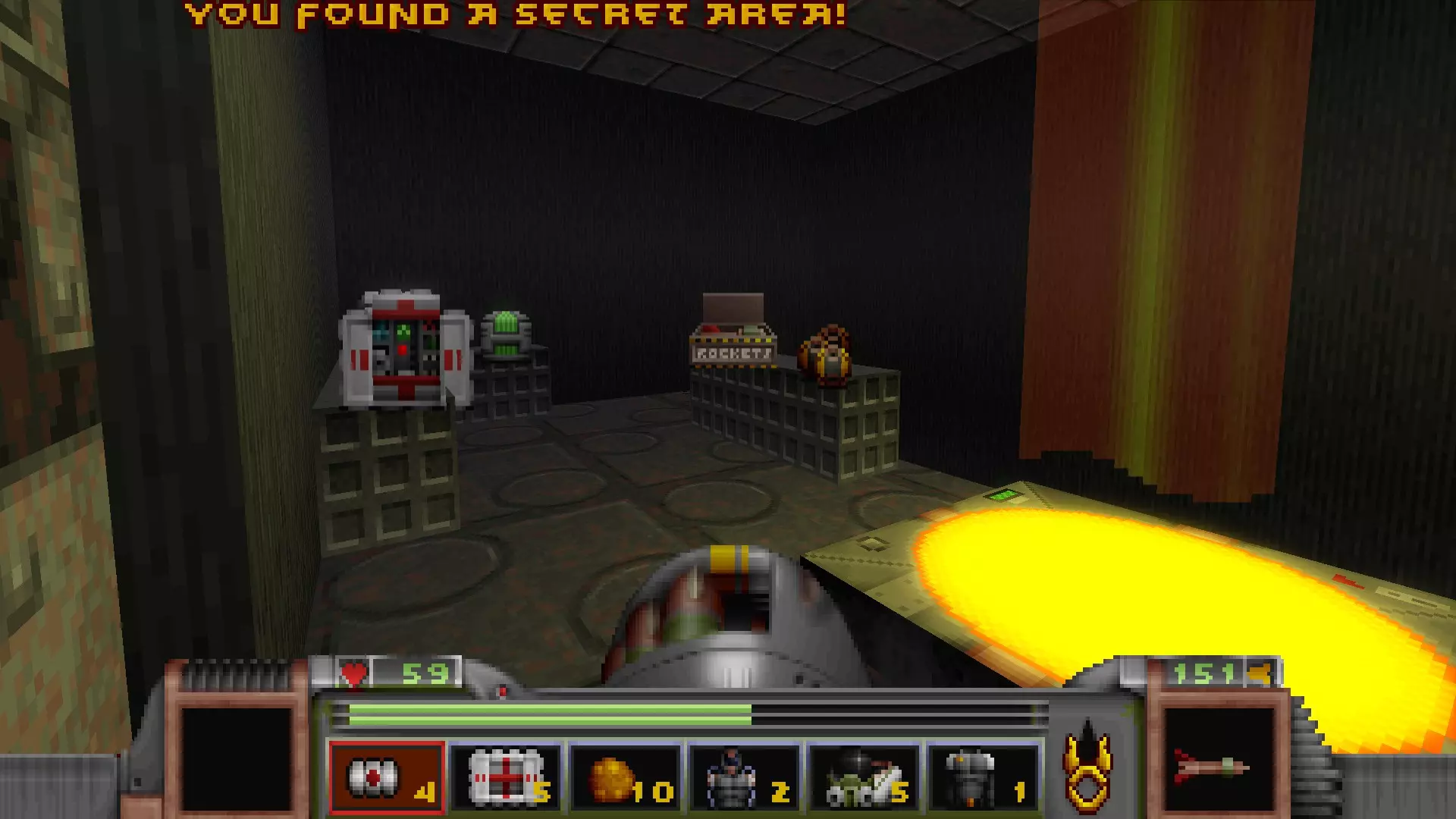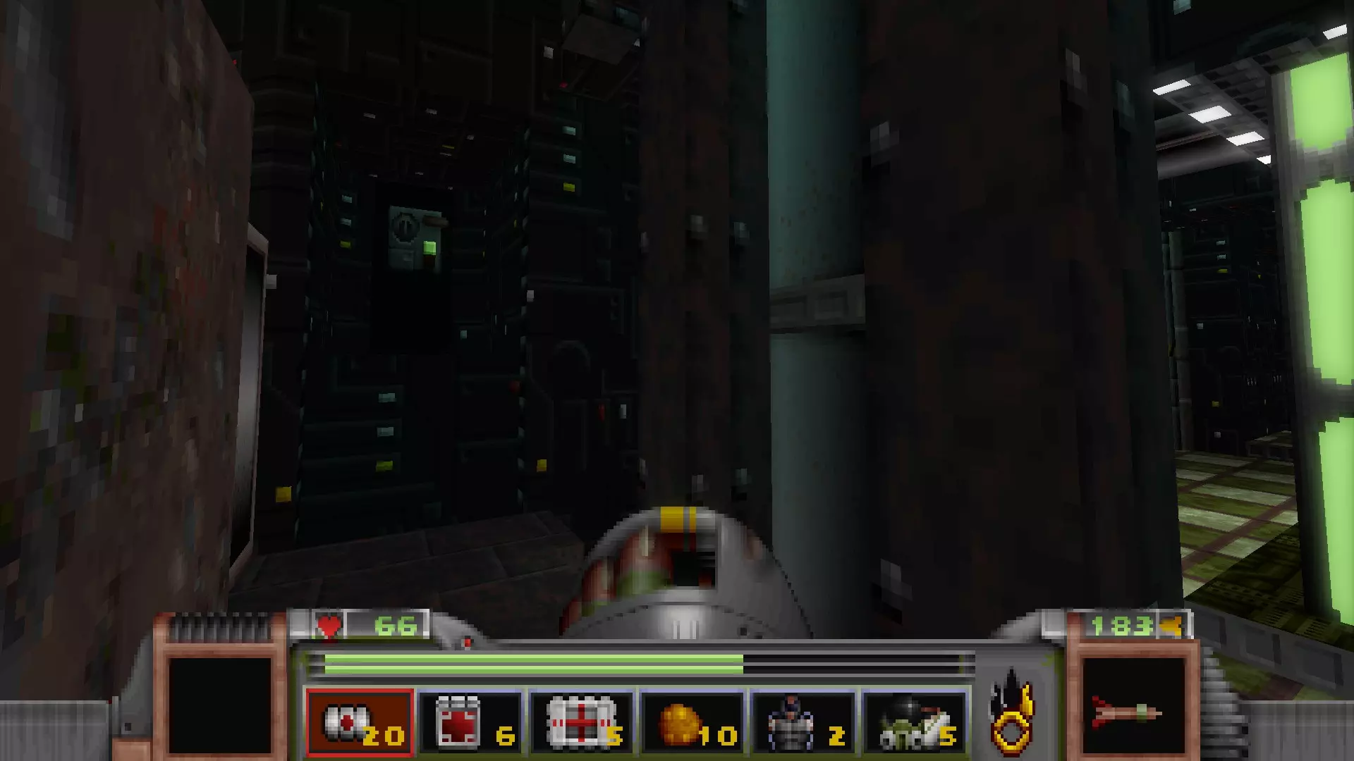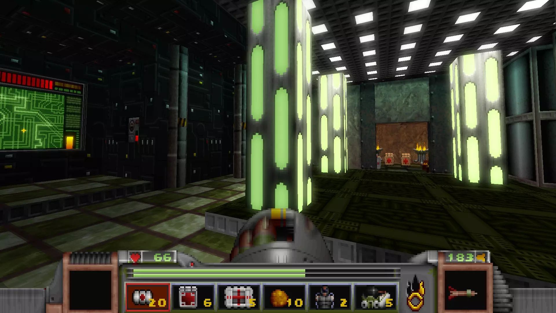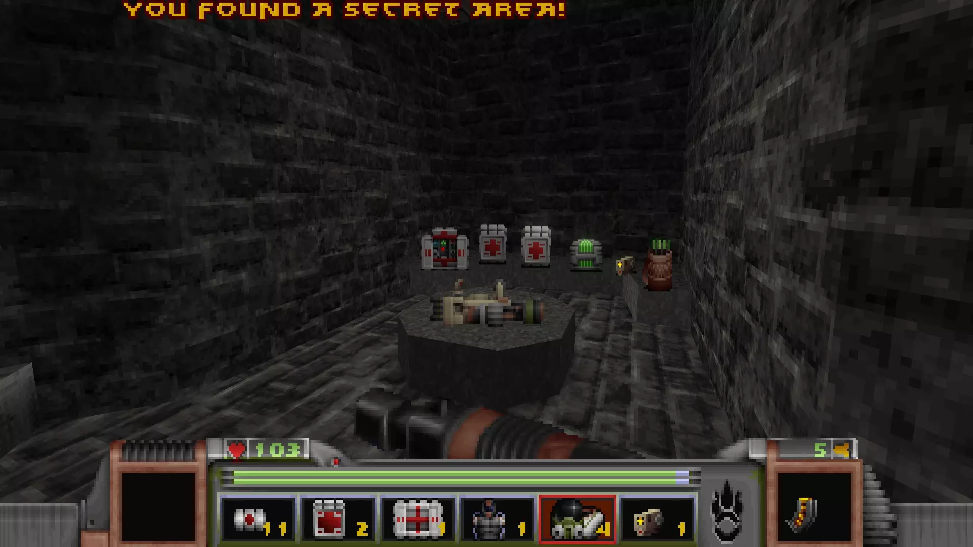 回到有通往反应堆核心秘密通道的区域,但不要走那三级台阶,而是走一个更大的楼梯下去,会遇到一名技术人员,他正在谈论大型绿色显示器附近的武器 stash。杀死他会获得金钥匙,可用于仓库水边的位置。进入这里还会打开技术人员身后的柱子,露出一个哨兵和一些好东西。秘密区域内包含的物品:导弹箱、医疗包