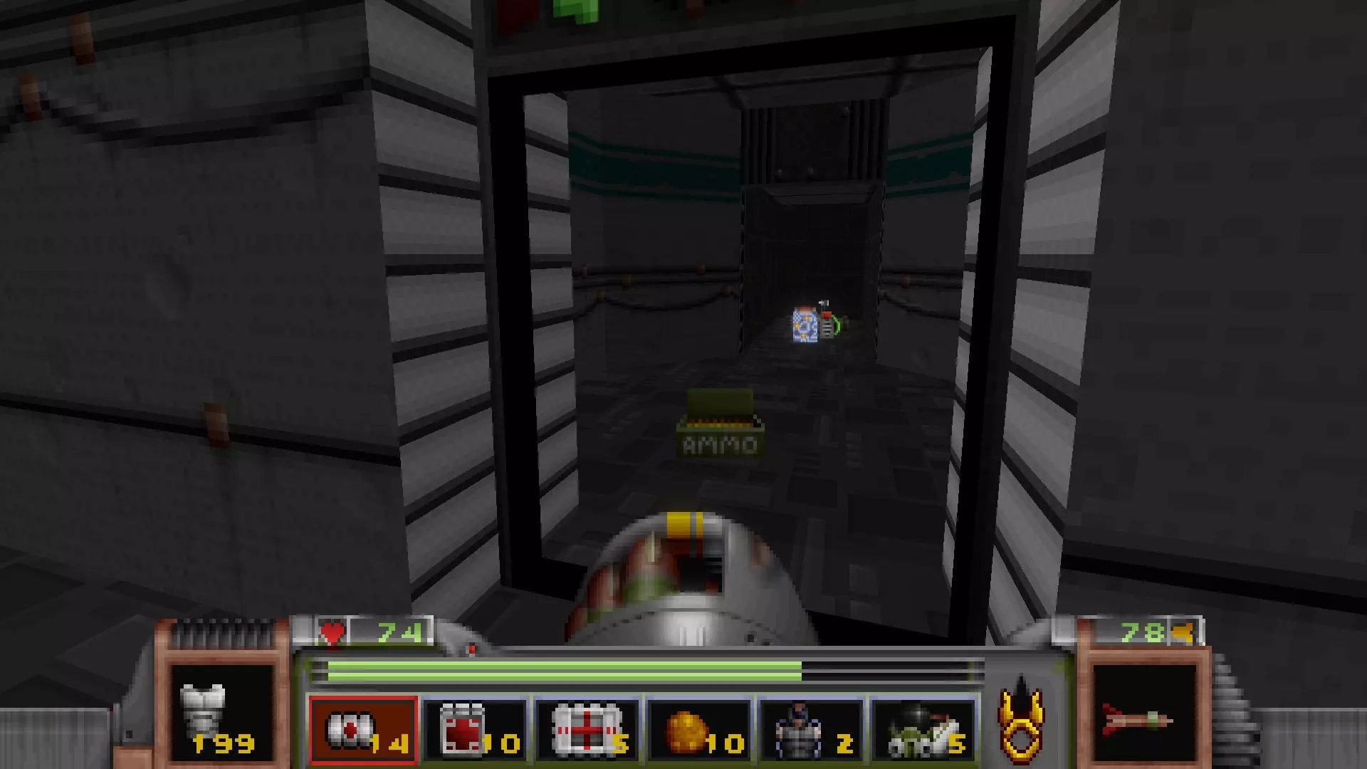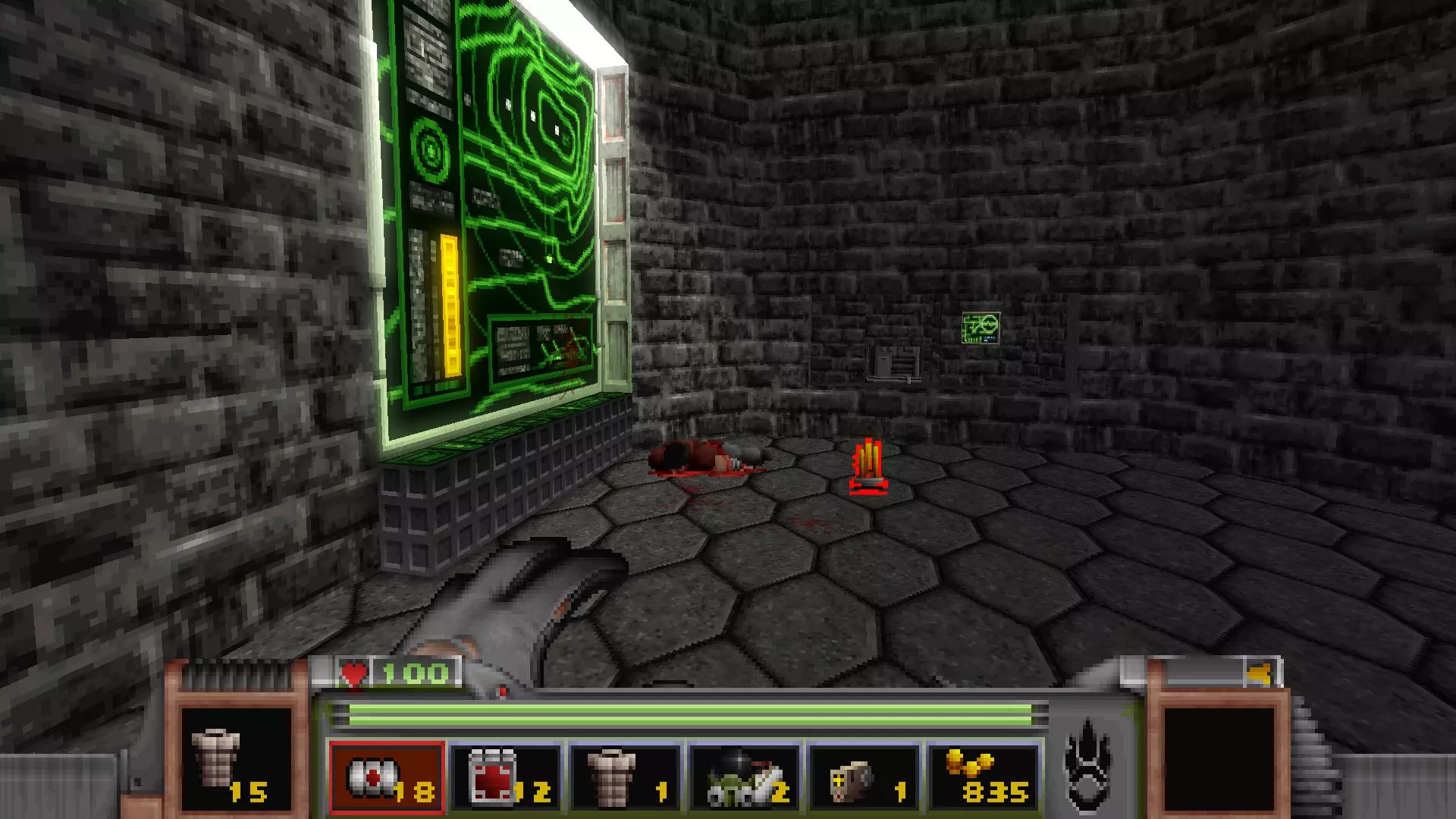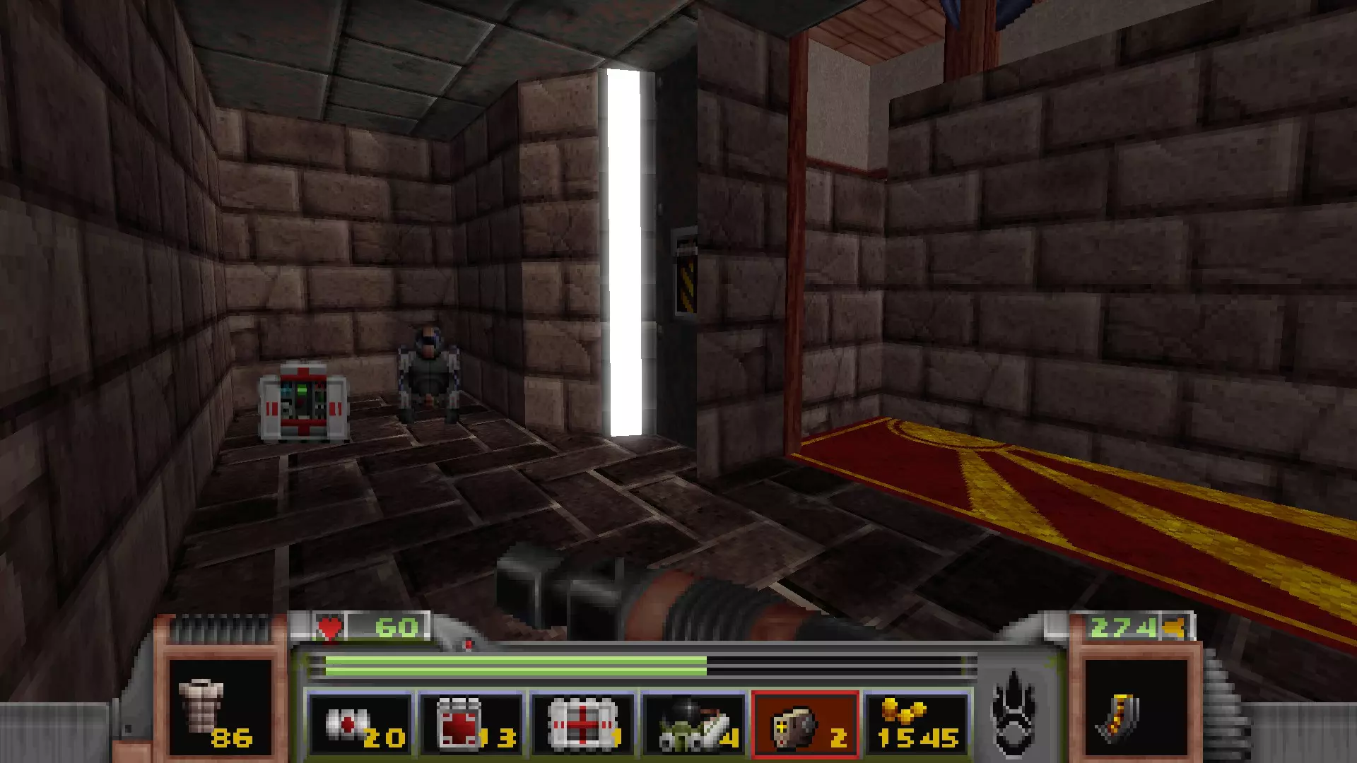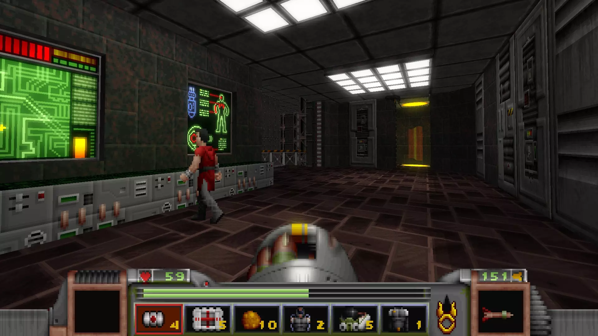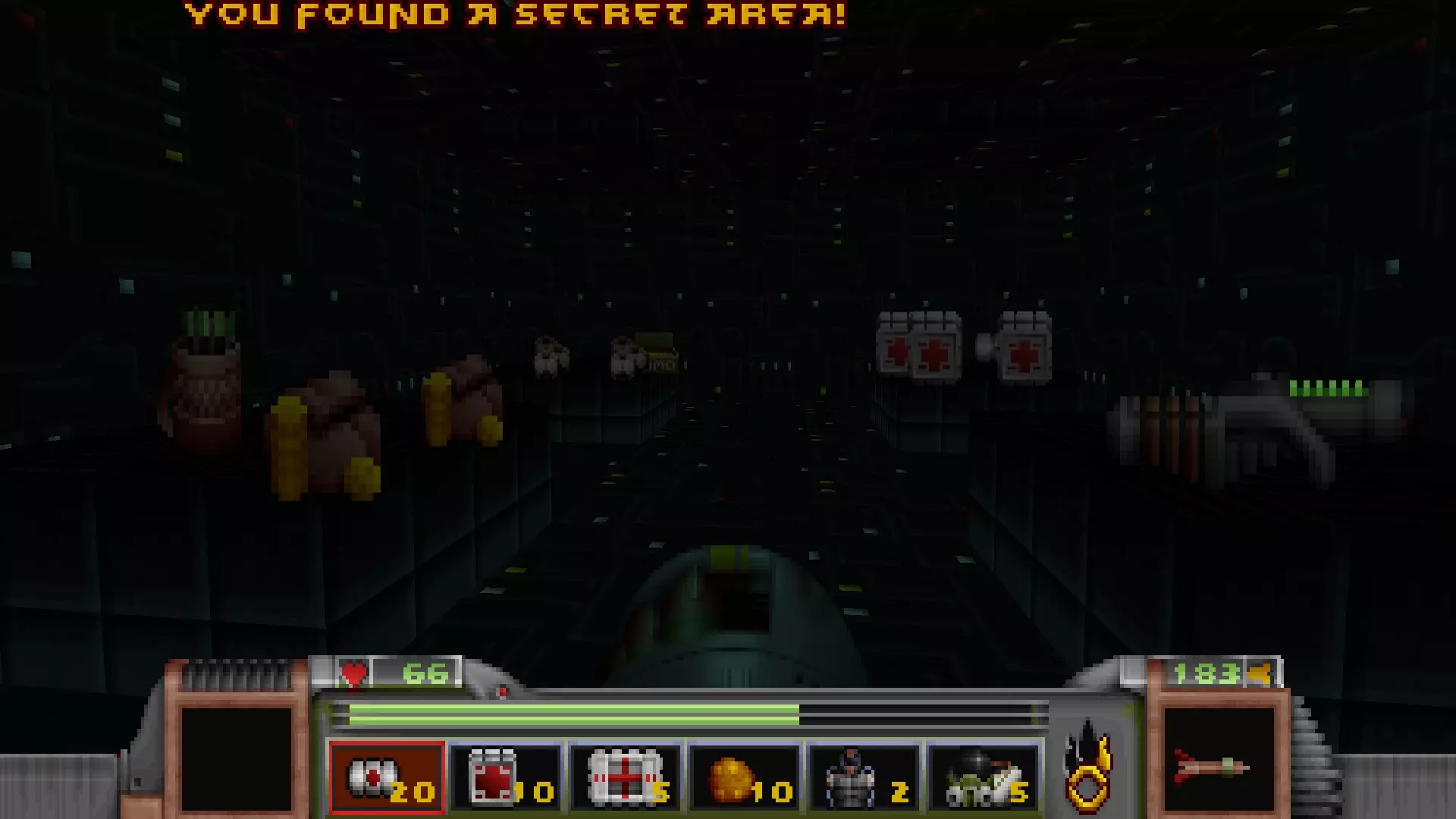 回到有通往反应堆核心秘密通道的区域,但不要走那三级台阶,而是走一个更大的楼梯下去,会遇到一名技术人员,他正在谈论大型绿色显示器附近的武器 stash。杀死他会获得金钥匙,可用于仓库水边的位置。进入这里还会打开技术人员身后的柱子,露出一个哨兵和一些好东西。秘密区域内包含的物品:导弹箱、医疗包