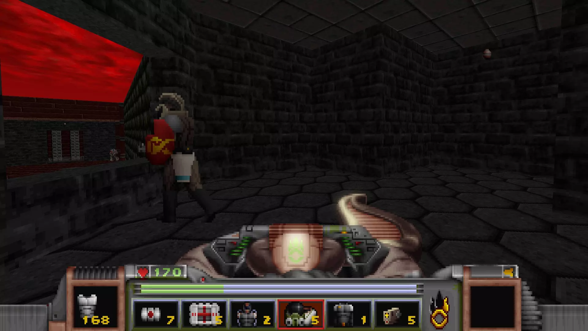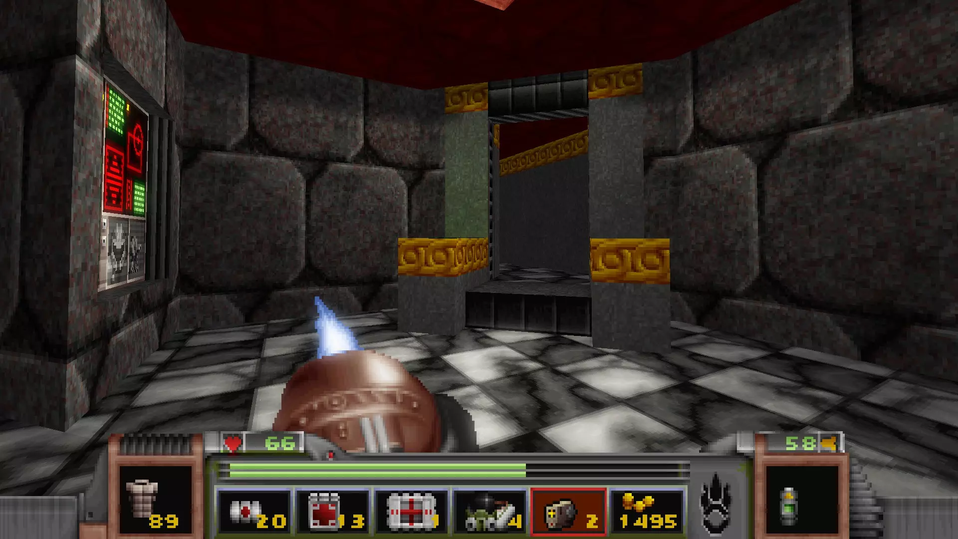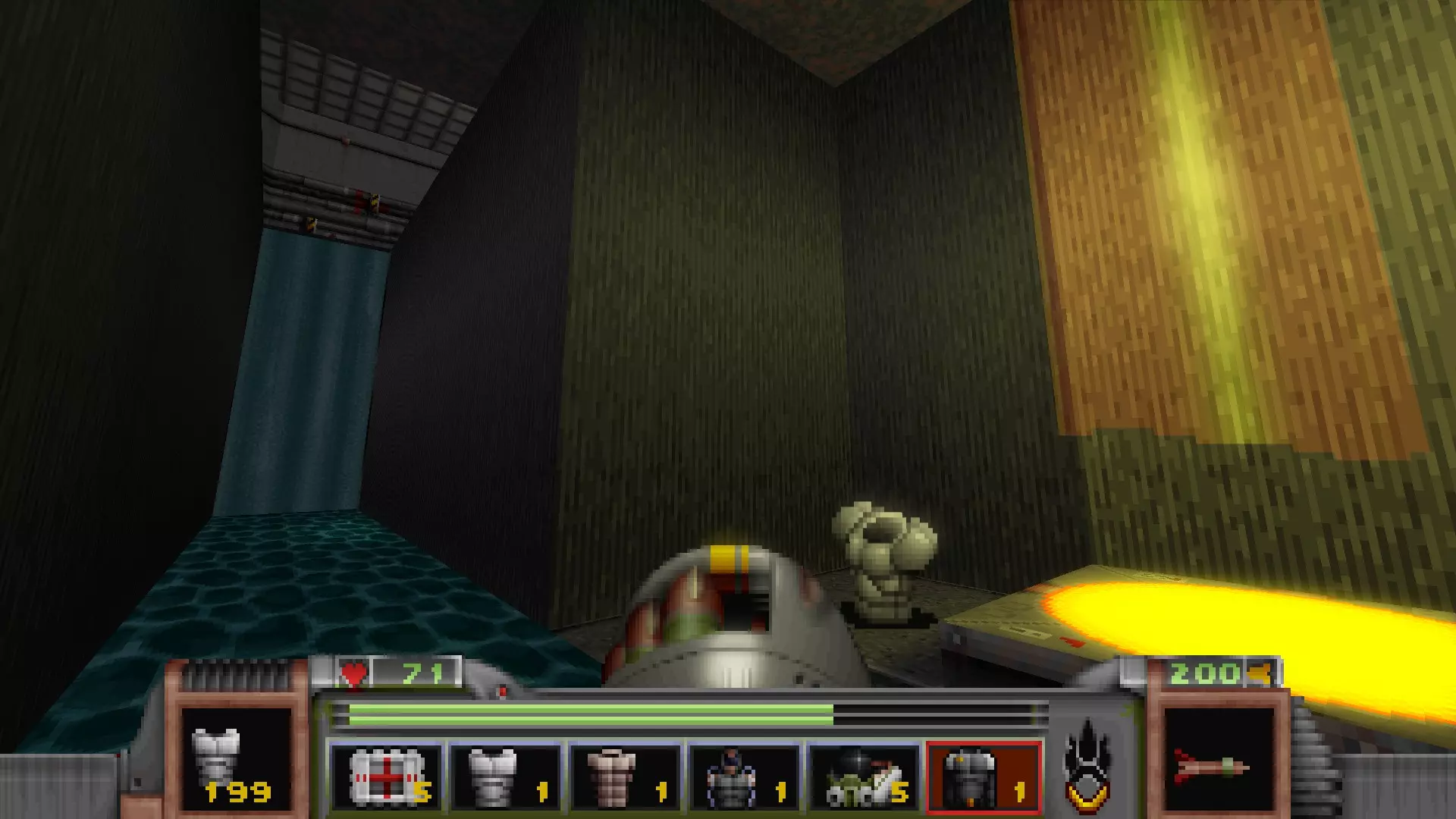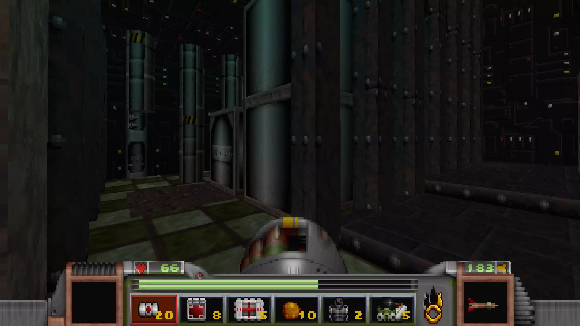 回到有通往反应堆核心秘密通道的区域,但不要走那三级台阶,而是走一个更大的楼梯下去,会遇到一名技术人员,他正在谈论大型绿色显示器附近的武器 stash。杀死他会获得金钥匙,可用于仓库水边的位置。进入这里还会打开技术人员身后的柱子,露出一个哨兵和一些好东西。秘密区域内包含的物品:导弹箱、医疗包