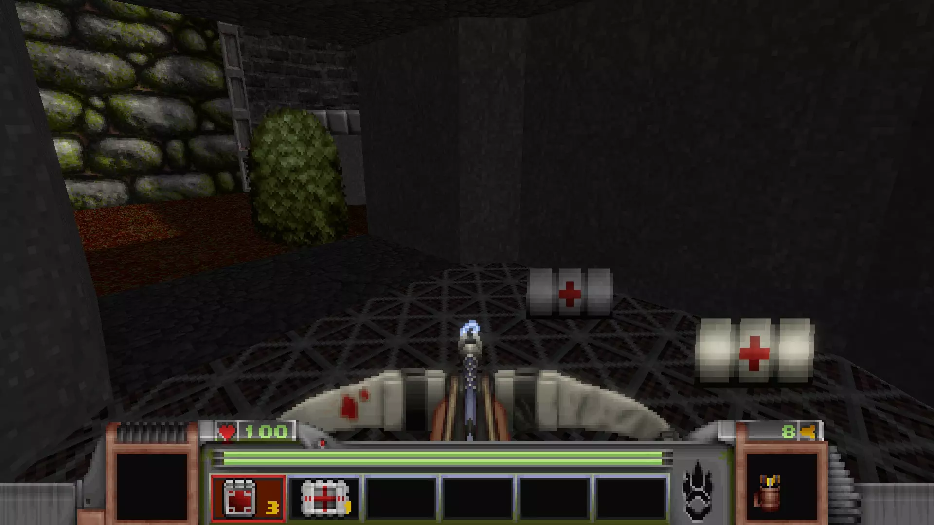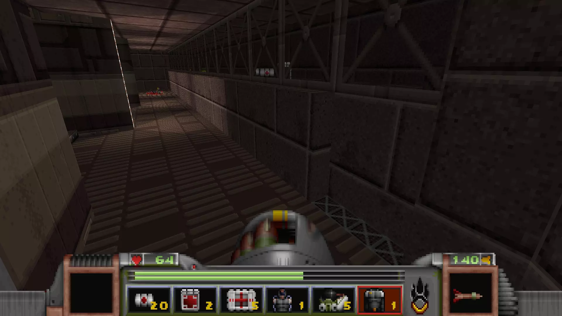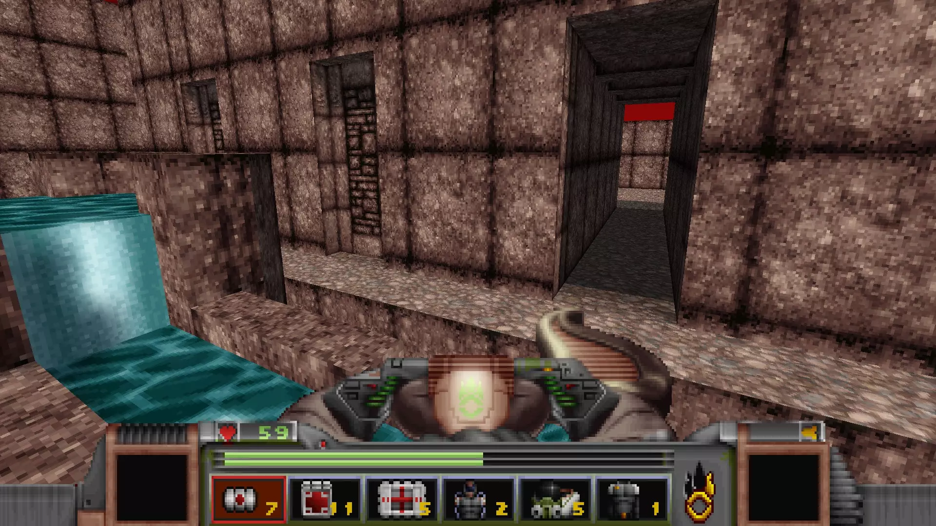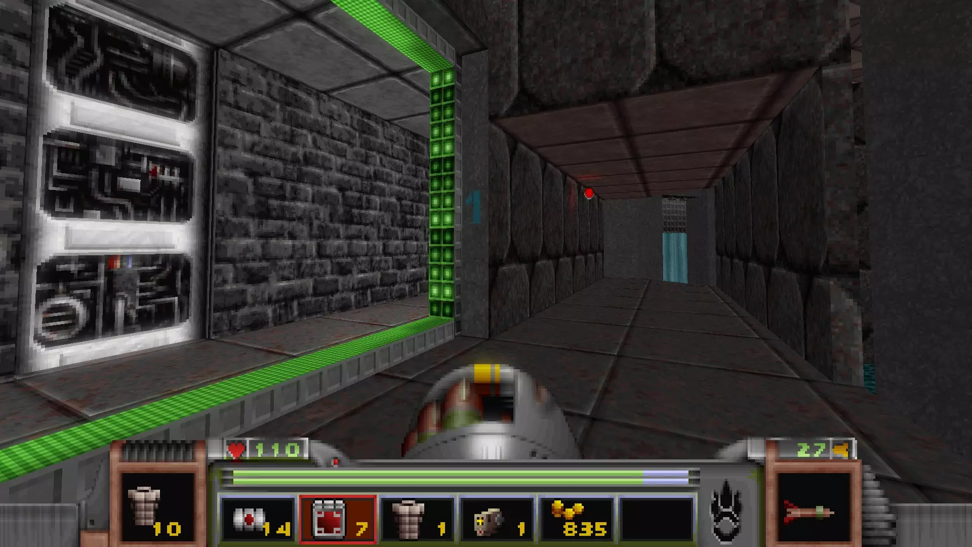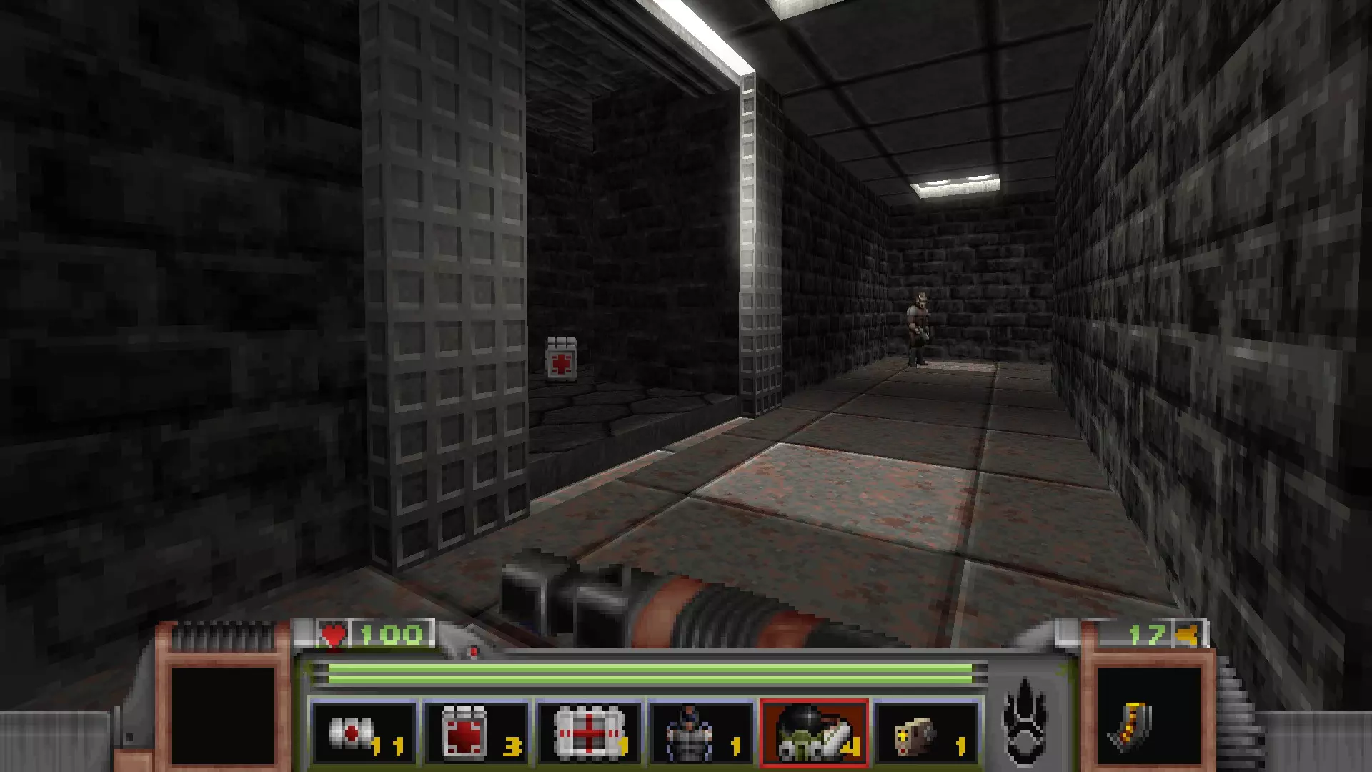 在转换室大致对称的位置,一根金属柱已移开,露出了管道系统。你会被一个棕色方块挡住,但对着它按使用键会使其降下,从而进入后方的走廊。 进入走廊,向秘密区域前进。途中有两个医疗包作为额外奖励。