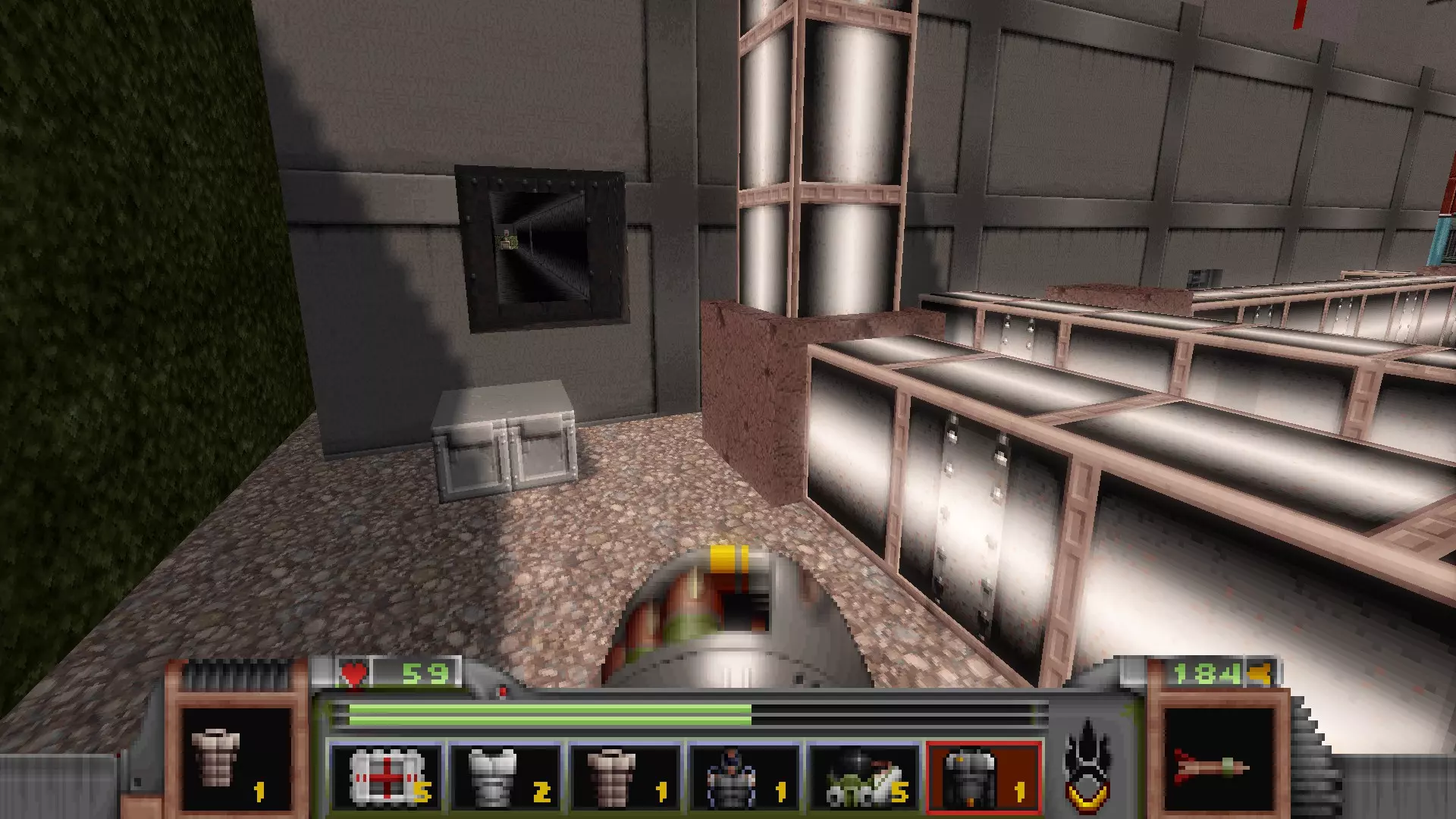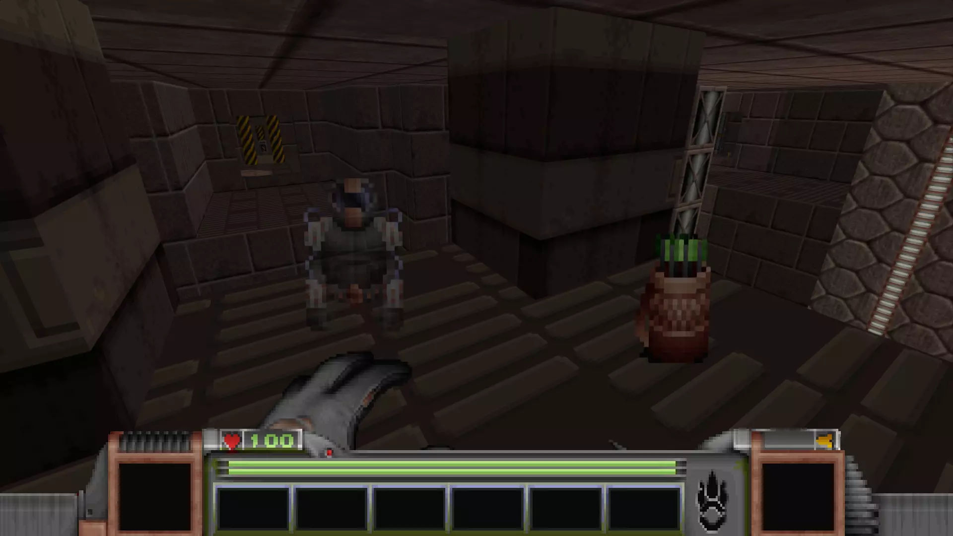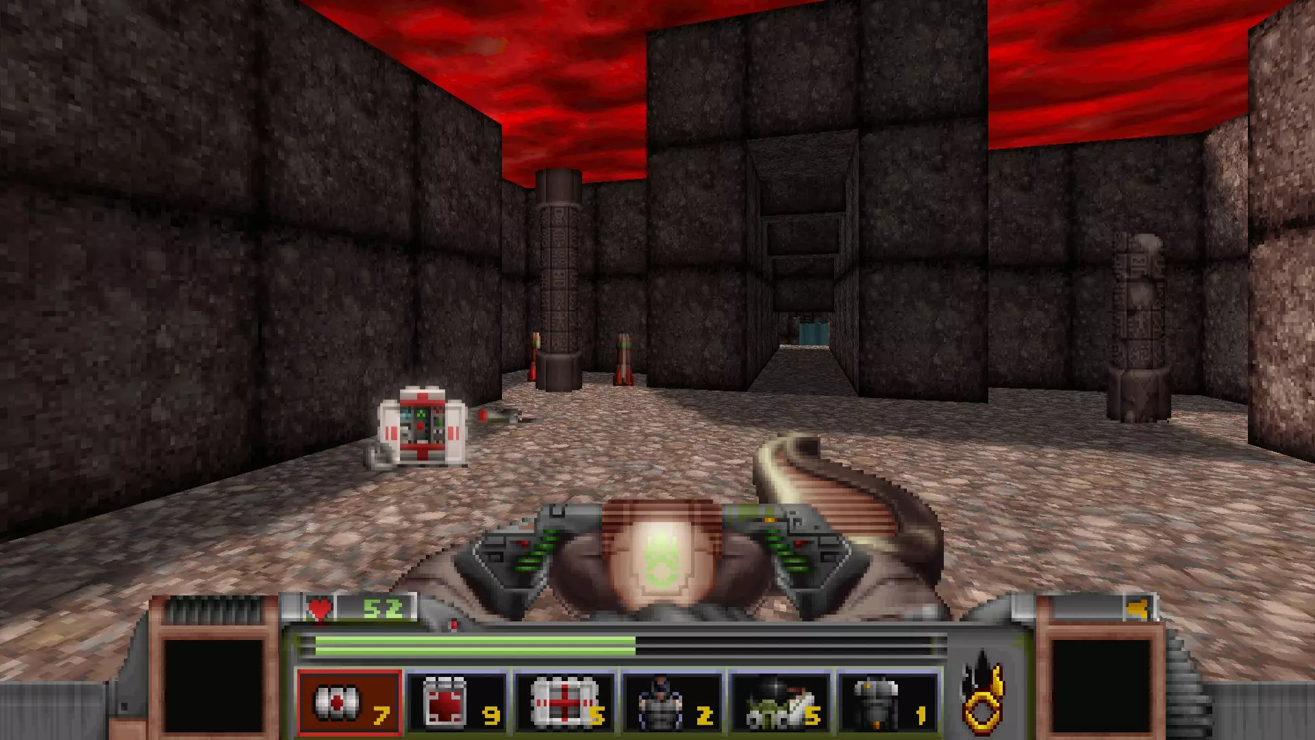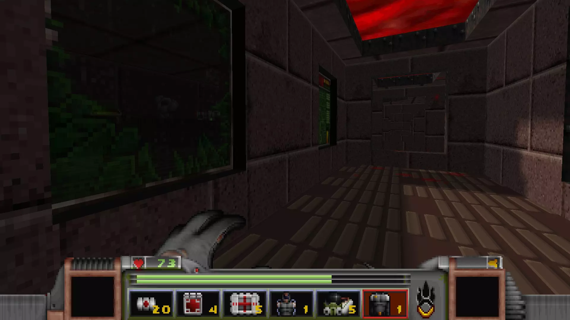 在转换室大致对称的位置,一根金属柱已移开,露出了管道系统。你会被一个棕色方块挡住,但对着它按使用键会使其降下,从而进入后方的走廊。 进入走廊,向秘密区域前进。途中有两个医疗包作为额外奖励。