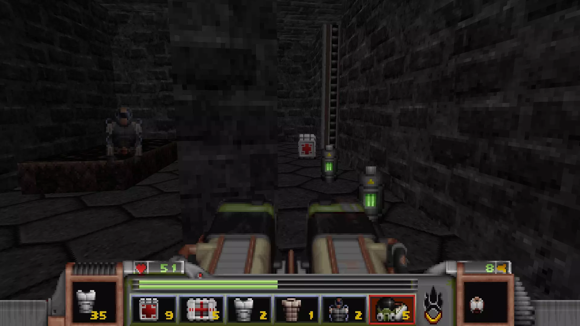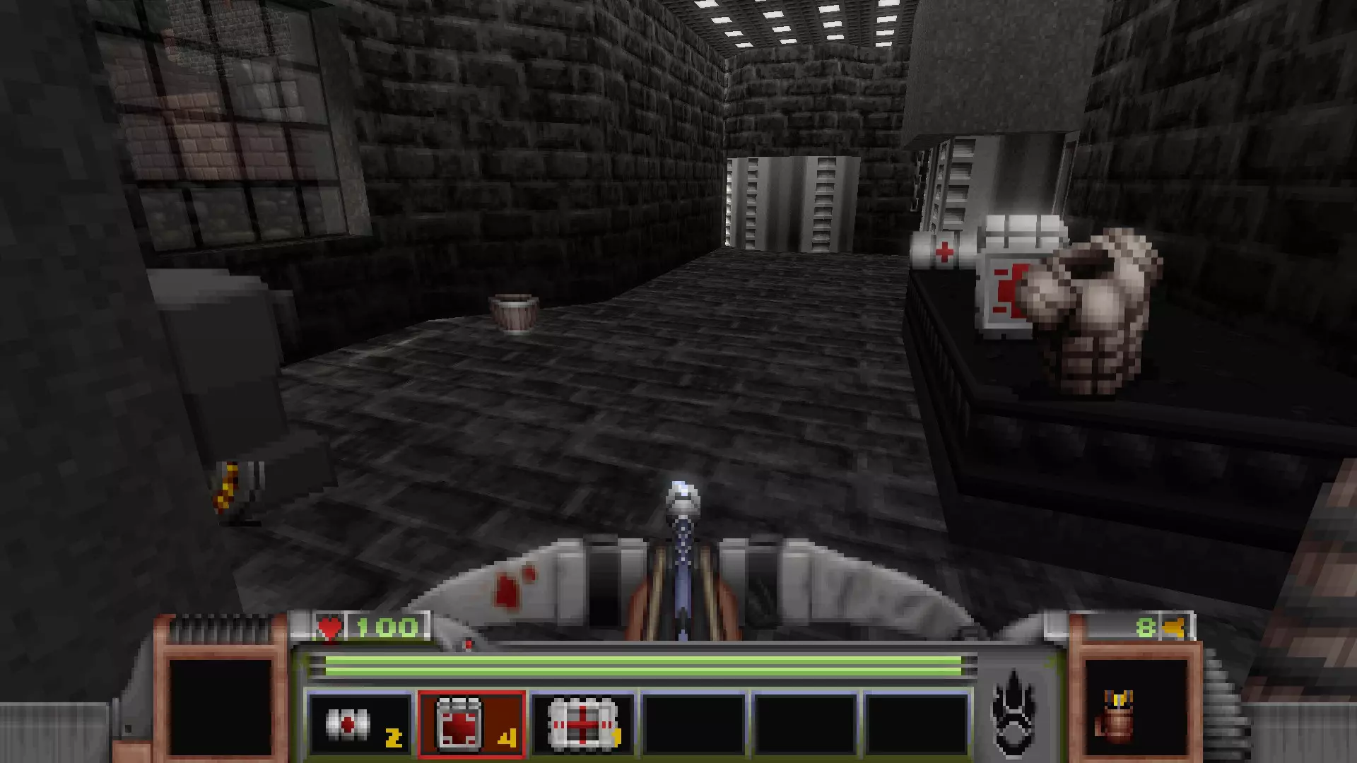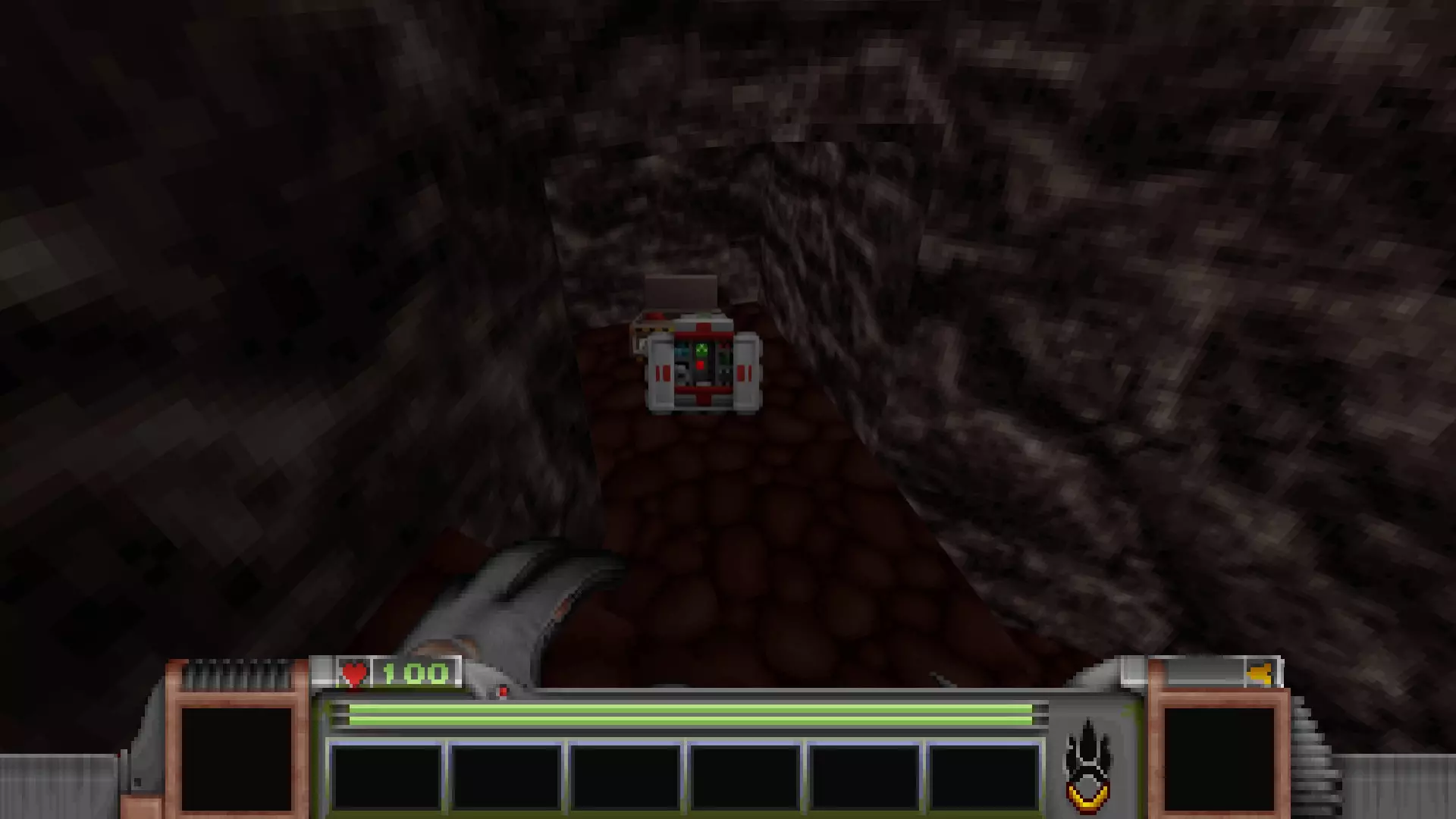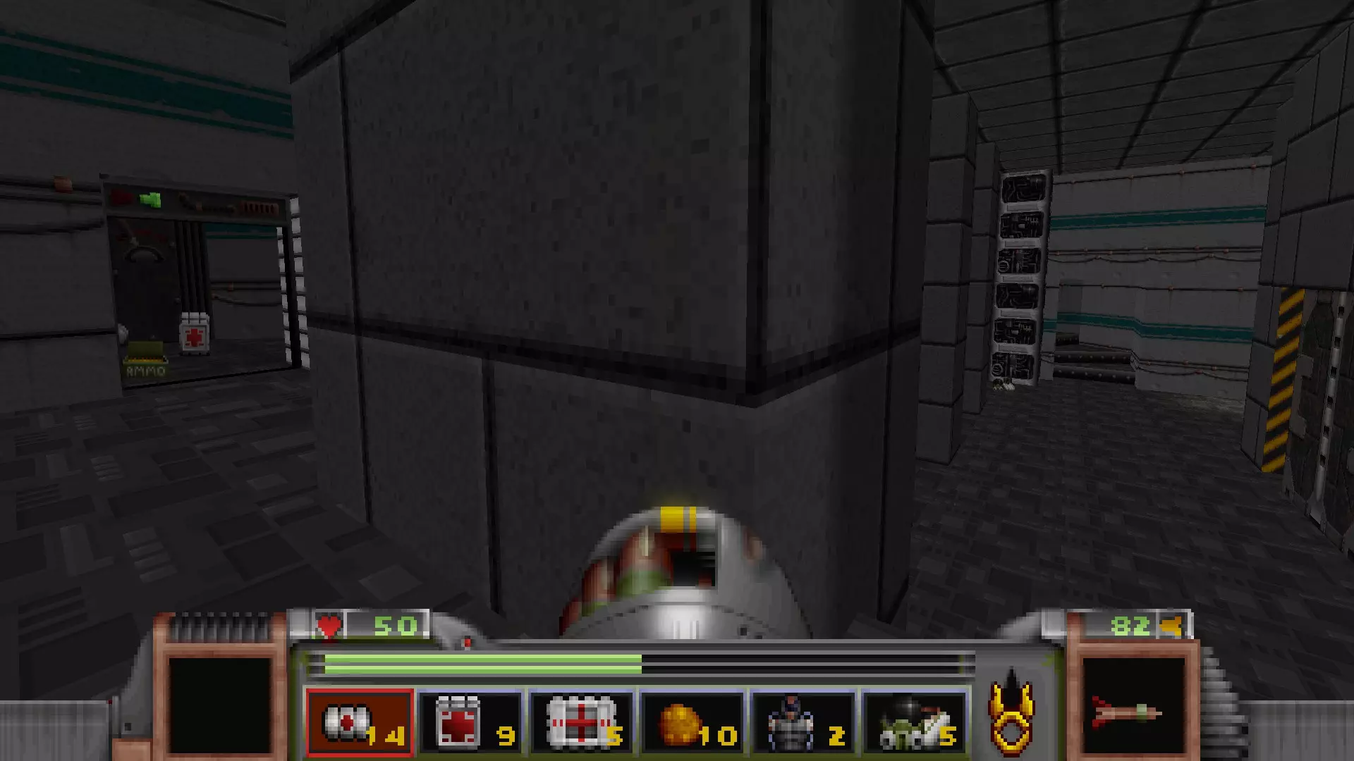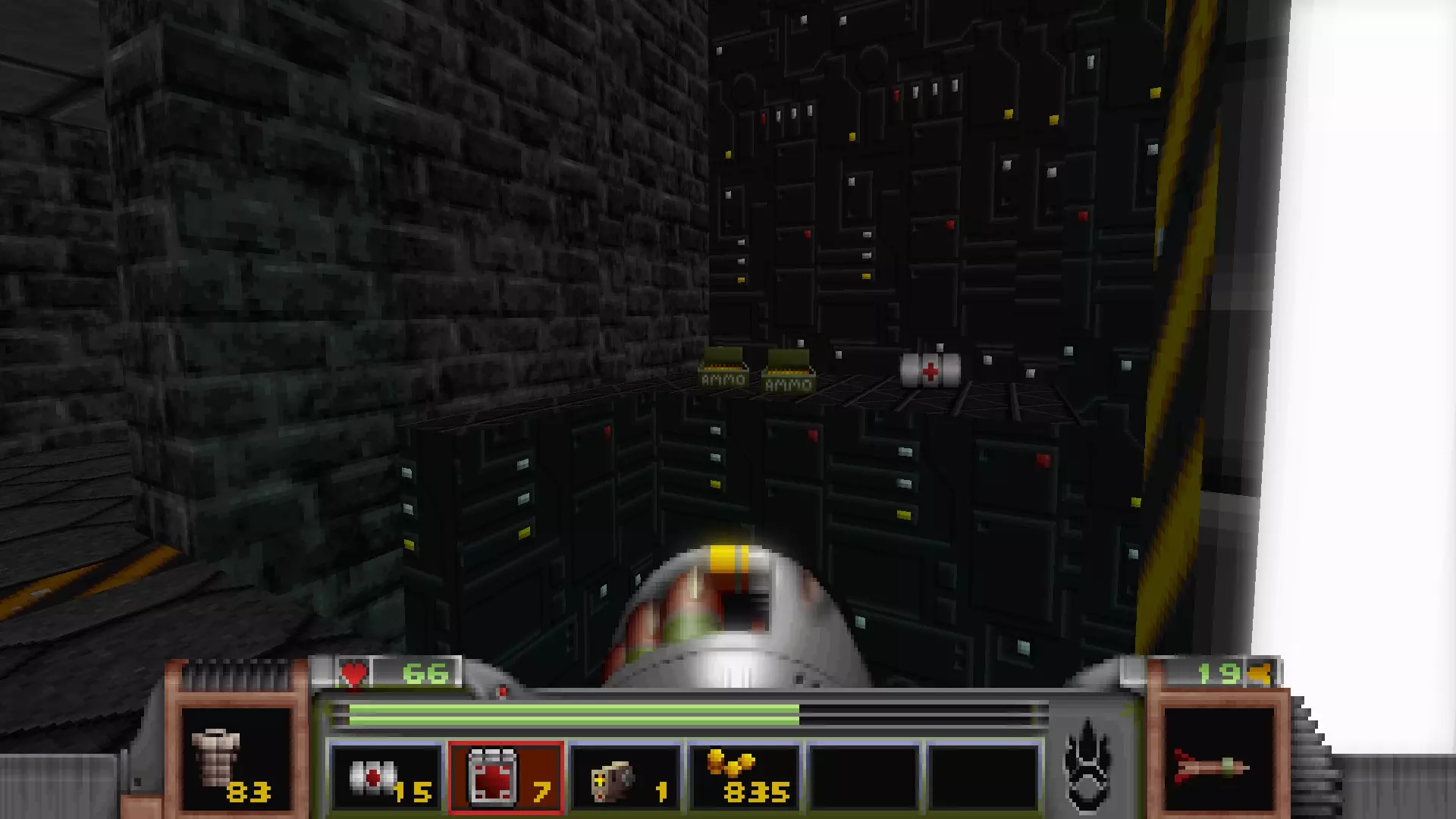 在转换室大致对称的位置,一根金属柱已移开,露出了管道系统。你会被一个棕色方块挡住,但对着它按使用键会使其降下,从而进入后方的走廊。 进入走廊,向秘密区域前进。途中有两个医疗包作为额外奖励。