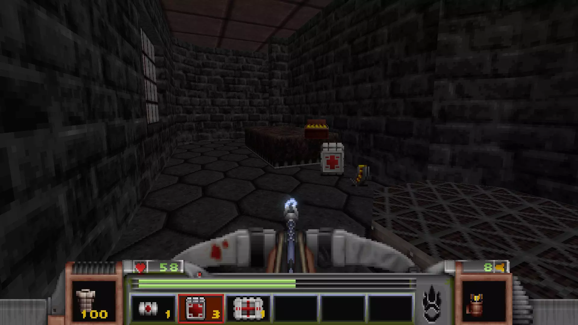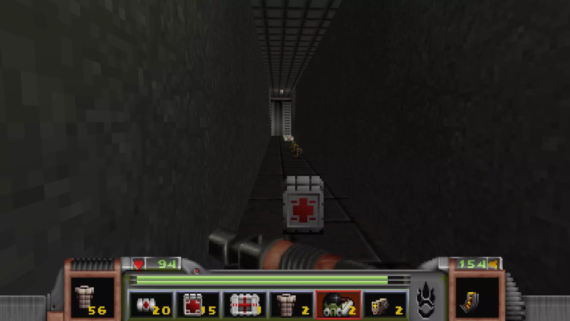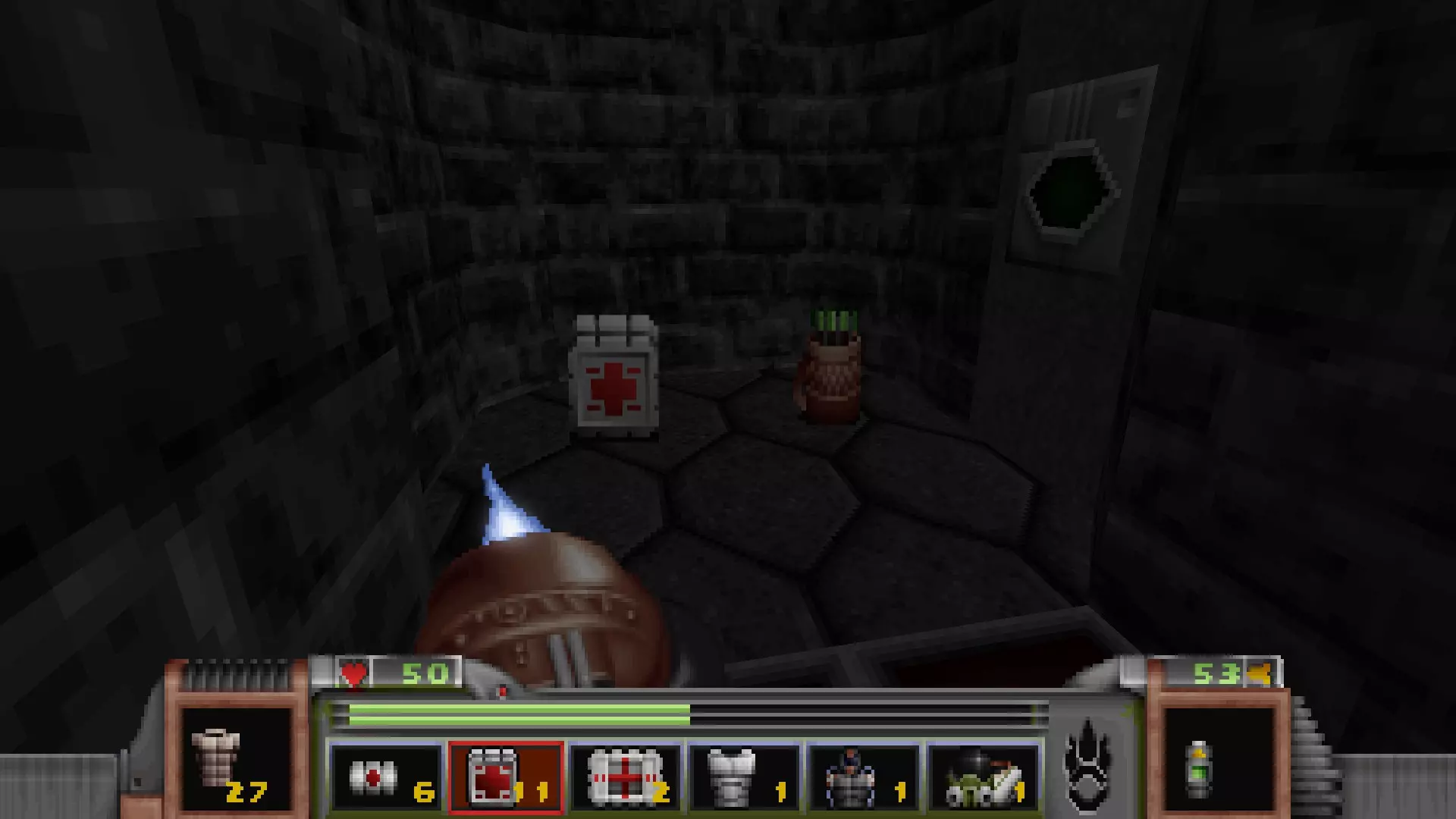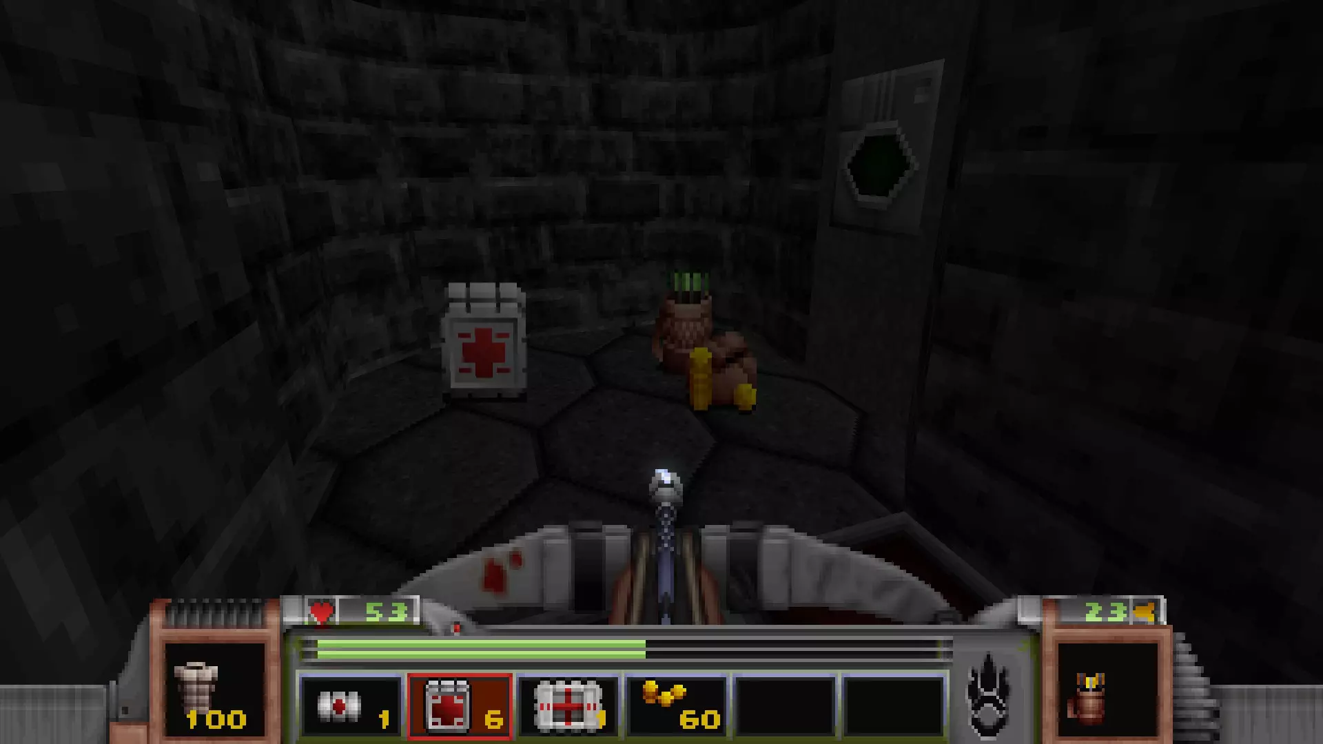 在转换室大致对称的位置,一根金属柱已移开,露出了管道系统。你会被一个棕色方块挡住,但对着它按使用键会使其降下,从而进入后方的走廊。 进入走廊,向秘密区域前进。途中有两个医疗包作为额外奖励。