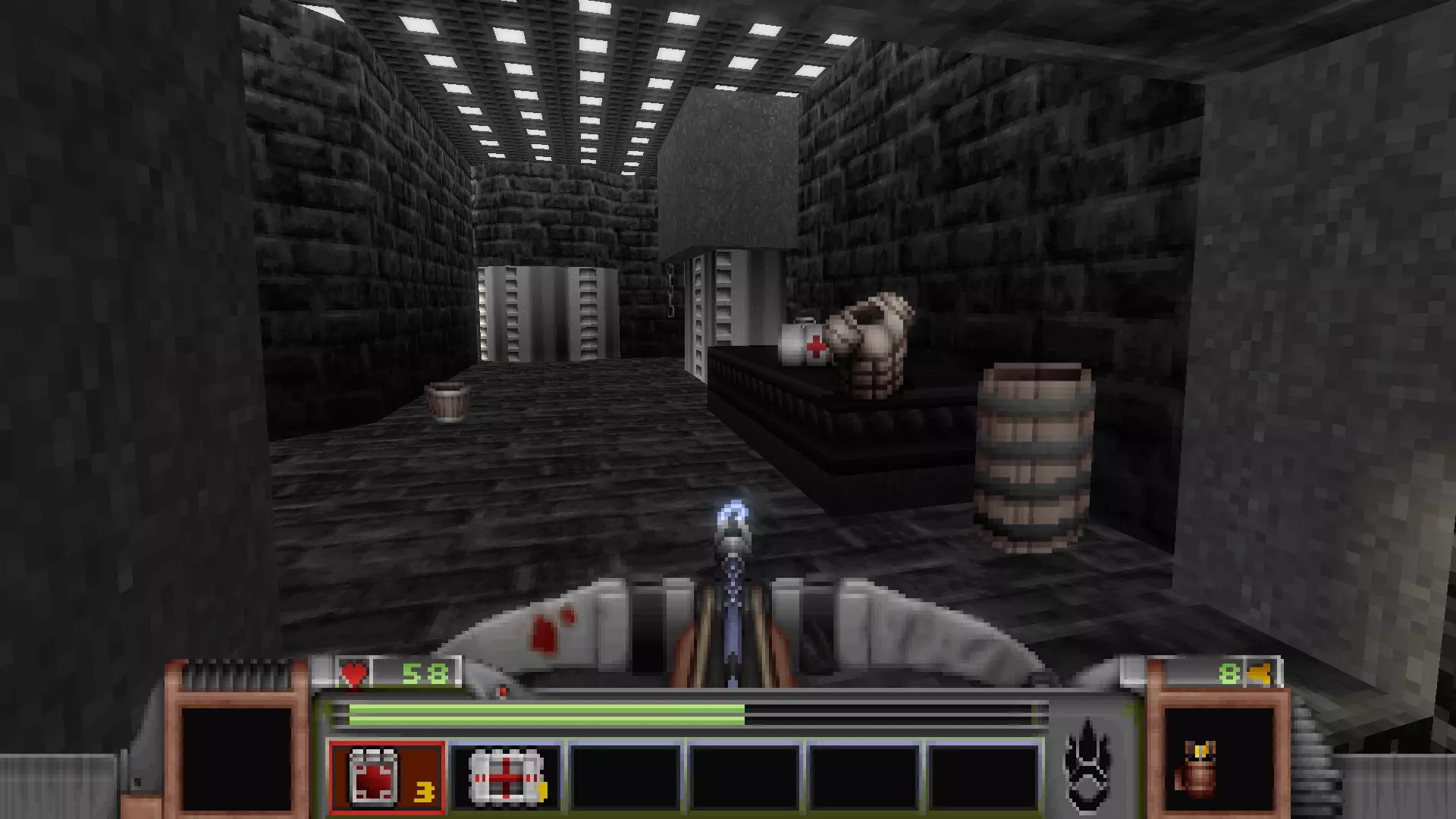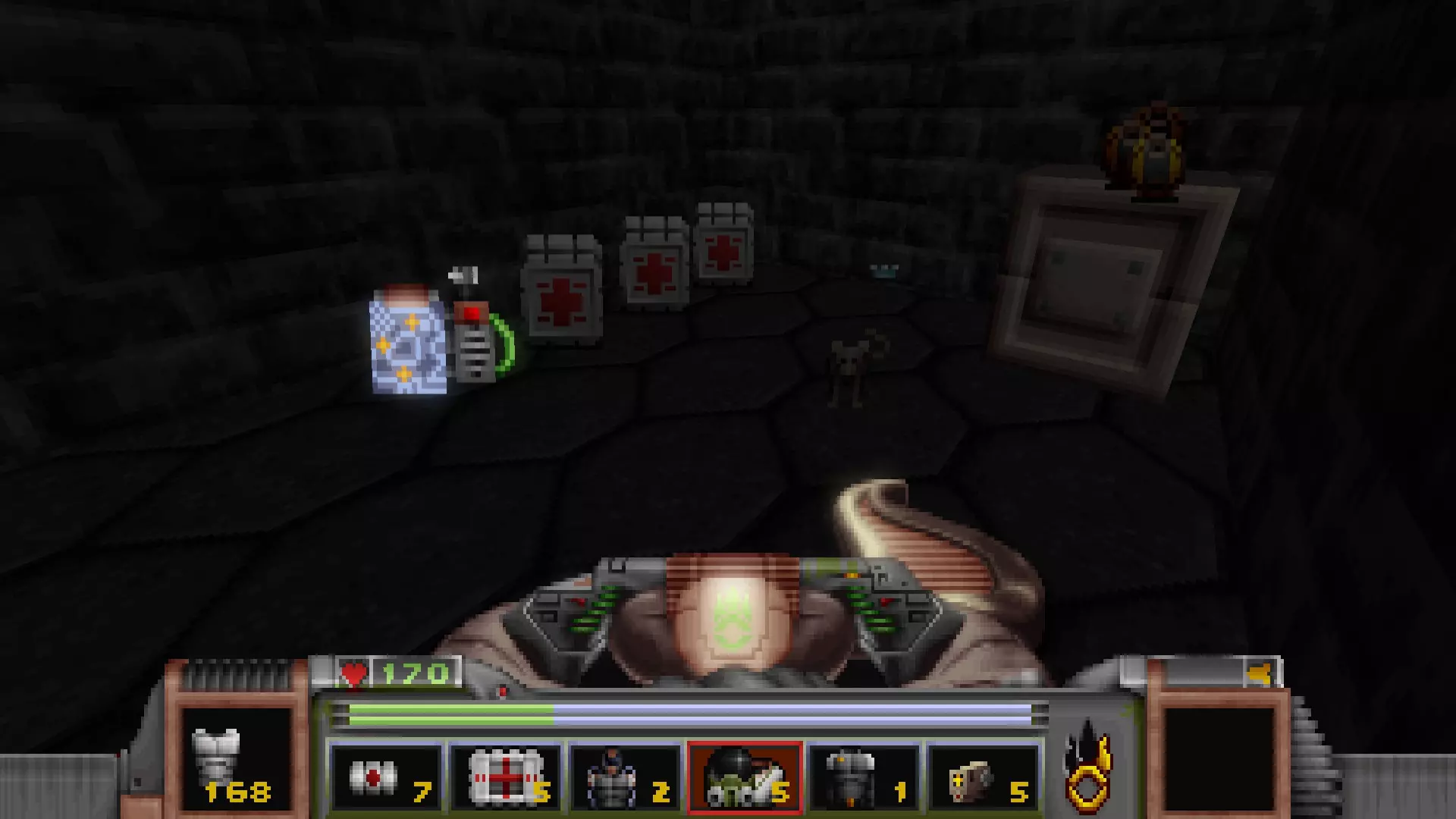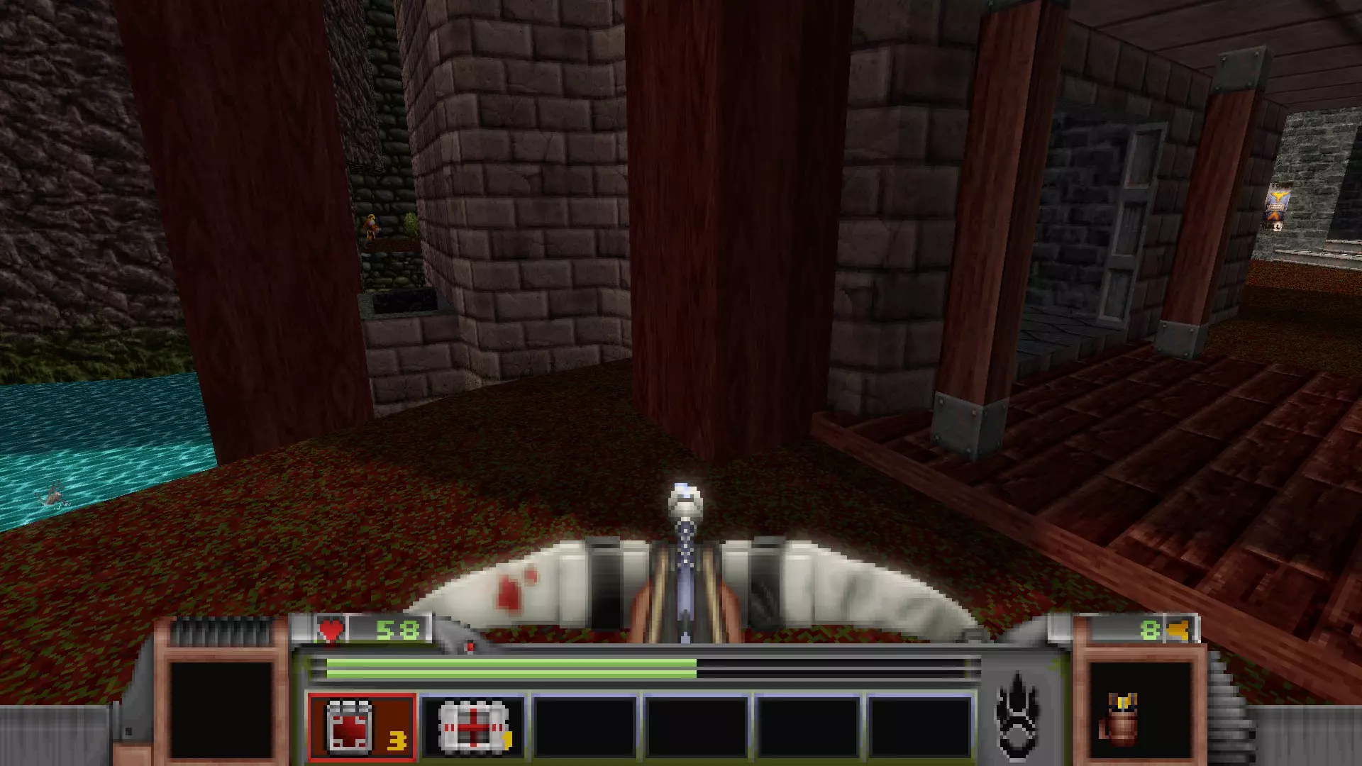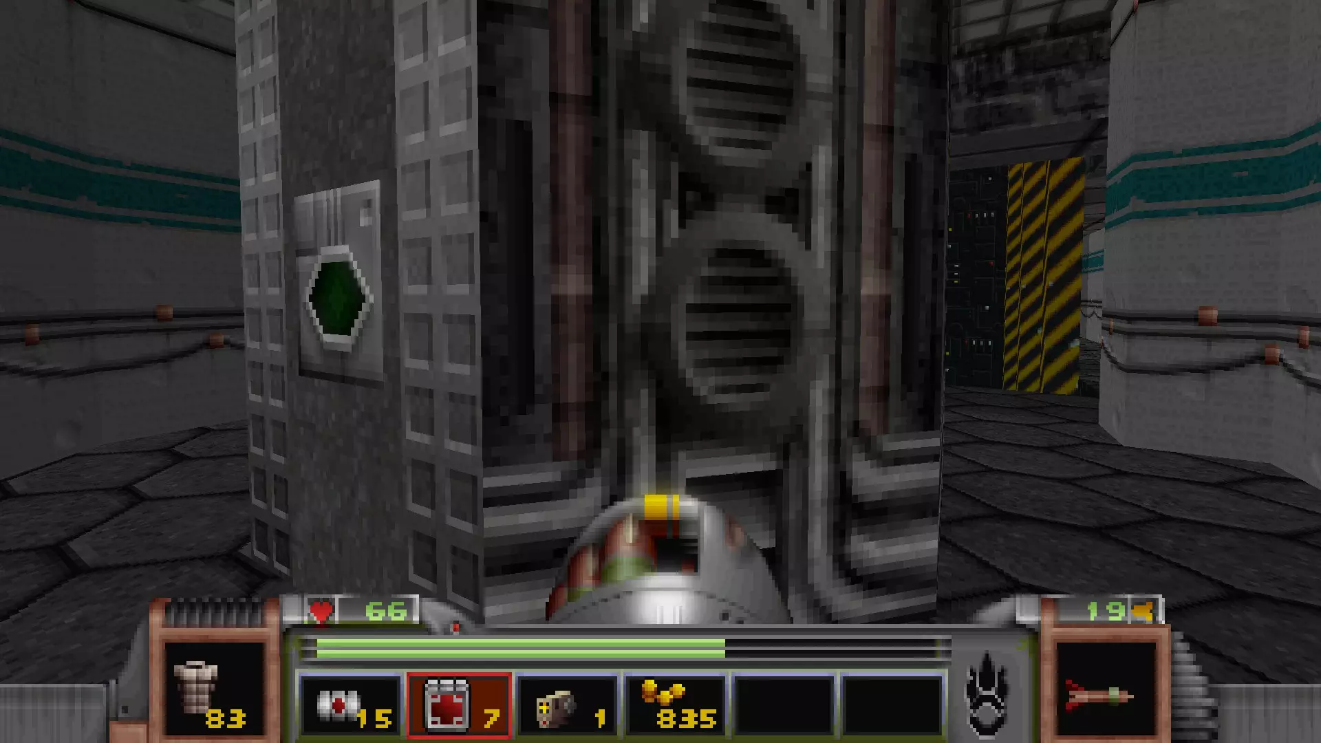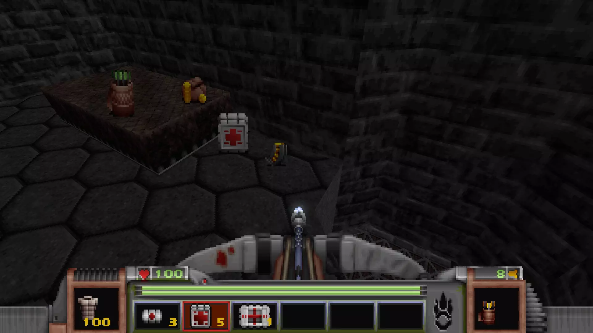 在转换室大致对称的位置,一根金属柱已移开,露出了管道系统。你会被一个棕色方块挡住,但对着它按使用键会使其降下,从而进入后方的走廊。 进入走廊,向秘密区域前进。途中有两个医疗包作为额外奖励。