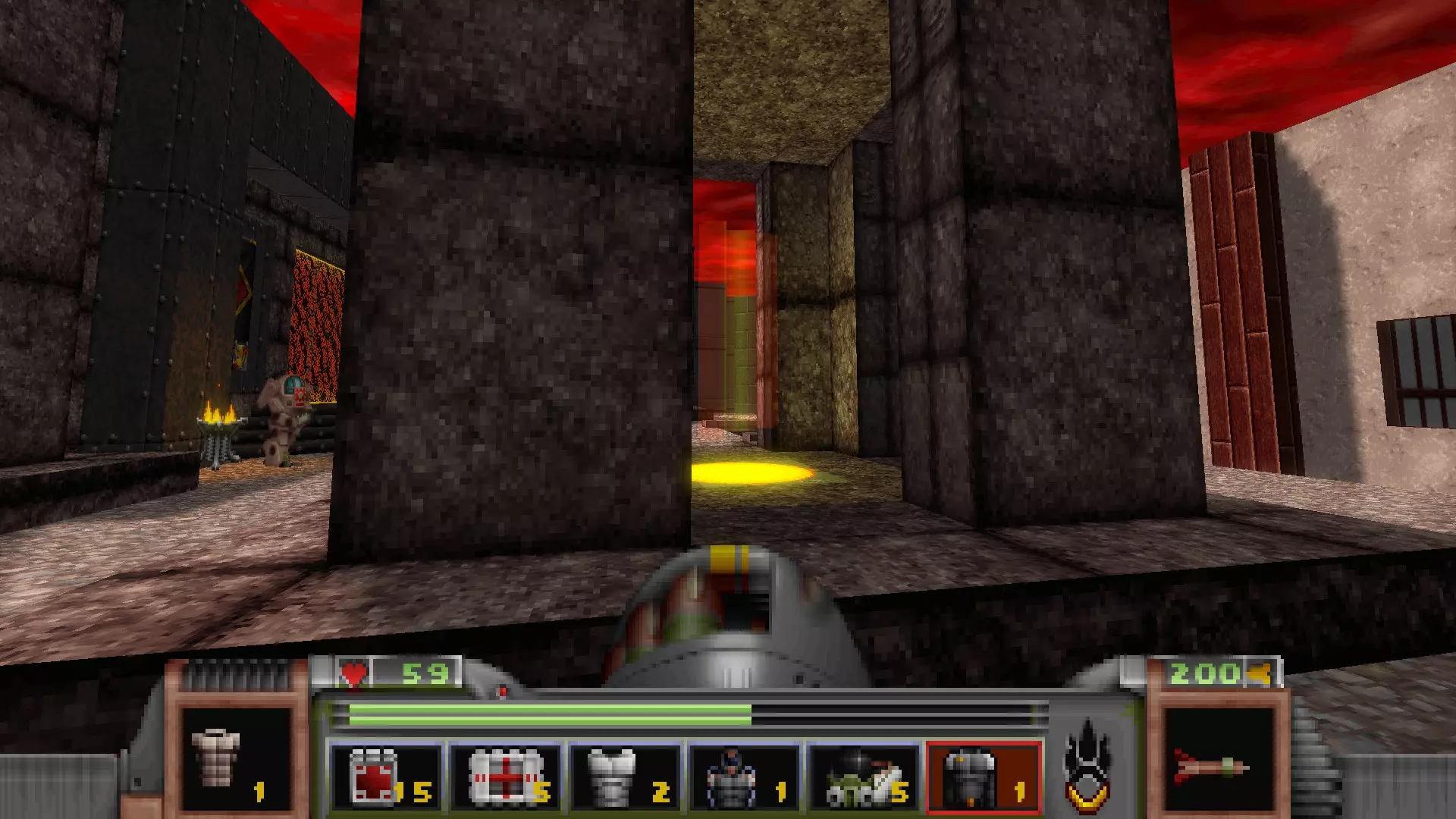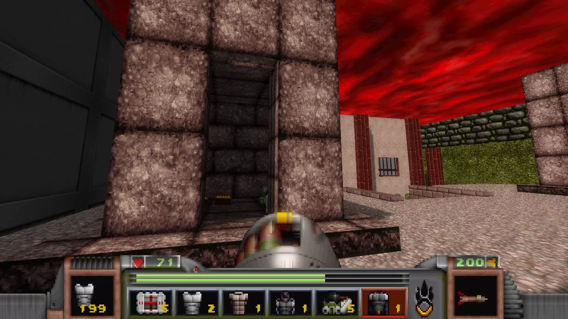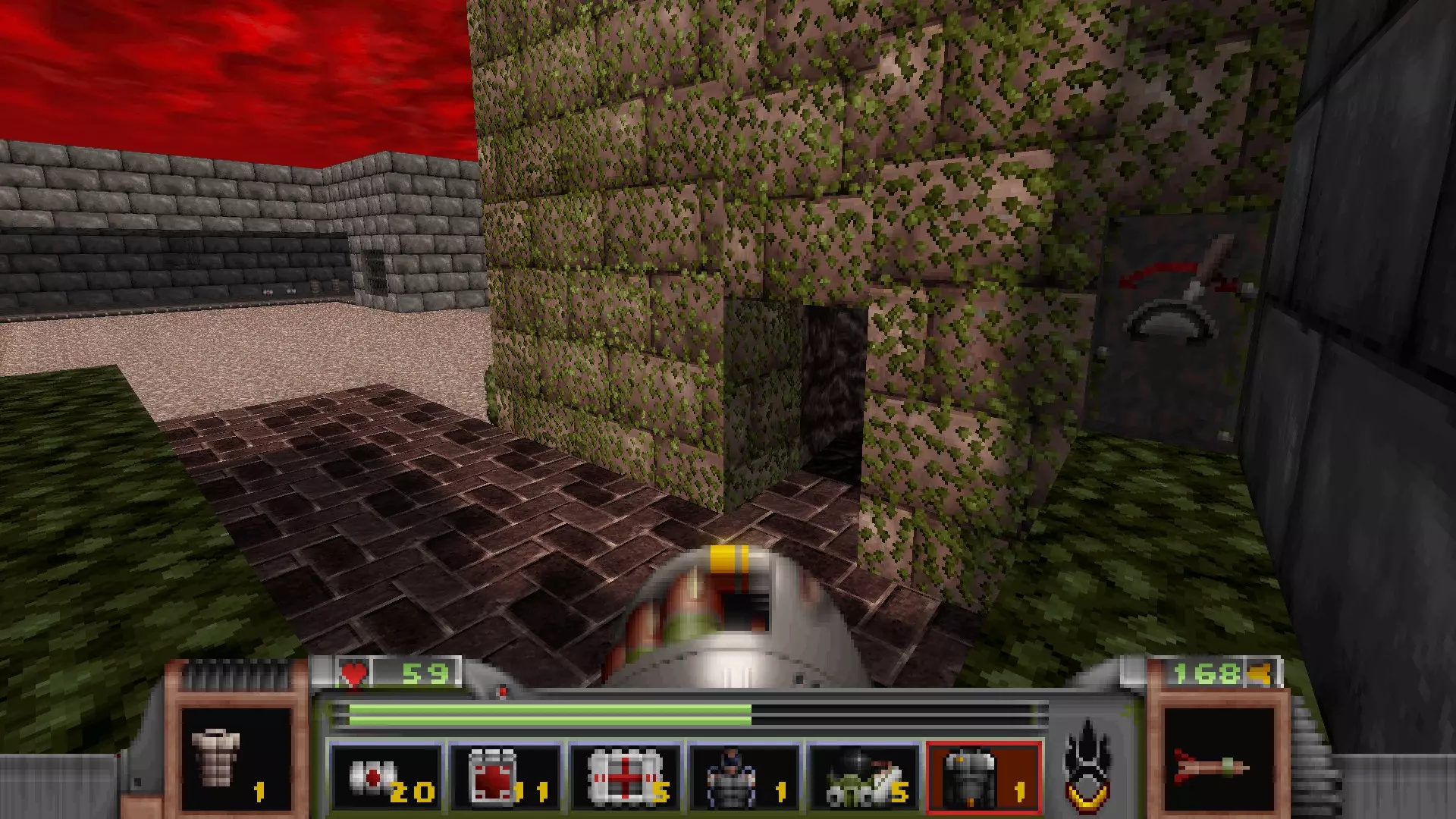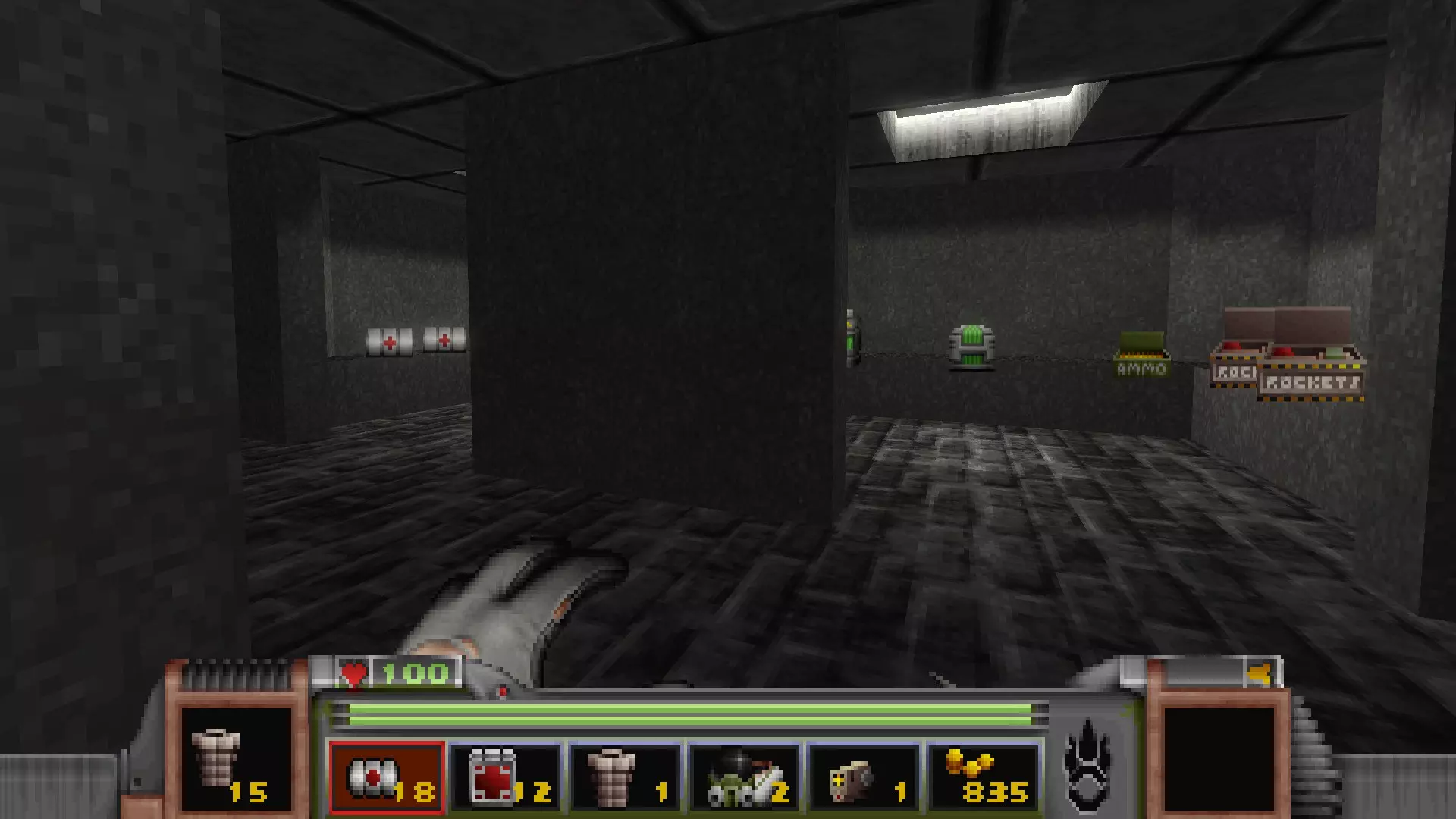在地图的东北角,有一个小房间,里面有弹药、金属护甲和医疗包。 按下那里的开关,出去后跳下去,就能打开房间中央的巨大门扉。