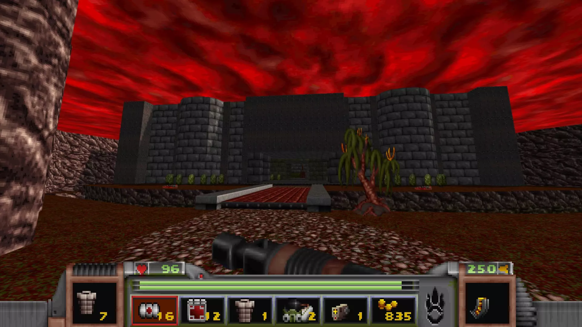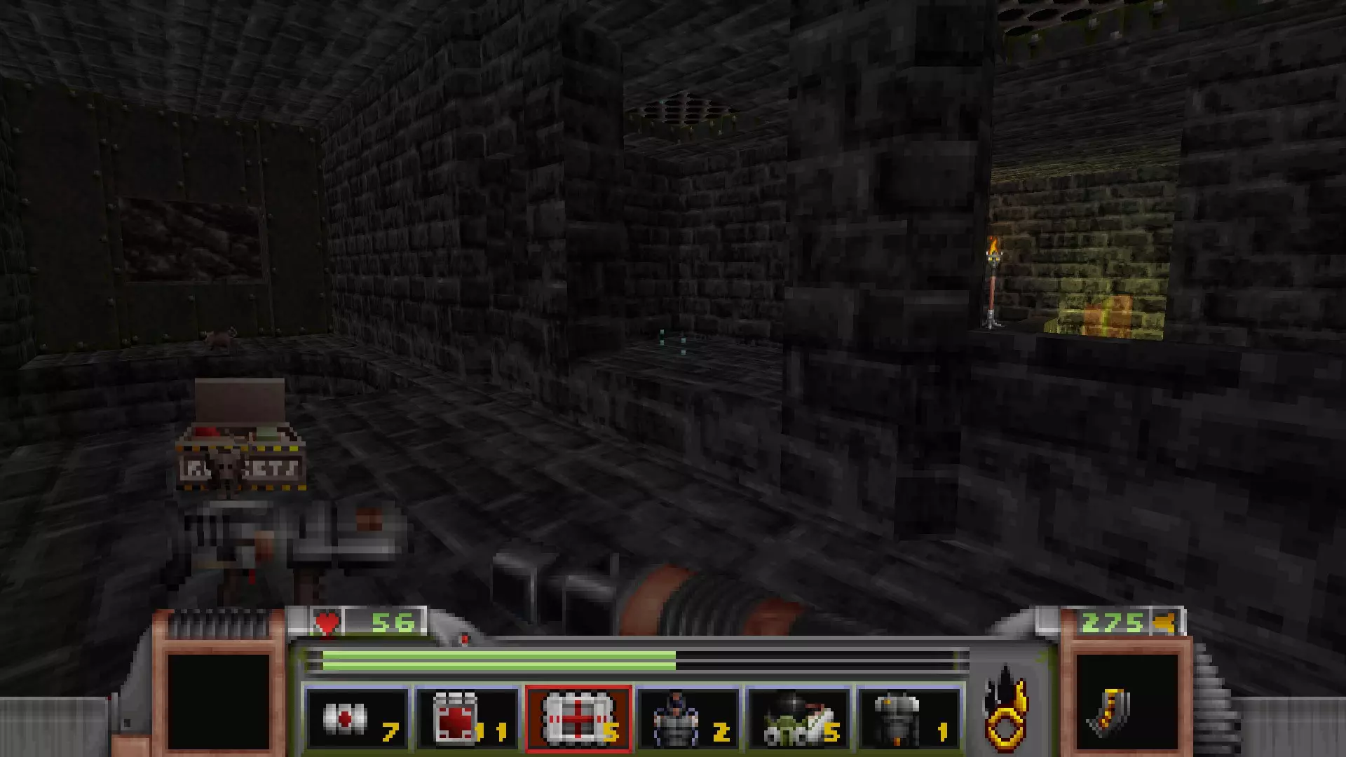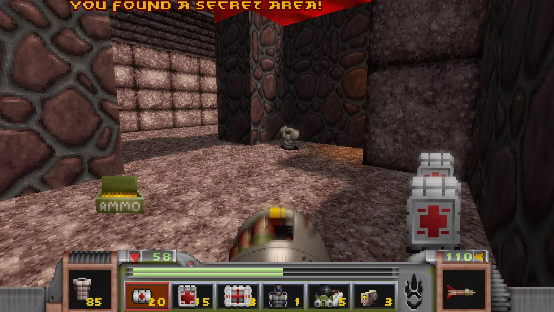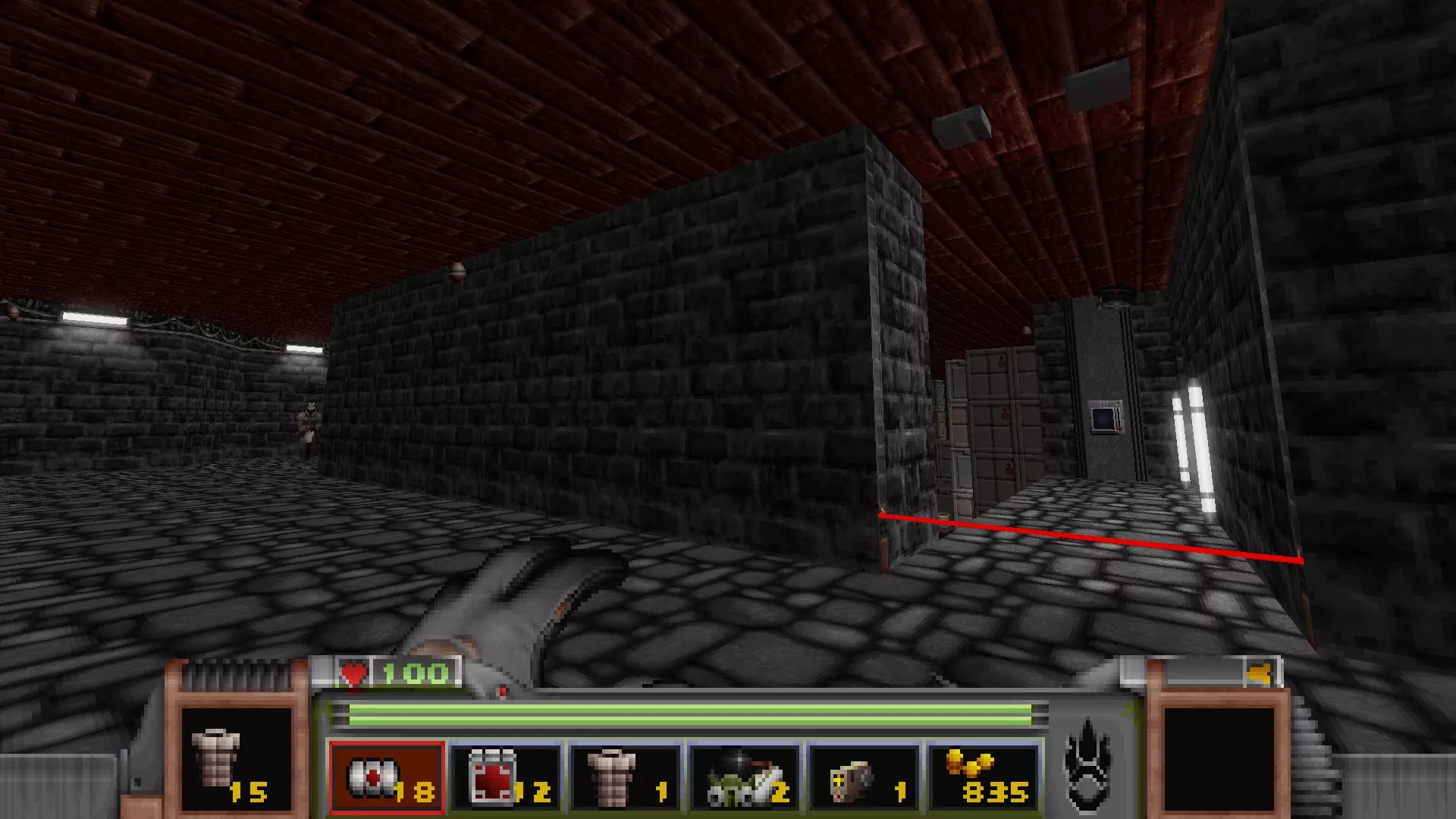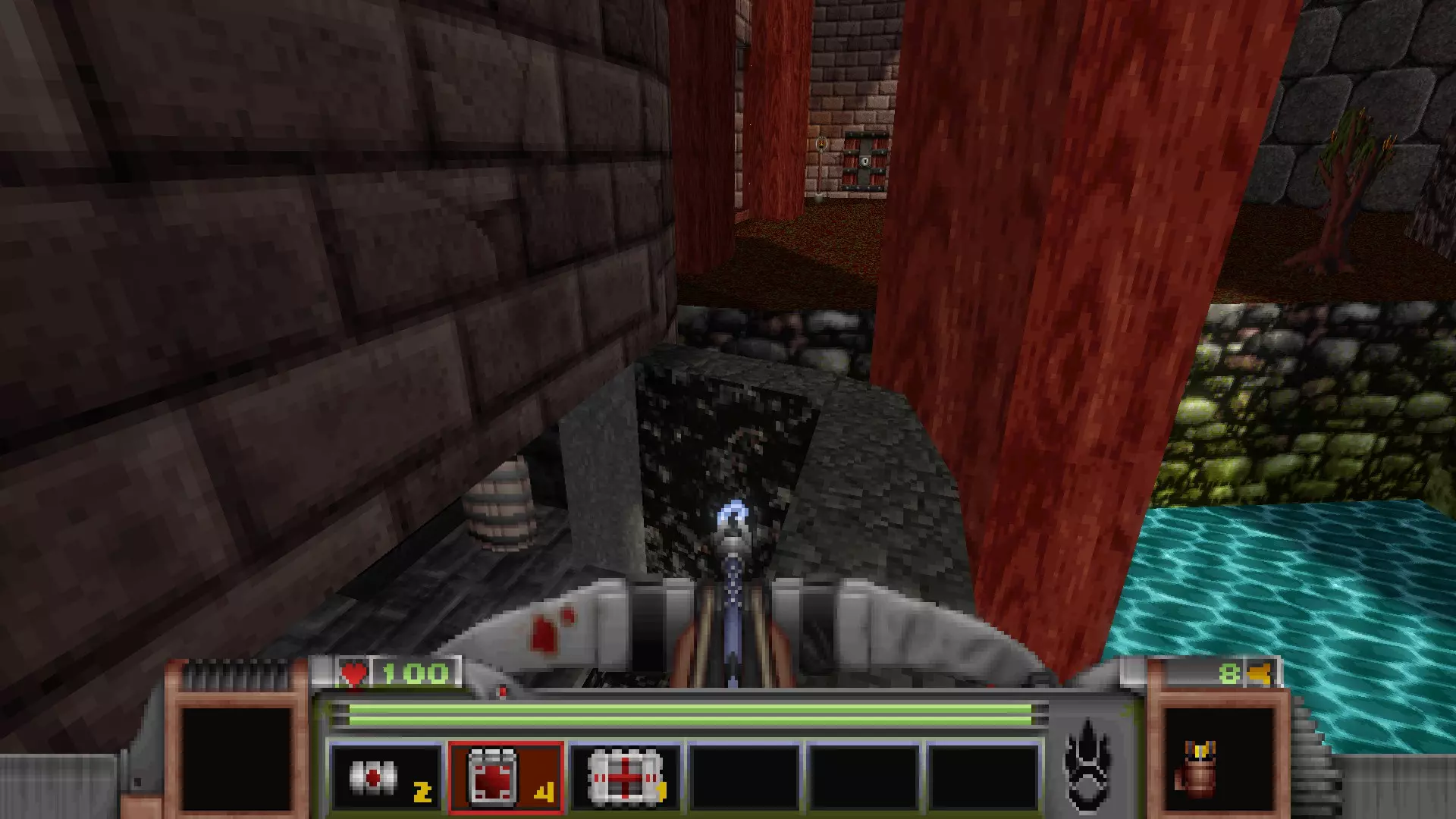 在地图的东北角,有一个小房间,里面有弹药、金属护甲和医疗包。 按下那里的开关,出去后跳下去,就能打开房间中央的巨大门扉。