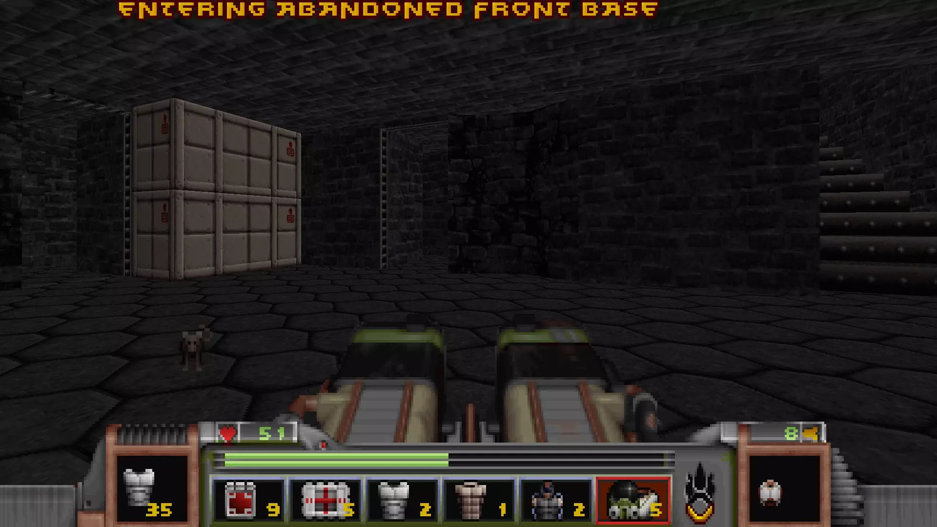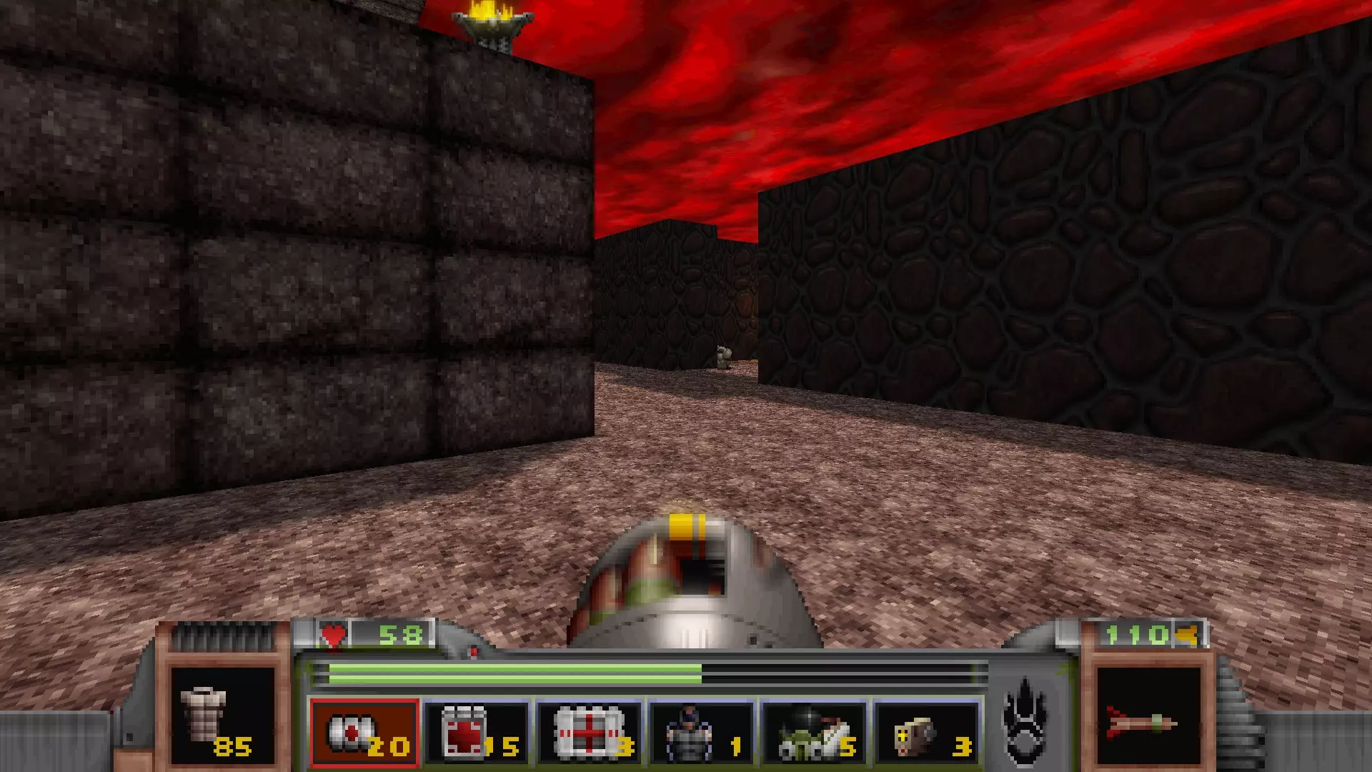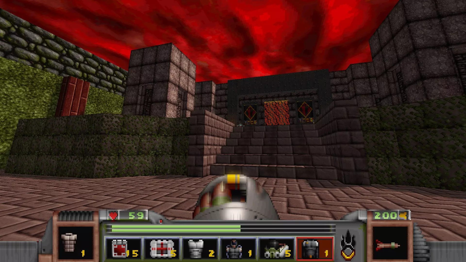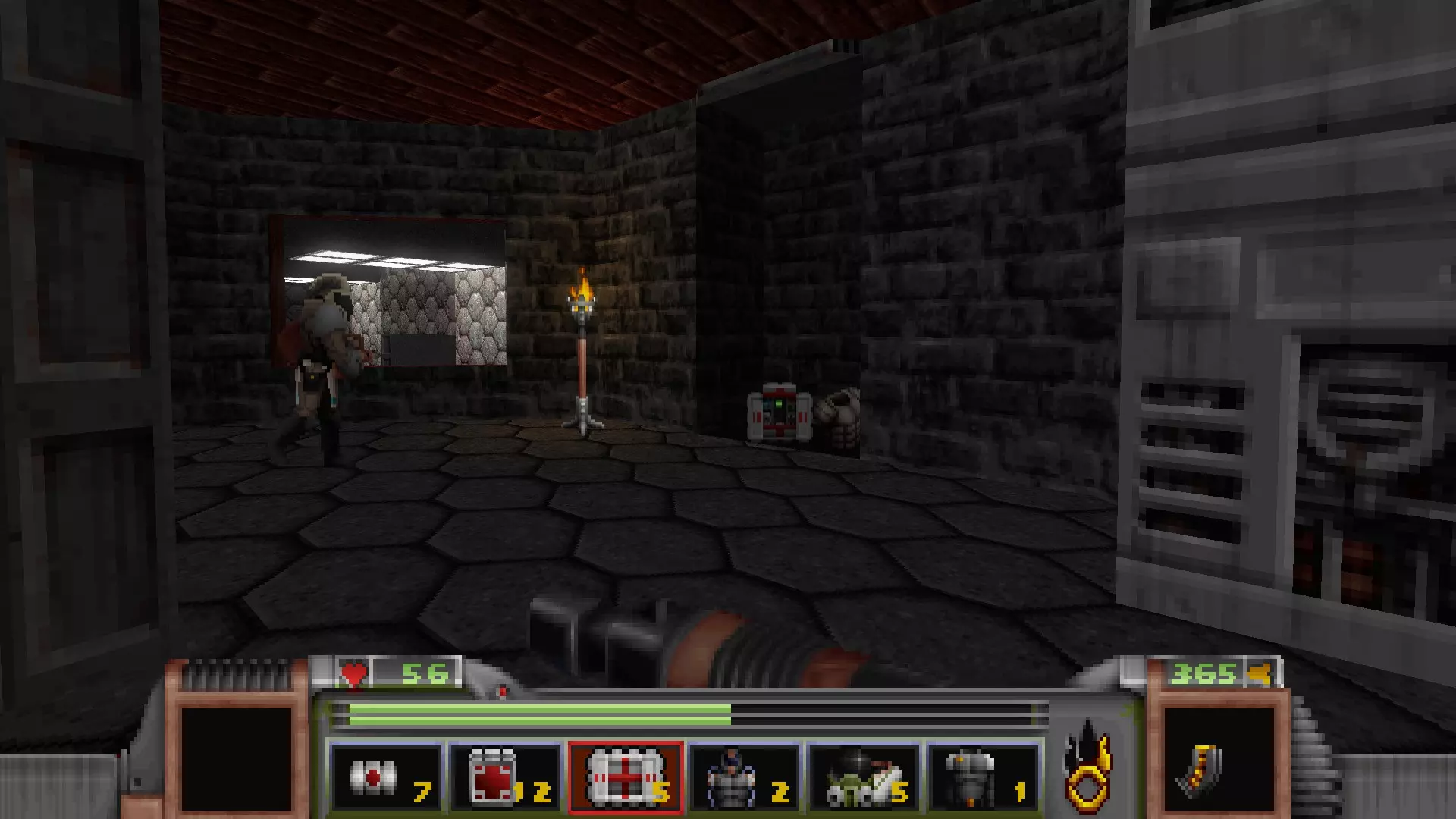 在地图的东北角,有一个小房间,里面有弹药、金属护甲和医疗包。 按下那里的开关,出去后跳下去,就能打开房间中央的巨大门扉。