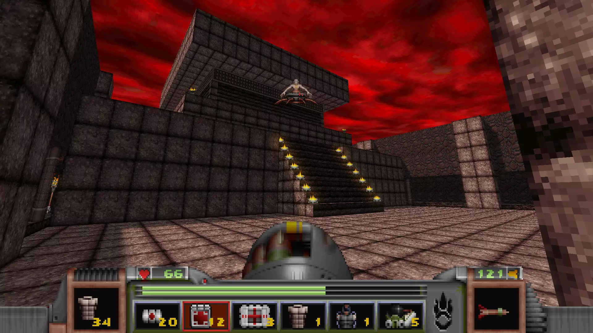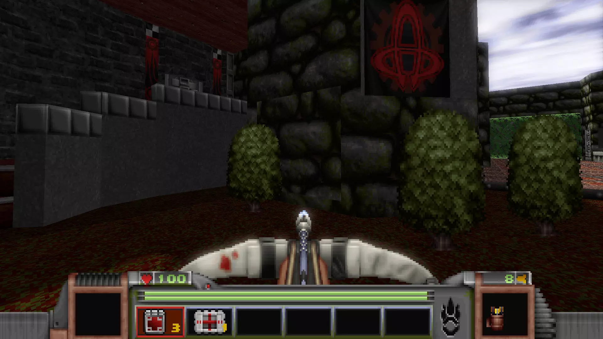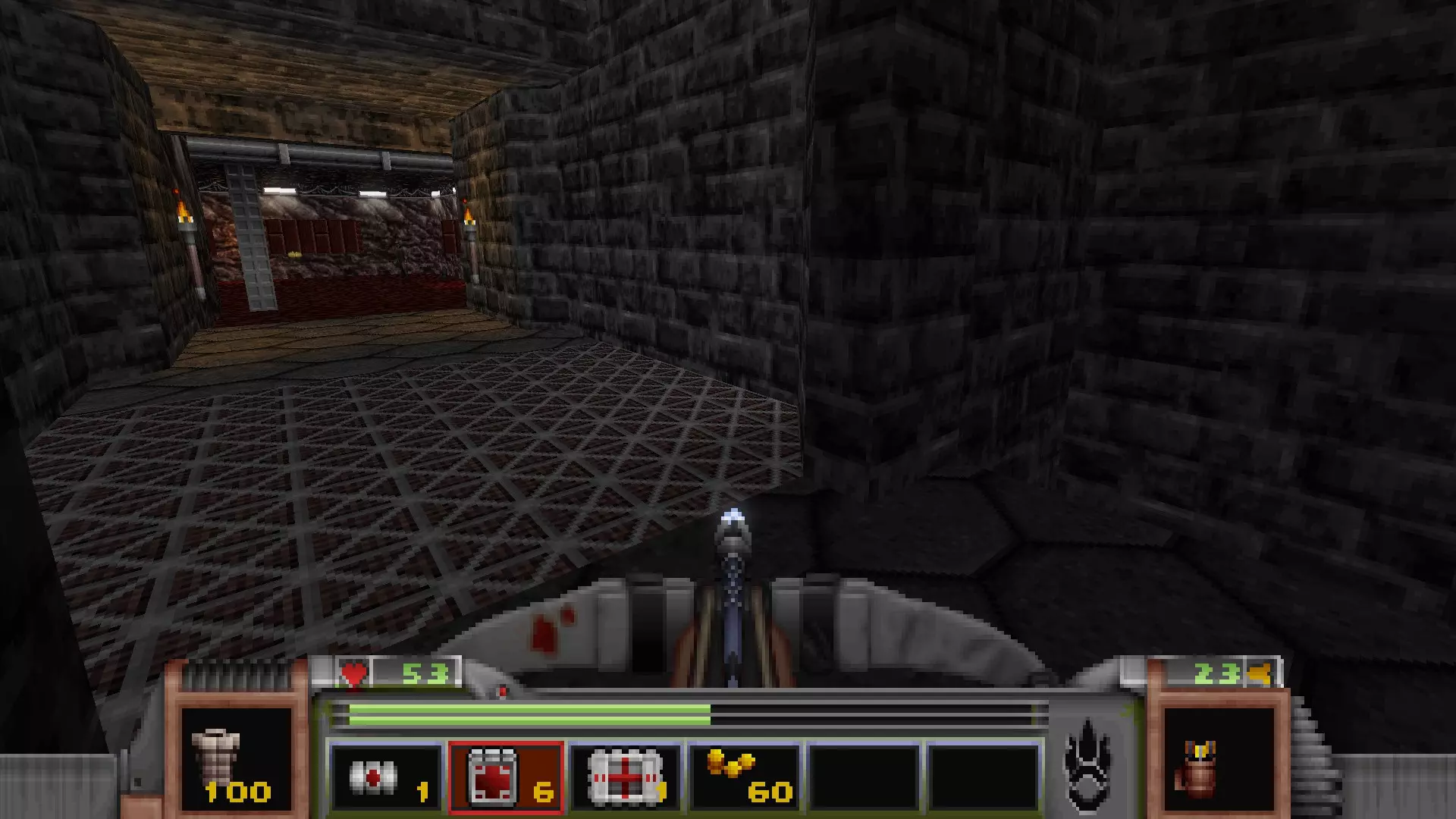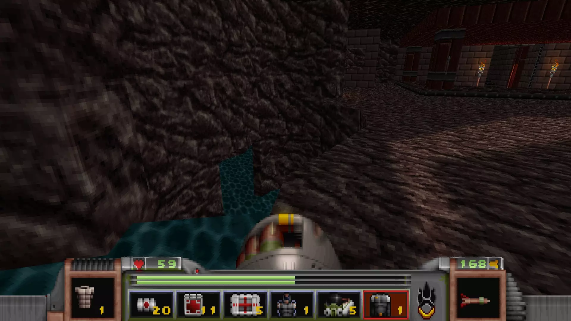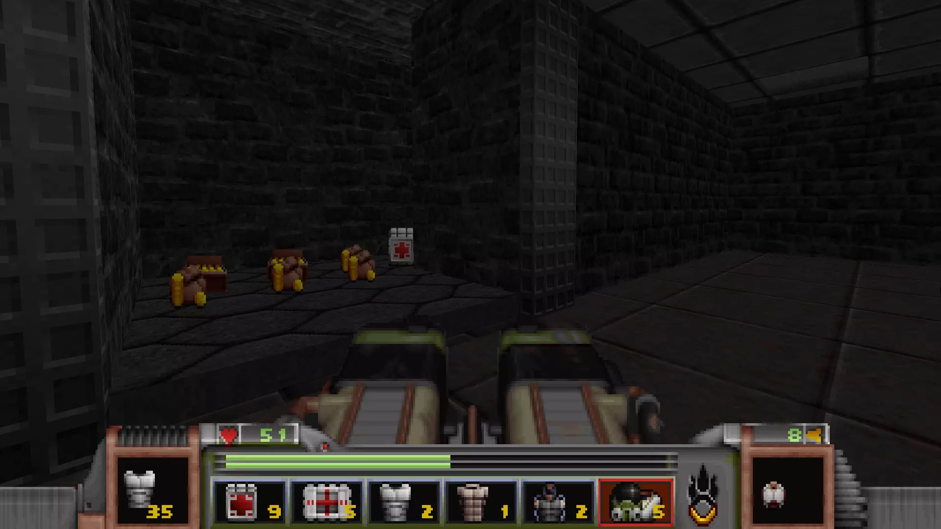 在地图的东北角,有一个小房间,里面有弹药、金属护甲和医疗包。 按下那里的开关,出去后跳下去,就能打开房间中央的巨大门扉。