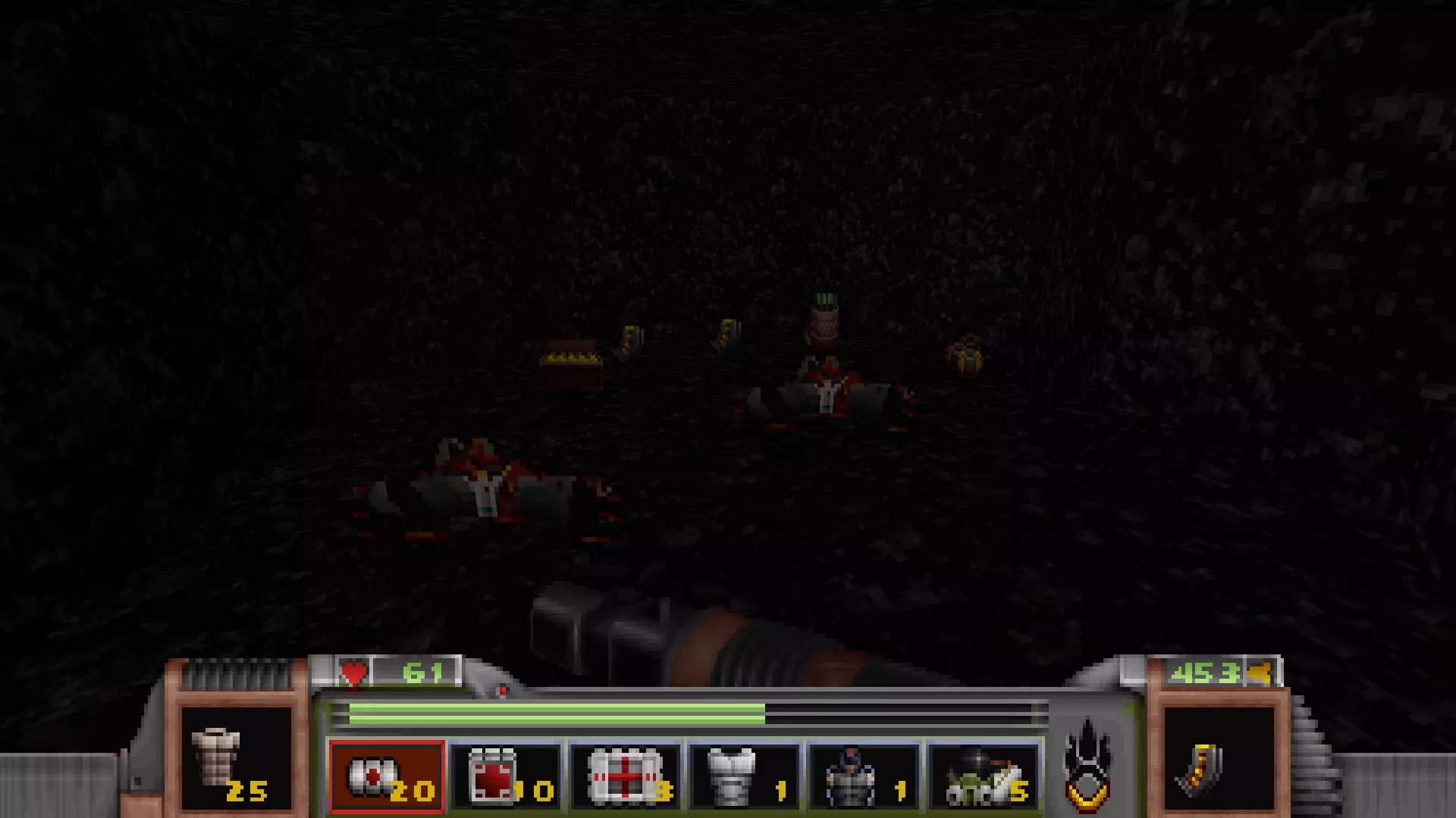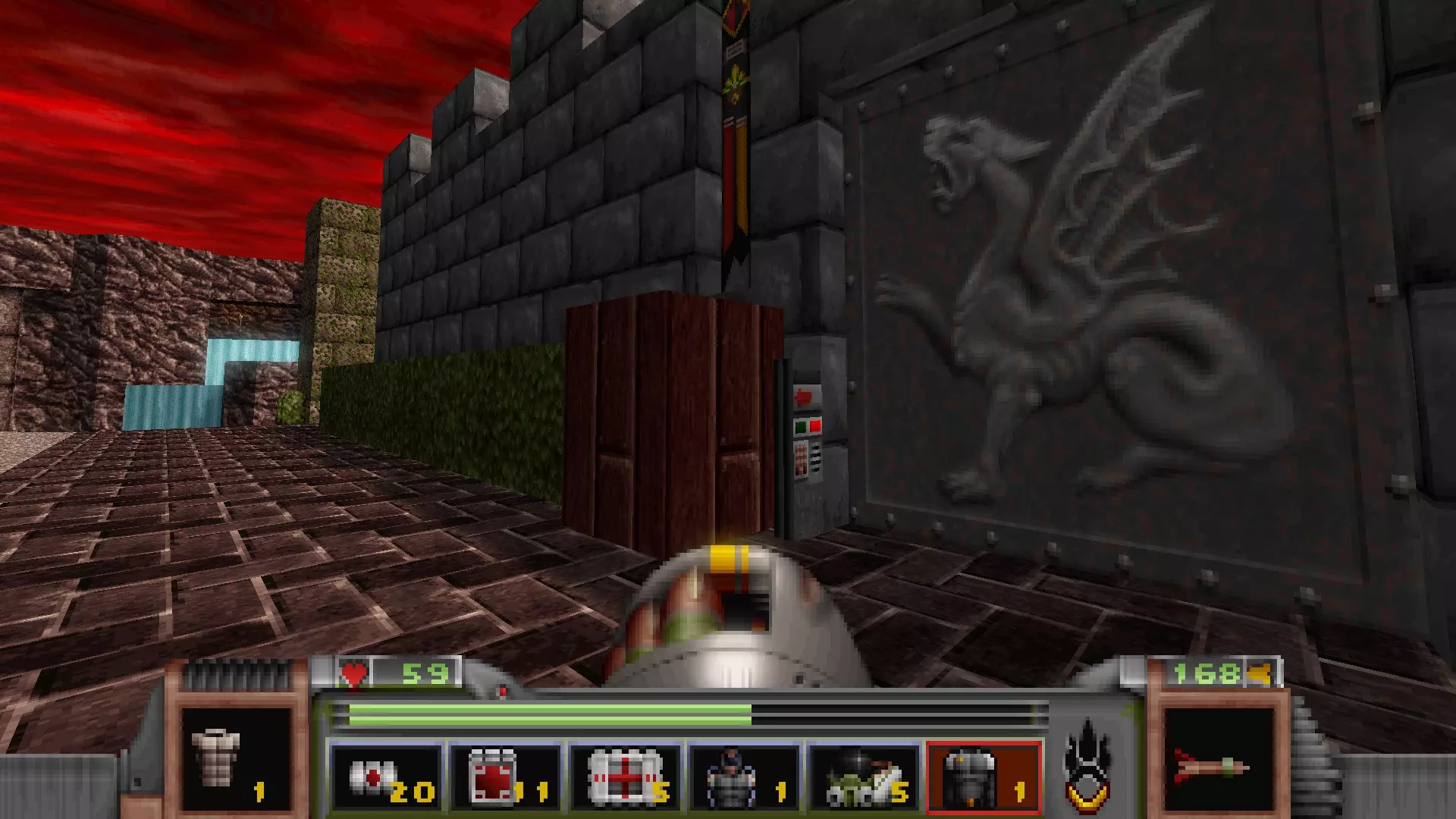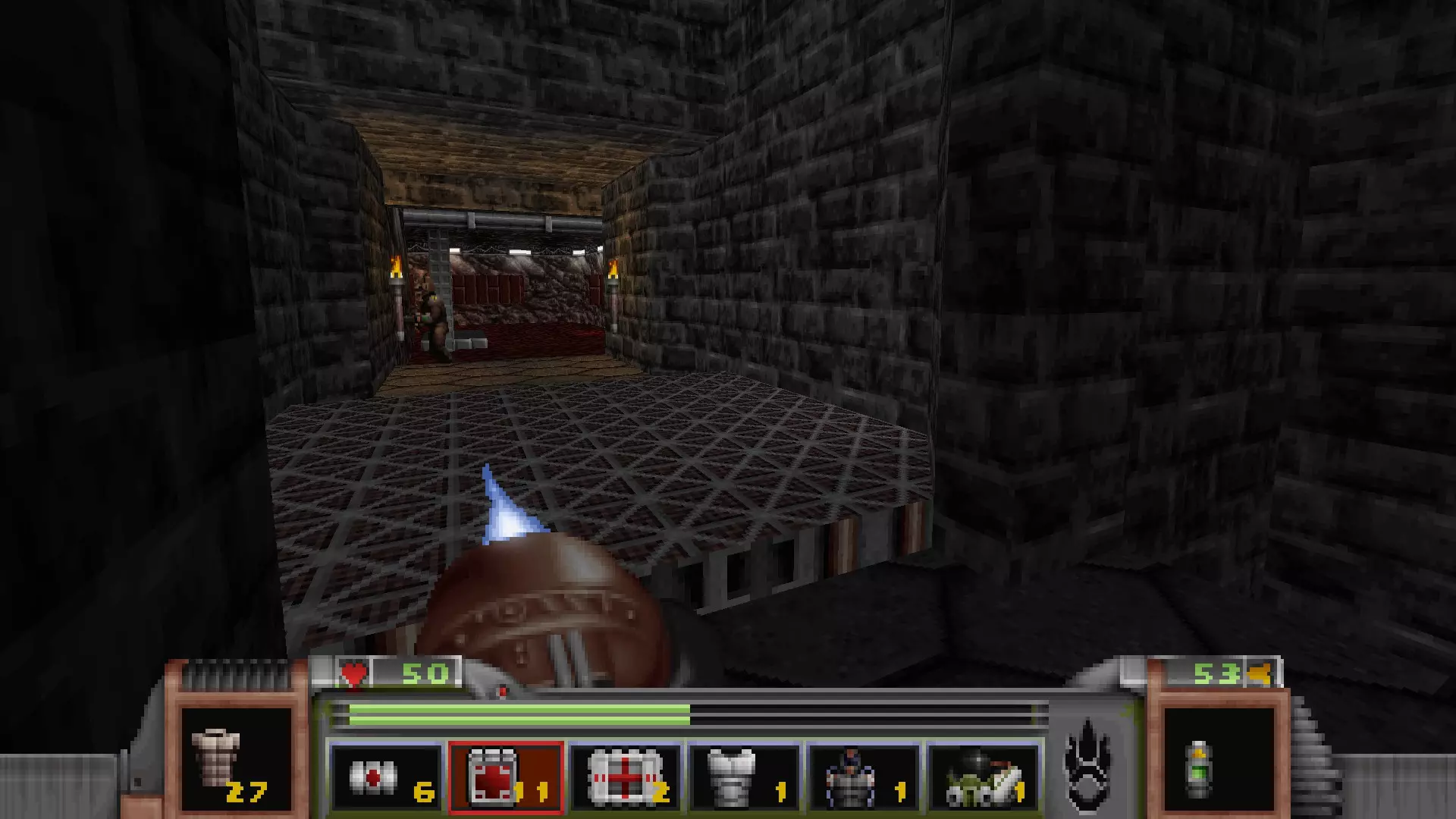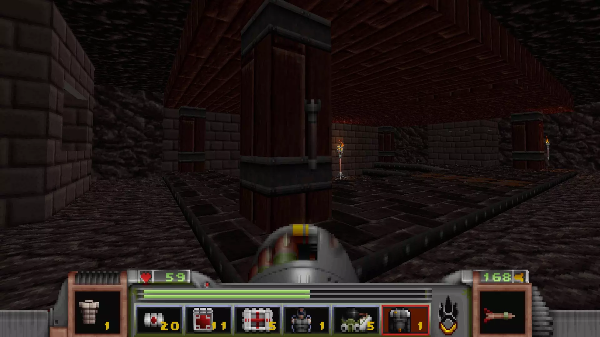 在地图的东北角,有一个小房间,里面有弹药、金属护甲和医疗包。 按下那里的开关,出去后跳下去,就能打开房间中央的巨大门扉。