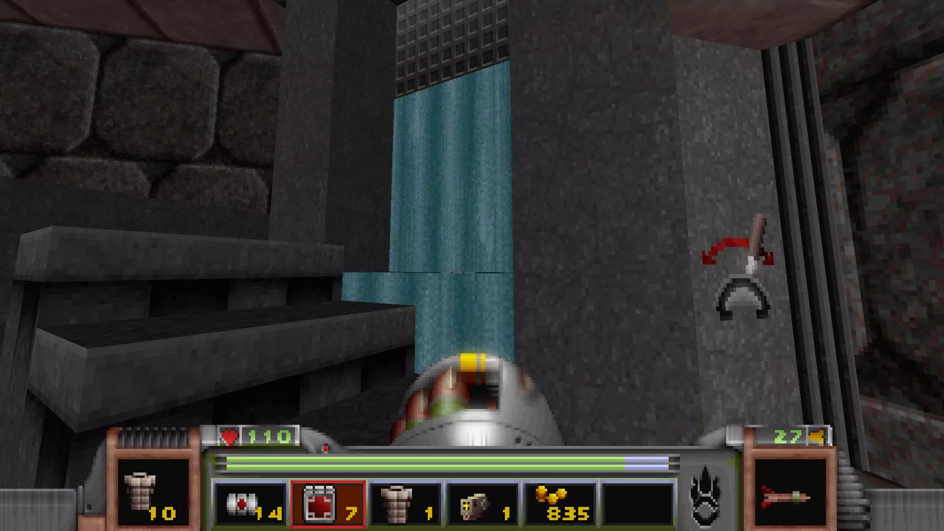 反应堆核心的入口大厅内,南侧角落有两座带瀑布的升降桥。这两座桥都藏有秘密,在触发警报后才能进入。 穿过标有“1”的绿色安全门以触发警报,然后退后一步。此时你两侧的瀑布将会打开,露出其中的秘密和哨兵。