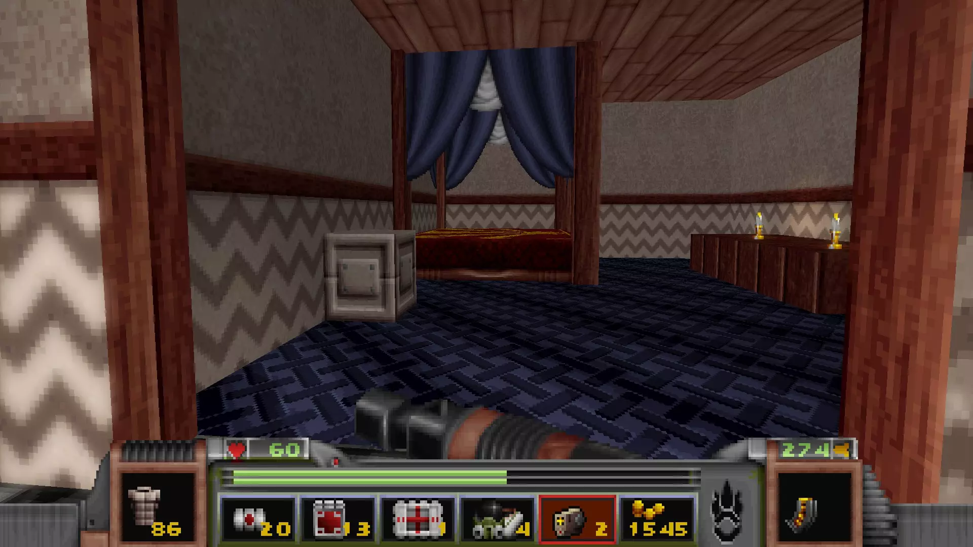 到达内室后,会看到一个装饰华丽的房间,里面有一张特大号床,这张床藏着一个秘密。 如果你跳到床左侧的小木箱上,床的一半就会降下,露出一个小密室。