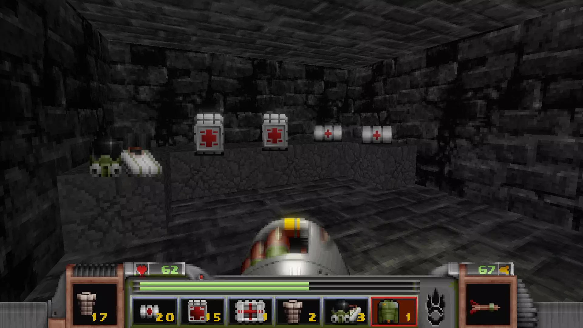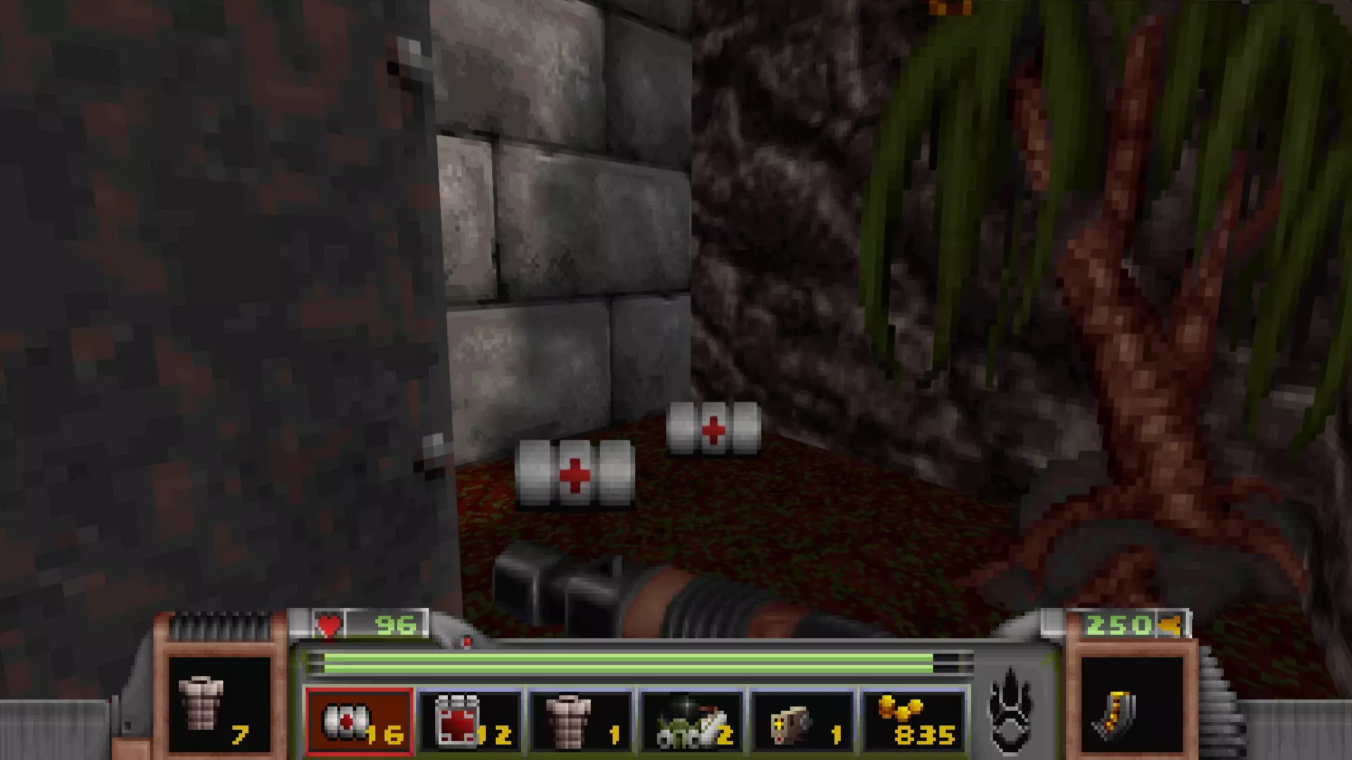 密室中藏有一些医疗物品,这些物品在你整个关卡都要穿行的污水区域会派上用场。 密室包含物品: 环境防护服 医疗包×2 医疗补丁×2 区域?:城堡:程序员要塞 在你按下祭坛后面的骷髅杠杆并走下下降的梯子后,立即进入你左边堆满尸体的洞穴。 一直往下走,你会看到四个小石阶,正对着带你返回上层的台阶。跳到第三个石阶上,利用南侧的墙壁就能找到一些物品。