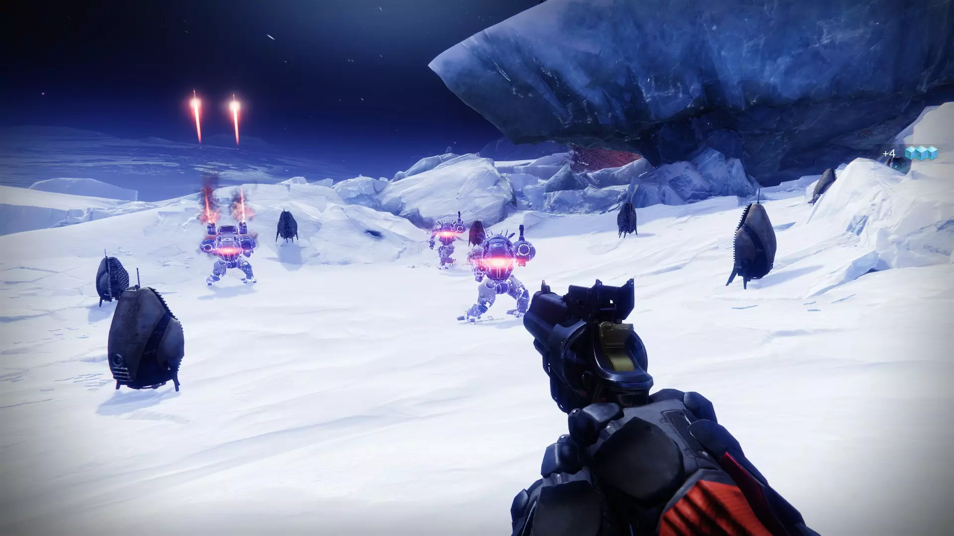 看到那边的气垫船了吗?没错,就是那种装了几门火炮和一个一次性火箭发射器的……这才像样嘛!说实话,我对这种坦克模型并不是很感兴趣,你不会经常遇到它们(在本指南发布时,我知道【战场】模式即将到来)。我们该怎么对付它呢?很简单:射击该单位周围的每个推进器,你就能造成必定暴击,然后把它们打垮!注意那些火箭,它们往往会以类似迫击炮的弧线飞行;还有顶部那门巨大的火炮,能轻易把你轰成渣(向侧面闪避,就能安然无恙)。 5. 拦截机