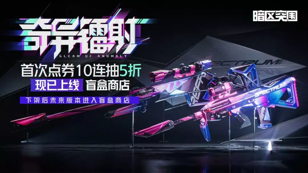 「奇异镭射」盲盒商店包含【奇异镭射·AX50】&【奇异镭射·AUG】等全新枪械涂装,首次点券10连抽5折,下架后未来版本进入每日商店。