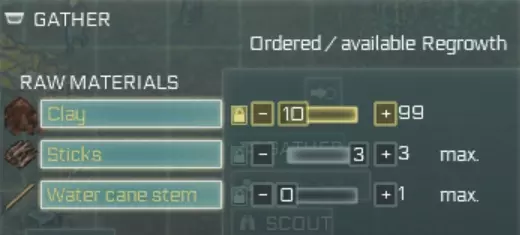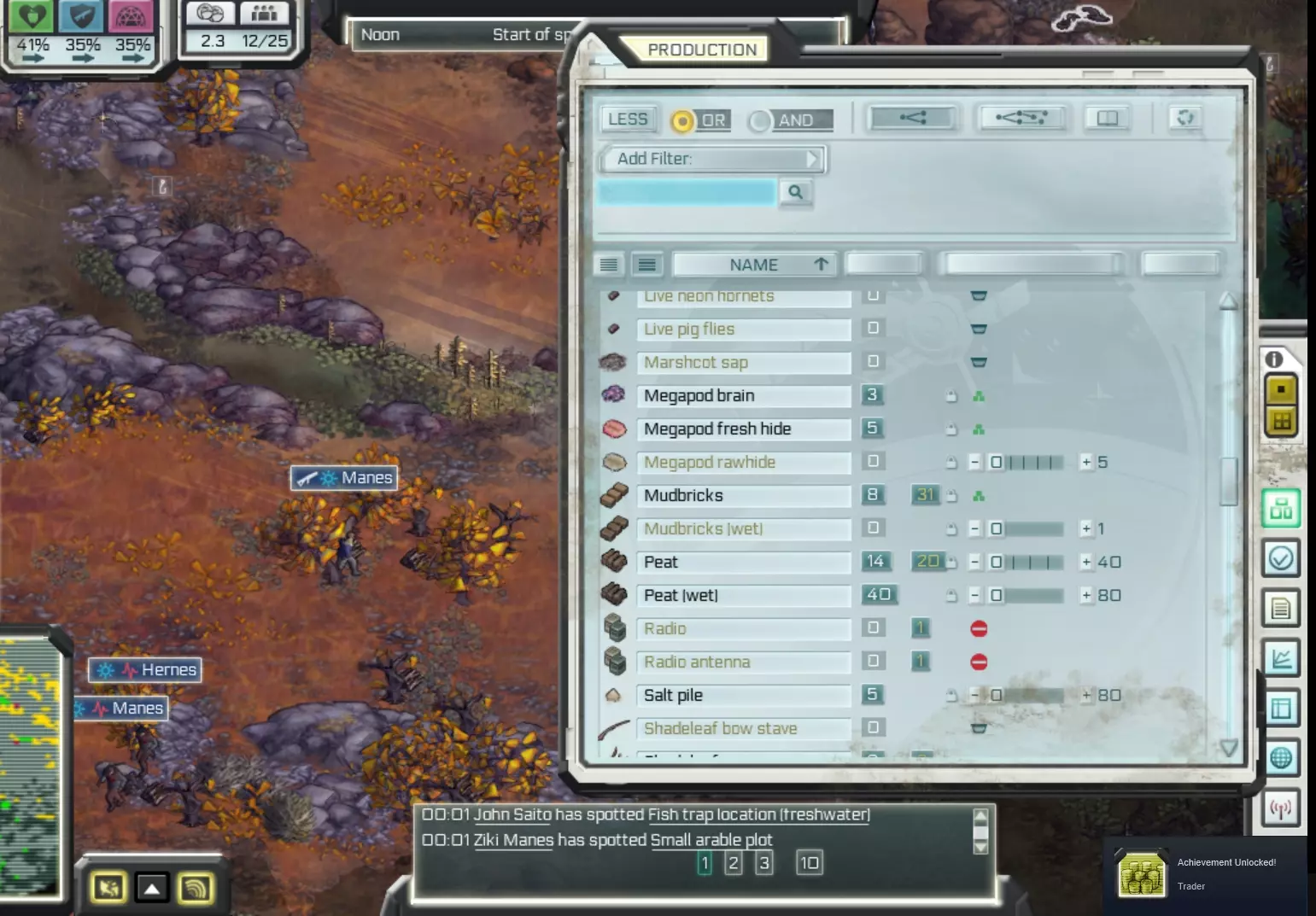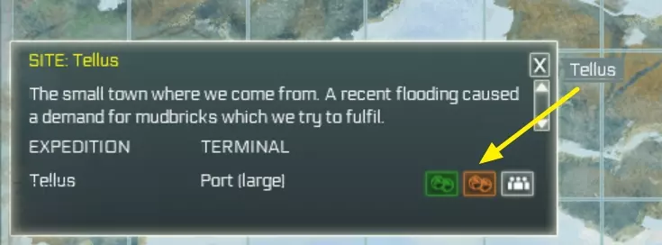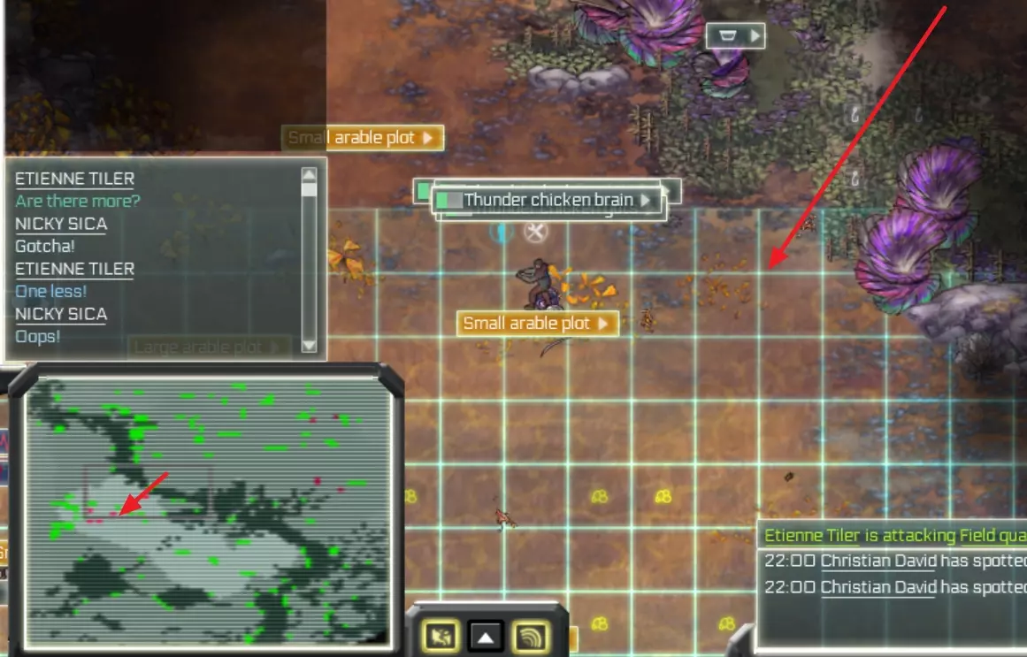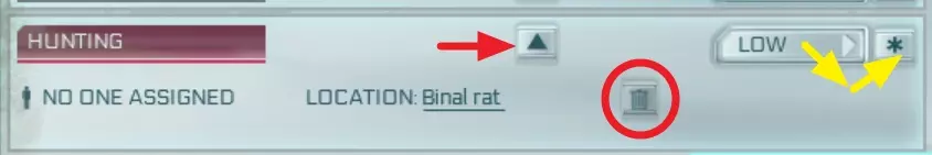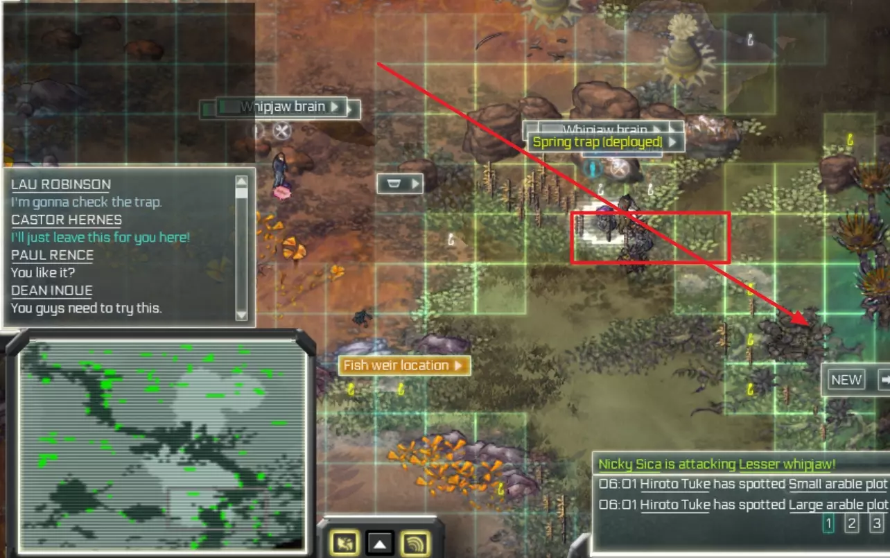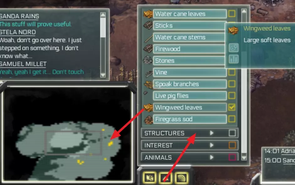 你可以通过点击星号为所有相同的任务设置优先级。(在我的示例中,我会将所有狩猎任务设为低优先级,如黄色箭头所示) 如果发现即使将任务设为高优先级也未执行,请确保任务执行地点已储备所需材料。例如,建造渔网时:需在工作台储备绳子和树脂。 如果某个建筑无法建造,请检查材料是否处于【现场】状态,而非【库存】状态。 如果掉落的物品妨碍建筑施工,查看物品是什么,通过贸易界面(港口或直升机停机坪)将该物品设为待售,殖民者会优先处理贸易物品并将其捡起。侦查与小地图筛选:当你侦查过一个区域后,可以使用小地图来寻找所需的材料(例如燧石或特殊树叶),点击此处的向上箭头。