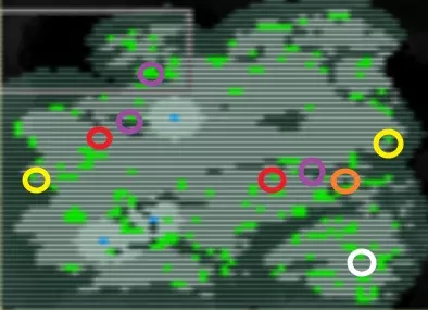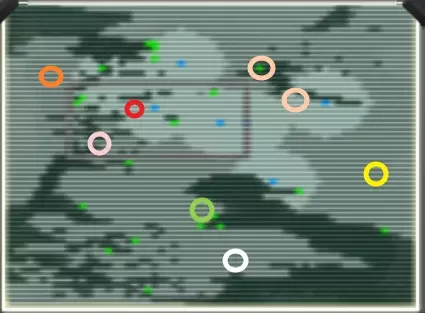 粉色:黏土 红色:港口 黄色:泥炭 黑色:矿石 补充:西北角有盐矿沉积 你会随机在某个港口附近开始游戏。 在我的游戏进程中,我决定从北部的面包森林附近开始,以便提前收集50张鸡皮。 注意,如果你下达过多长期指令,人们会一直处于忙碌状态,你将不得不通过优先级来安排任务,而他们将没有时间把物品搬运到储存点。 -营养- 这张地图有一条斜向的中央河流,西南方向有两个湖泊。 地图中央区域有最多的鱼点位置,但靠近沼泽的河流以及西北侧的河流拥有最多无需使用陷阱即可收集的鱼类食物。河的北岸没有石头,所以如果从那里开始,你可能会难以生起营火,这里有一张石头分布图。