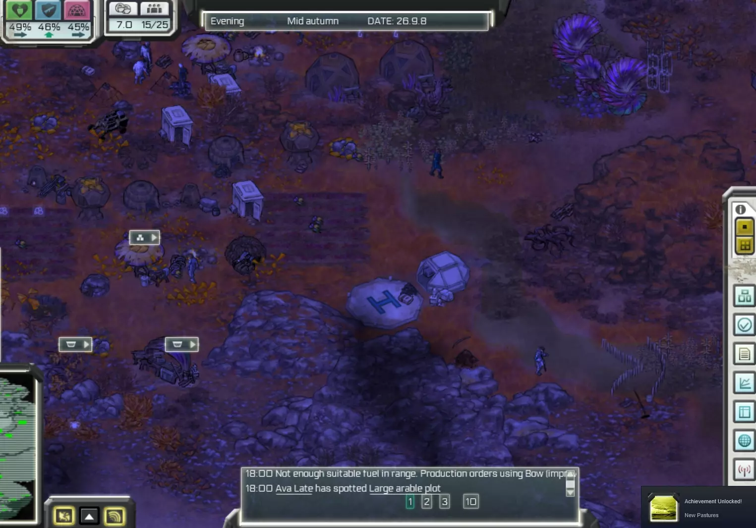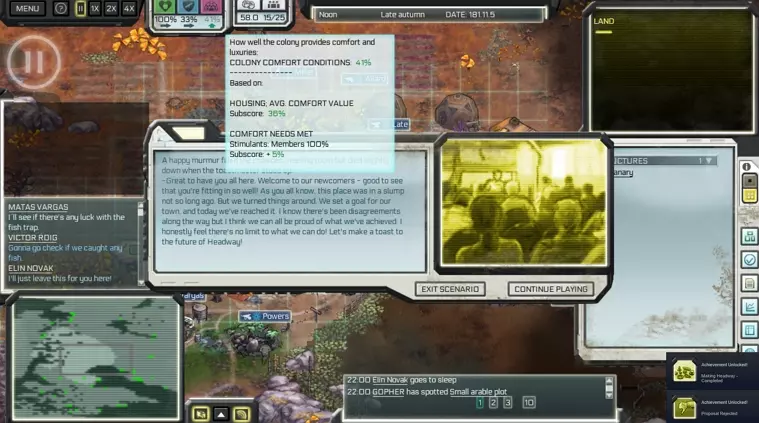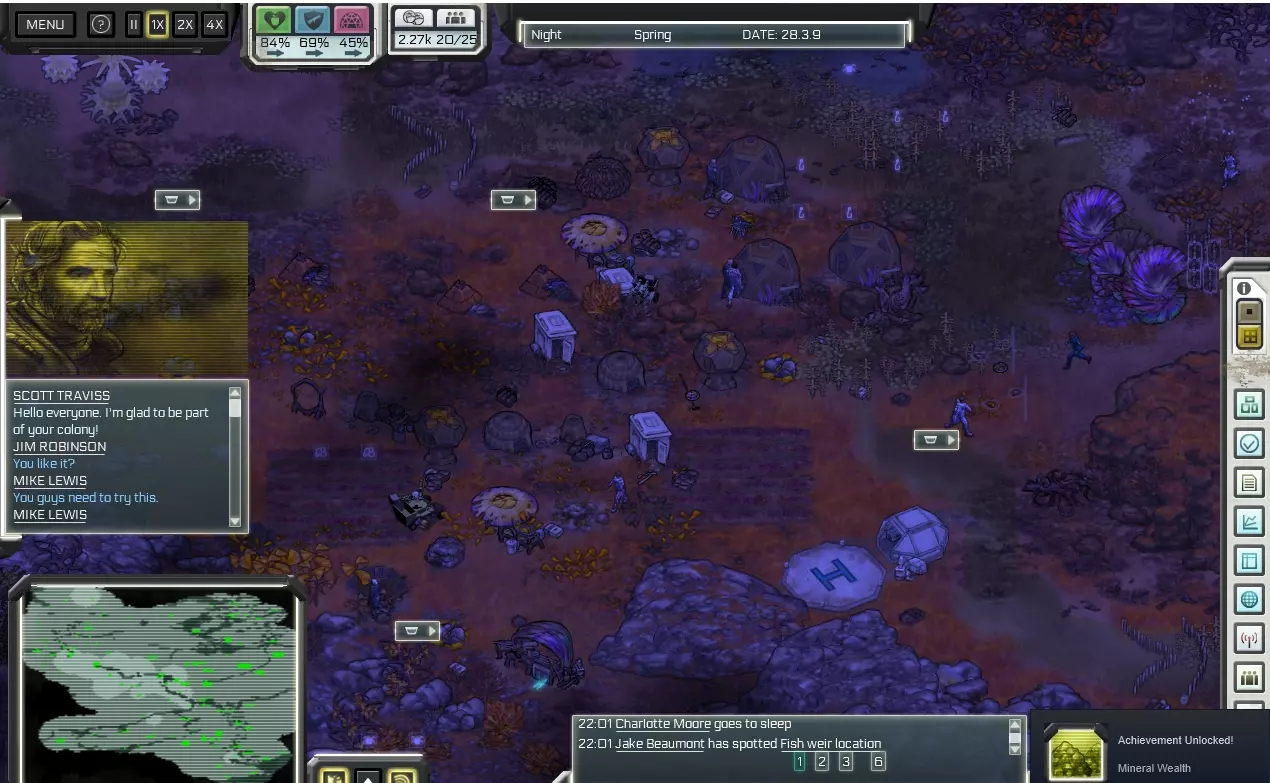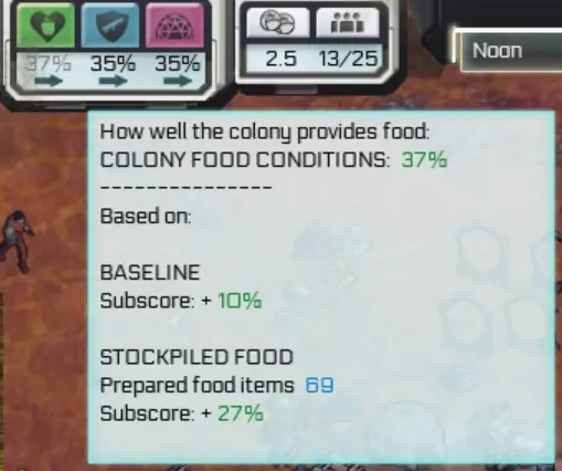 游戏遇到问题?看这里。 为方便你规划,这里分类整理了生存技巧、地图和成就相关内容。 简介 我真的很想喜欢这款游戏,但它实在太不完善了。它就像一块未经雕琢的璞玉,我希望有人能接手并将它打磨成一款出色的游戏。尽管存在诸多缺陷,我还是挺喜欢它的,因此推荐大家至少尝试一下……当然,要以便宜的价格,非常便宜的价格。 游戏的画面和机制都不错,整体设定是像《放逐之城》那样的外星城市建造游戏,但仍有改进空间。 我最喜欢的一点是从植物到动物的外星生物设计,它们都很酷,而且故事虽然简短,但也挺不错的。然而,游戏的人工智能表现不稳定,殖民者会像无头苍蝇一样到处乱跑,明明有充足的食材却拒绝烹饪,或者工具棚就在旁边却把东西丢在地上!通常,通过保存游戏并让其自动重新加载后,这个问题会有所改善。 阅读指南或事件时音乐会关闭,而且音乐循环时会突然中断并重新开始,这非常让人出戏。游戏没有自动保存功能,所以(就像典型的模拟经营游戏那样),如果你过于专注而长时间忘记保存,游戏会开始变得卡顿,出现各种故障。如果运气不好,游戏可能会冻结,而你又没保存的话……那就只能重来,所以记住要经常手动保存。哦对了,游戏还存在无法正常关闭/退出的问题,我需要从Steam库强制关闭它。 这款游戏如果能加入随机地图模式(目前只能在固定地图的场景中游玩),并且支持模组让玩家分享自己的地图和场景,那就更好了。在论坛上看到开发者已经放弃了这款游戏,真是太可惜了……不过也没办法。自定义难度确实能带来一些变化,而且鲸鱼座τ星地图有点沙盒的感觉……好吧。 不管怎样,我真的很喜欢这款游戏的美术风格,就这个价格而言,已经足够好了。 测试版本(游戏属性->测试版)实际上更稳定,内容也多一点,看起来开发者在发布新更新之前就放弃了。我制作本指南的主要目的是记录我通过反复尝试、观察以及在论坛阅读所学到的游戏相关知识。我刚开始玩这款游戏的前两天,居民们总是因为食物不足或舒适度不够而离开或死亡,我对此百思不得其解。虽然我阅读了食物指南,但仍有一些疑问。所以,希望我的笔记能帮助其他尝试这款游戏的玩家。 我还是一名成就猎人,因此想写下自己关于部分成就的攻略。如果你在某个场景中遇到困难,可以查看该部分内容。 最后提醒一点:不要将缩放比例调至2以上,否则可能无法通过游戏内功能重置用户界面。如果调乱了,就需要到配置文件中进行重置。请注意,图形变化(包括放大效果)需重启游戏后才能生效。 那么,我们开始吧! 营养、安全与舒适度 这是游戏的主要变量,此三项将决定殖民地的整体健康状况。 如果这些指标未达到居民的标准,他们将会离开你的殖民地。一个理想目标是将所有指标维持在40%以上,但这颇具难度。我会根据自己的理解,尽力对每一项进行解释。 你可以通过将鼠标悬停在百分比数值上,查看当前分数的影响因素,操作方式如下:
