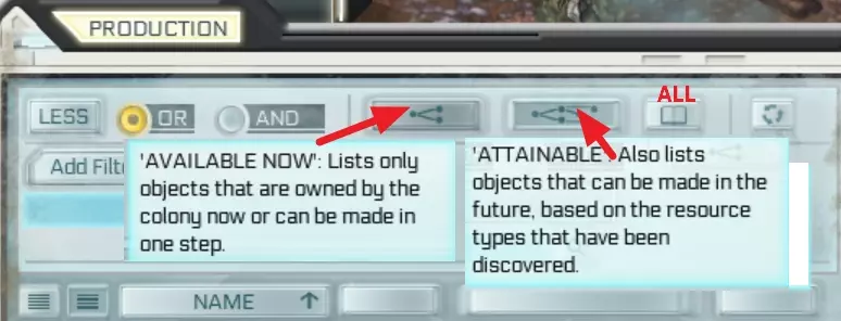 当然,这只有在你指定的采集区域内还有物品时才有效。如果那里没有黏土了,殖民者就无法从那里采集黏土,你懂的。所以,如果你下令采集的是非可再生资源,要时不时检查一下命令是否仍然有效。 生产筛选器:在菜单右侧,生产菜单中有一个带有3个矩形图标的按钮,你可以在这里命令殖民者制造物品。默认筛选器是“当前可用”,这虽然不错,但很难记住制造所需物品的材料。