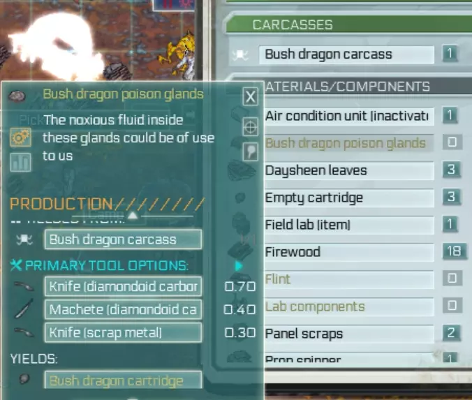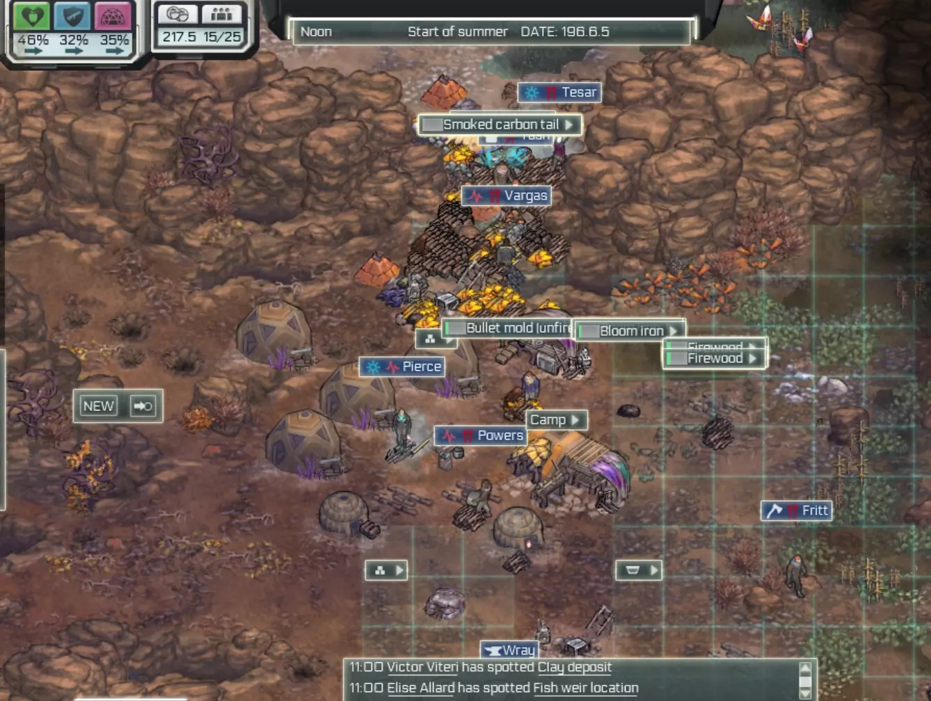 要认领被其他外星生物杀死的生物尸体,你需要让一名殖民者靠近,划定一个区域,然后切换实体进行操作。 你可以通过使用【移动营地】功能来绕过必须靠近营地才能狩猎的限制,将营地移到猎物附近,狩猎完成后再将营地移回城镇。执行此操作前请保存游戏并备份存档,因为殖民者在试图搬运所有物品时可能会陷入混乱,导致游戏在几分钟内崩溃。如果你发现游戏出现断断续续的卡顿,可能很快就会崩溃。 【铁匠铺】建筑默认可以存放木炭,尽量不要将木炭存放在其他地方,否则会带来麻烦。 如果你回收了一个港口,需要再次调查才能重新发现它。每个贸易港口都有其特定的买卖物品,在往自己的港口囤积没人会买的蠕虫尸体之前,先检查一下它们的交易清单。查看方法:进入世界地图(右侧的地球图标按钮),点击港口,然后点击红色/绿色按钮。 如果有殖民者处于闲置状态,先检查他们是否在等待工具。如果不是,保存并重新加载游戏,这可能会解决问题。 当你从城镇招募新殖民者时,这个bug更容易出现——他们到达后会一直站着不动。如果你的殖民者明明有食物却在挨饿,也可以尝试用这个方法解决。 注意!如果在建筑正在生产物品时对其进行回收,可能会导致游戏出错。 人口数量是有限的,如果有殖民者死亡,该场景中可招募的人数就会减少一个。 新的人口不会刷新……或者会因年老而死亡,我猜是这样。-关于游戏卡顿/崩溃问题- 如果游戏出现文本显示异常或卡顿现象,请检查你的建筑布局,建筑物过于密集可能会导致寻路问题。 我还发现,废弃的地点会拖慢游戏速度。如果你不常使用某个地点,建议对其进行回收,以避免殖民者在上面浪费时间。(例如,如果你已经用黏土建造好了所有需要的东西,就回收黏土矿坑;或者如果你周围已经有30个矿石了,就回收矿石矿坑。需要时你可以重新建造它们。) 避免囤积多余物品,只收集你需要的资源,这样游戏需要追踪的内容会更少,运行也会更流畅。营地真的不需要25根木棍。此外,你的建筑越少,需要维护的东西就越少,殖民者的空闲时间也就越多。你其实并不需要4个石头烤箱。记住,贸易会迫使物品立即被存放到港口/直升机停机坪,如果你地面上物品太多导致游戏卡顿,这一点能帮上忙。哦对了,保存游戏然后重新加载也会有所帮助。 我确定有一件事会导致卡顿,那就是当动物被视为威胁时(它们会被标记上骷髅头和骨头图标),这会迫使所有殖民者都寻路去攻击它。想象一下15个殖民者同时这么做……呃,你需要尽快杀死这些动物,或者远离它们的领地。 另外,试着在选项菜单中将图形设置切换为硬件模式。说到底,我也不清楚究竟是什么导致了游戏卡顿,可能是多种因素共同作用(物品数量过多、寻路受阻),也可能是同一种物品的储存区设置得太多,导致AI无法决定该把东西送到哪里,或者还有其他完全不同的原因,又或许是我的旧电脑已经不足以运行这款老游戏了……唉。