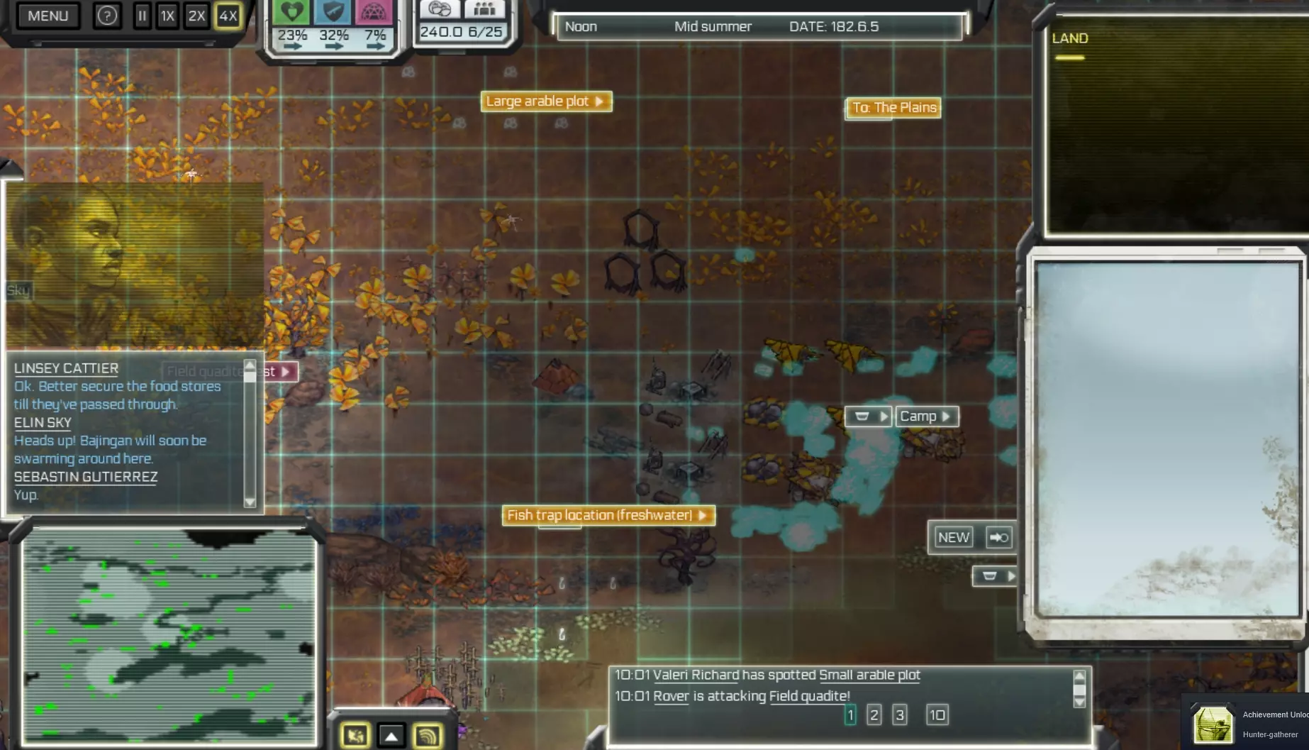 我主要靠蛤蜊三明治、面包和鸡肉活了下来!真好吃! 不要将常规指令设置为收集所有食物(99),应设置为人口数量的1.5倍。 例如,如果你有10个人,就将指令设置为15。 未收集的食物不会变质。 要达到35%的评分,你需要储存约65份预制食品,且无人挨饿。 当你的舒适度和安全感都达到35%以上,人口达到12人以上时,只需从城镇购买大量腌制食品,你的营养水平就会大幅提升,【Trader】成就也会解锁。解锁该成就后, farming和fish traps将开放,之后就会轻松很多。注意,有些fish trap位置存在无法到达的bug!这游戏……在鱼点位置尝试建造陷阱前记得存档,但weirs是没问题的。-舒适与安全- 泥屋搭配草席应能提供35%的舒适度。 若没有机器人或狗,铁矛和弓箭应能提供35%的安全感。 如需提升安全感,可购买步枪/滑膛枪。 确保无人受伤。 -狩猎获取皮革- 记住,必须是鞣制过的皮革! 狩猎十分麻烦,因为只能在营地附近进行,而且如果迁移营地,还得将所有物品从旧营地搬运到新地点。我个人会先使用攻击或巡逻指令,然后选择区域,切换物品后再进行拾取。 被陷阱杀死的动物会被自动拾取。 殖民者会定期检查陷阱,并在需要时重置它们。 你可以在陷阱附近建造拒马以形成隘口。 巨型足虫:出没于东南方的沼泽,需携带弓箭或更好的武器。你需要20张皮革。鸡:出没于北部森林,将它们全部击杀。你需要50张兽皮。 巴京安实际上就是鸡,击杀它们会掉落雷鸡尸体。 鞭颚兽:它们有时会迁徙,可在地图中部或西南部找到,有时还会试图攻击巨型豆荚。你需要40张兽皮。