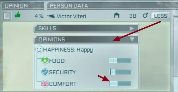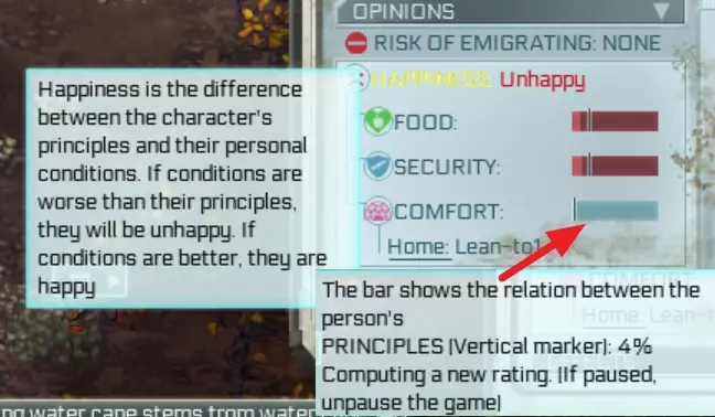 在这张图片中,你可以看到这个人的舒适度处于中性状态,尽管我的舒适度只有4%,这是为什么呢?她的舒适度原则被设定为4%,所以,嗯……这就是标准。 你可以通过以下方式查看他们的原则限制:进入角色面板,向下滚动并打开意见面板,或者在人员选项(右下角,图标看起来像人物)中,将鼠标悬停在笑脸或皱眉表情上。