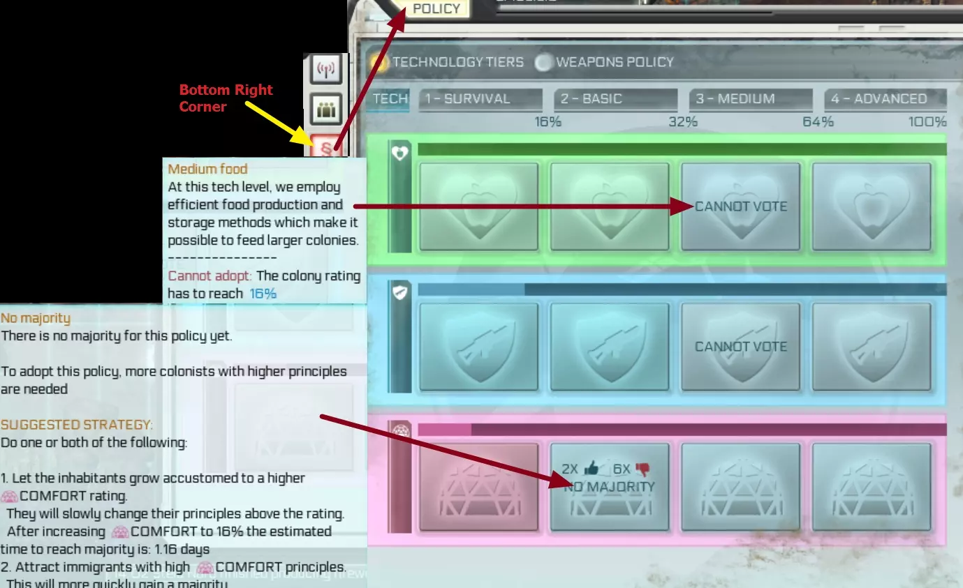 在制作菜单中,点击【可用数量】即可定位食物所在位置。 如果储存有食物(包括种子等可食用原料),评分会上升;如果殖民者开始挨饿或营养不良,评分则会下降。要维持这一数值,需确保有足够的食物供殖民者保持健康,这需要在原料、熟食和腌制食品之间保持紧密的平衡。评分会考虑食物的储存天数,因此人口越多,所需的储存量就越大。 请将储粮洞/黏土谷仓放置在靠近烹饪站的位置,以获得最高效率。 安全:这取决于武器的数量和质量。 每人最多计算2件武器,且武器必须处于装填状态,因此空的线圈步枪不计入在内。部分机器人和/或哨塔会对评分产生影响。 有受伤人员或被怪物杀死会极大降低评分。 早期最佳策略是制作简易长矛,确保每人都有,但不要用燧石制作长矛,因为之后制作枪支会需要燧石。每人最多携带2件武器。 舒适度由住房质量和兴奋剂储备决定。 所有可用住房的平均等级作为基础对评分产生影响。 建议将住房建在工作中心和食物储存处附近,并为所有殖民者提供住房。 房屋可以升级,点击房屋,然后点击弹出标题上的箭头。 随着科技进步和获得更好的材料,你应该建造更好的房屋并回收旧房屋。随着你通过政策获得更先进的技术,将能建造更优质的住房。部分殖民者有着更高的追求,他们更难满足,但你也需要依靠他们来提升舒适度技术。100%受激励城镇的最大舒适度评级加成是5%。政策是你获取更先进技术以提升这三项主要属性的途径。你可以通过点击右侧菜单的最后一个按钮(右下角)来访问政策。