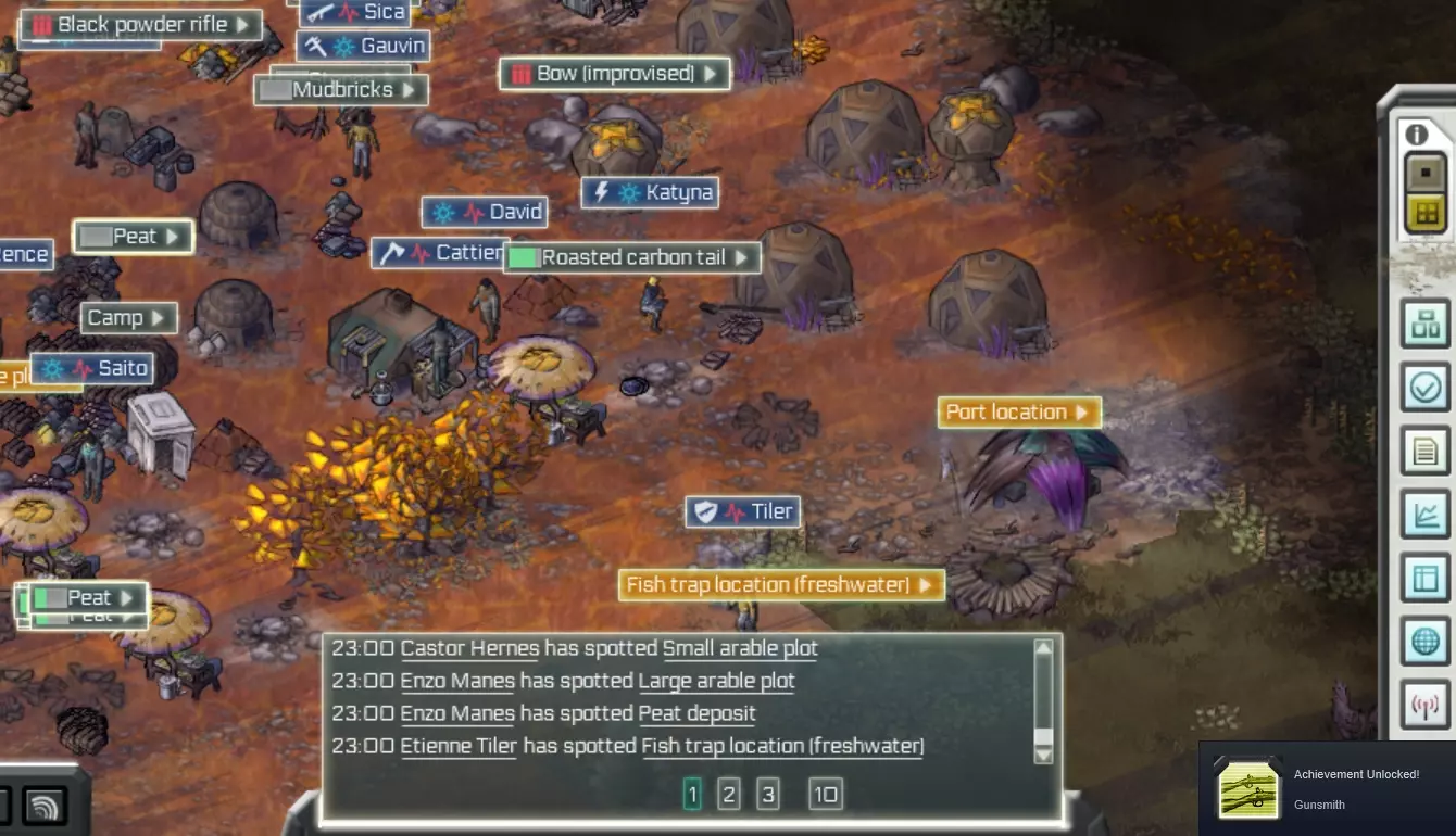 你也可以在物品选择窗口拆解部分物体以回收其零件。 殖民者携带的物品会被视为【外部物品】。 注意,若在建筑生产物品时对其进行回收,可能会产生不良后果。请确保建筑完成生产后再进行拆除。 如果某个建筑由物品构成(例如帐篷),在其处于建造状态时对其进行维护将恢复物品的耐久度,但陷阱或岗哨等可部署物品除外。 快捷键:可使用P键或空格键暂停时间;使用M键打开选项菜单;数字键1、2、3分别控制1倍、2倍和4倍时间速度。 提示:务必记得经常保存!建议创建多个存档,我曾遇到过一次崩溃导致存档损坏的情况!你可以查看成就部分,获取我如何通过额外挑战完成场景的提示。 探索用于发现资源,比如鱼塘或黏土/矿石坑,不要只进行侦查,也要进行探索,有时需要探索两次。 地点的资源不会耗尽。 有些地点如果长时间未被看见会被“遗忘”,你需要再次前往探索,这就是为什么会频繁出现“发现”地点的提示。 再次点击搜索按钮可移除搜索结果筛选。 记住,你可以命令人们做事,但如果他们没有合适的工具,就不会行动,只会呆站着。查看人员信息(右下角的人物图标)可以了解殖民者的看法,从而努力让他们保持愉快,这也有助于弄清楚殖民者为何处于闲置状态。 记住,你可以升级一些建筑。 【铁匠铺】的高优先级设置不起作用,它总是会优先制造更多的熟铁或锻铁,而非其他物品。