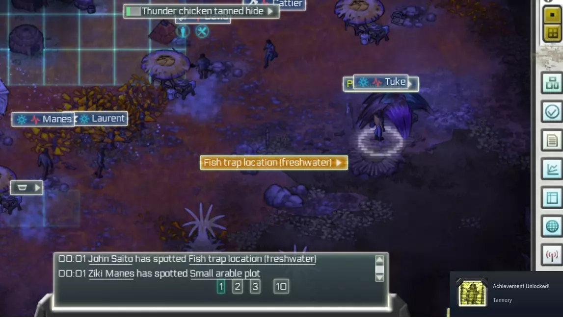 红色:夸迪特巢穴 紫色:淡水鱼 橙色:鱼堰 白色:耕地(无用?) 黄色:咸水鱼(真的无用) 继续推进政策至基础级别(舒适度除外),并打捞所有残骸。 用废金属制作一把铲子、一把手斧、一把镐和一口锅。 也要制作一个捕虫网,这样你就能捕捉猪蝇并用它们来钓鱼。 如果你靠近巢穴,闪烁虫会冲向你的营地,不要靠近巢穴。 -营养- 好的,你可能会很困惑,因为你甚至不能建造营火,但不要担心。 你需要点击【可获取】按钮查看选项,然后四处寻找材料。我们需要尽快搭建营火。同时部署野外实验室并制作一口锅。 你可以用空调、石头和树叶制作一个冰箱。这样做并把它放在营火附近。 使用检查功能可以发现隐藏的资源,比如鱼类、块茎等。 制作1把粗制长矛以便钓鱼,制作一个捕虫网来捕捉小鱼和诱饵。 至于酶的用法,可以把它想象成调味料。 如果你有2个块茎,用其中1个制作酶,然后用这些酶处理另一个块茎来制作块茎餐。所以这类餐食中,每个食物都需要1个酶。不要把所有食物都浪费在制作酶上! 船员们吃鼻涕虫和苍蝇是很艰难的。 冷冻库可以将制作好的食物保存到游戏后期。 记得使用常规指令来收获可再生食物资源并自动烹饪(之后它们会被冷冻)。 【安全方面】 使用标准的粗制长矛和弓箭就没问题。 避免受伤,否则你的人很可能会离开。-经常存档- -舒适度- 建造两个简易棚屋(树叶材质),这样就没问题了。 将它们建在海岸边,以避免遭遇闪烁生物。 如果有时间,为它们制作一些垫子。 鲸鱼座τ星平原(狩猎采集者/山中亲属) 我选择了山地(中型),因此本节的策略和展示的地图将反映这一点。 编辑:在这张地图上花费了5小时后,我才意识到这里没有巨型豆荚,所以制革厂将无法建造。 编辑2:在平原地图上建造制革厂后,我意识到可以在其他城镇购买未鞣制的兽皮,然后进行鞣制,这样也能算数。 我确实在这张地图的大型版本中找到了巨型豆荚,在其西南部的沼泽中,但大型地图让我的电脑运行得非常卡顿……唉。 所以我决定在这儿完成两年的狩猎采集者任务,然后尝试平原(普通)地图来完成其他任务。