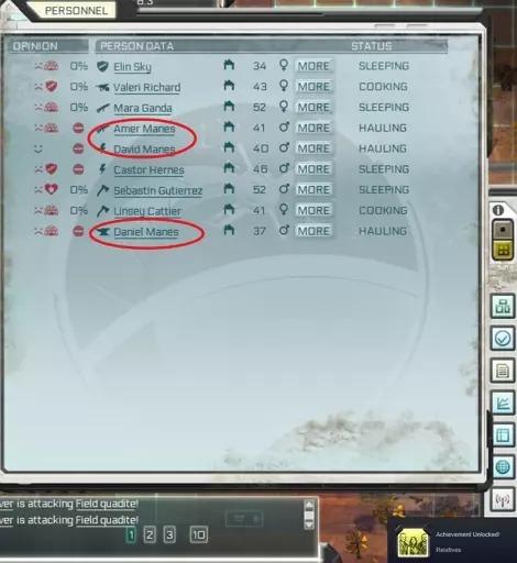 亲属 在【陶赛特星原野】(普通或困难难度)中,拥有3名同姓殖民者 招募3名亲属是随机的,你可能需要反复重新开始游戏并建造无线电来查看能否让3人加入你的殖民地。据我所知,不会生成新的人员,且一旦有人离开地图或死亡,就永远消失了。我在另一个城镇找到了全部3人。避免使用简易无线电棚屋,它损坏速度快且存在bug,无法修复。
