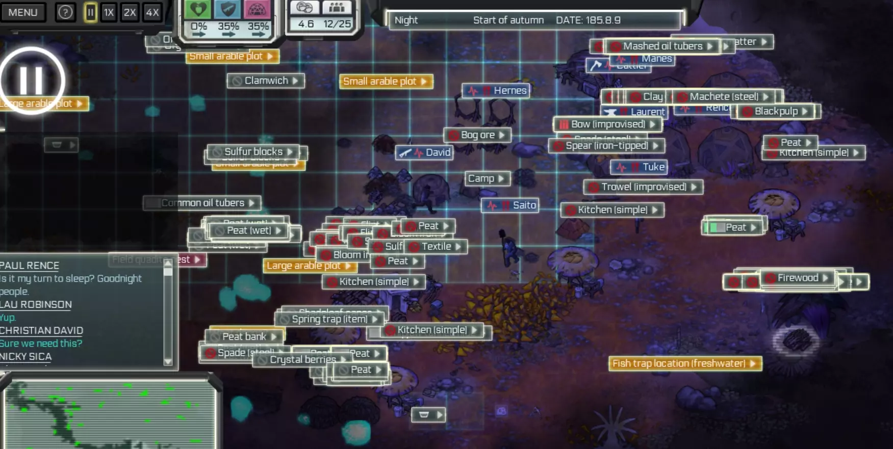 在这里,你可以查看可采用的科技,并且应在获得多数投票后尽快采用。这将让你建造更好的建筑和工具。 若将鼠标悬停在无法投票或未达多数的标识上,你可以查看暂时无法提升科技等级的原因。 机制 昼夜交替 在这个无人认领的世界中,昼夜交替并非一天,而是一到两个季节! 每10个单位时间,月份增加1。例如:0.10.10变为0.11.1(年.月.日) 一年有14个月,因此0.13.10会变为1.1.0。 常规指令(重复行动) 学习如何设置和使用常规指令。 简单来说,当殖民地库存低于设定值时,你可以命令任何可用的殖民者在你高亮的区域收集这些物品。这是一种能确保森林中总有木柴以及其他基础物品随时可用的好方法。操作方式是点击数量滑块左侧的锁定图标。