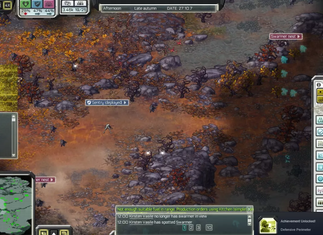 提案已拒绝 在不生产任何橡胶部件的情况下完成【Making Headway】 任务目标 人口:15 评分:食物:40%,安全:27%,舒适度:40% 这个阶段应该比上一个简单。 你有农田,但需要一段时间才能产出……嗯,农产品。 最大的威胁是害虫偷吃你的食物,所以我们最终需要处理西北方向的那个巢穴。要制造炸弹,你需要黑火药(硫磺+木炭+硝石),这些可以在Zenig Station购买,但要注意,这只是暂时的,几天后巢穴又会恢复。 你会注意到小地图上能看到整个地图,以下是需要通过调查发现的重要地点: