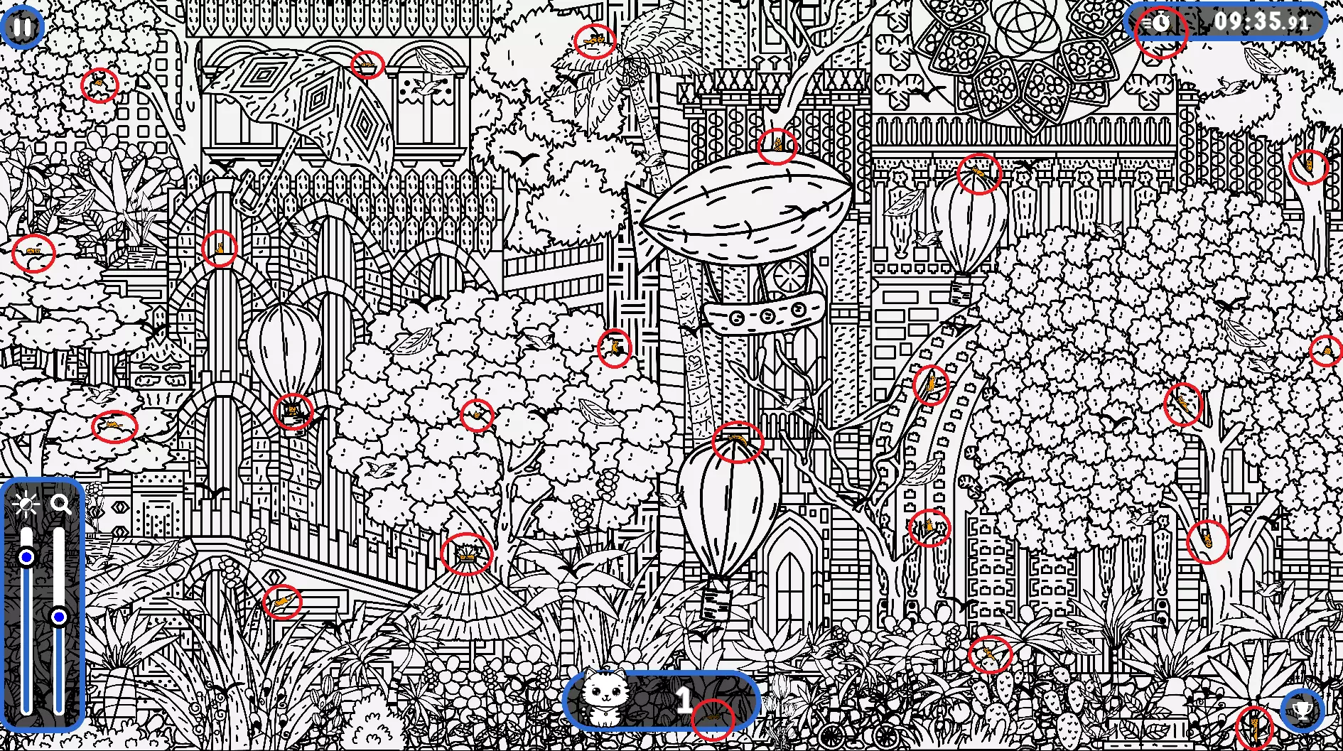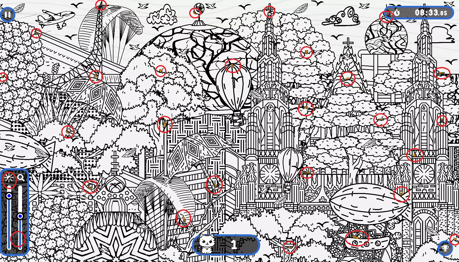 大家好, 本指南旨在帮助你找到所有隐藏的猫咪。有些猫咪很难被发现,所以如果你在寻找遗漏的猫咪以完成游戏,欢迎使用本指南或参考一下。保证能100%解锁成就! 祝玩得开心! 猫咪的所有位置 注意: 1) 最后一只猫咪在绿色圆圈中。 2) 请注意,有些猫咪隐藏在用户界面和计数条后面。它们也被圈出来了。 左侧