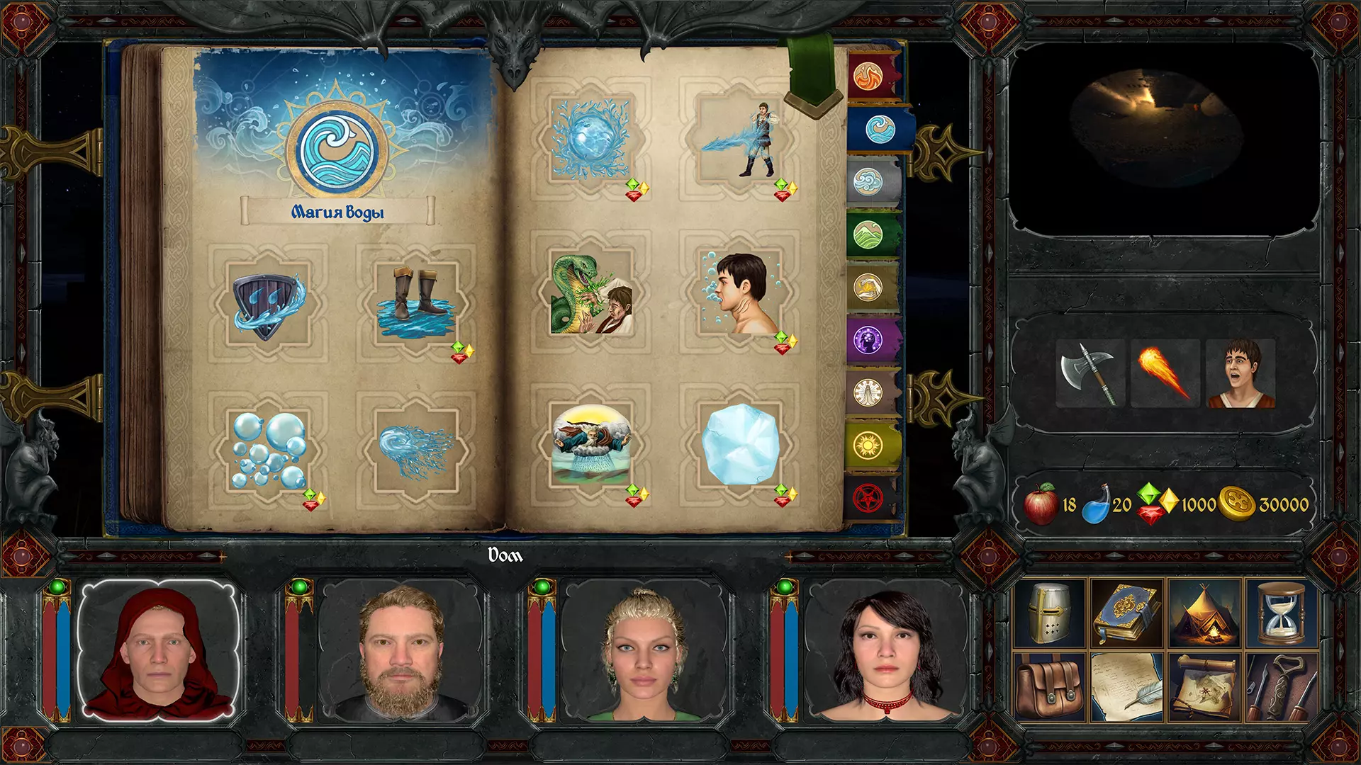 食物可以从苹果树、果树、菜园获取,也能在森林中找到或在酒馆购买。 休息时,队伍会根据周围环境消耗一定数量的食物(在沙漠和积雪地区需要消耗两倍的食物)。 如果食物耗尽,队员们会开始挨饿并变得疲惫。持续挨饿将导致死亡。水 水可以在酒馆购买,或在拥有盛水容器的情况下从饮水井或水域收集。你的战士会频繁饮水,尤其是在炎热的地方(沙漠、有熔岩的地下城)。当战士口渴时,其面部附近会出现缺水指示器。如果无法饮水,一段时间后他会开始口渴,属性值会下降。口渴的战士对疾病和发烧的抵抗力更低。宝石:宝石(珍贵的石头)是这片土地上一种非常昂贵且有价值的资源。魔法师们会用它们来施展极为昂贵且强大的法术。请珍惜宝石,不要在弱小的敌人身上浪费它们。 金钱/硬币:金钱是王国内流通的金币。你可以用它们购买商品和服务。小队 - 营地,休息 经过长时间的旅行,你的战士们会感到疲惫,需要扎营休息。 要进入营地面板,请点击右下角菜单中的帐篷图标。