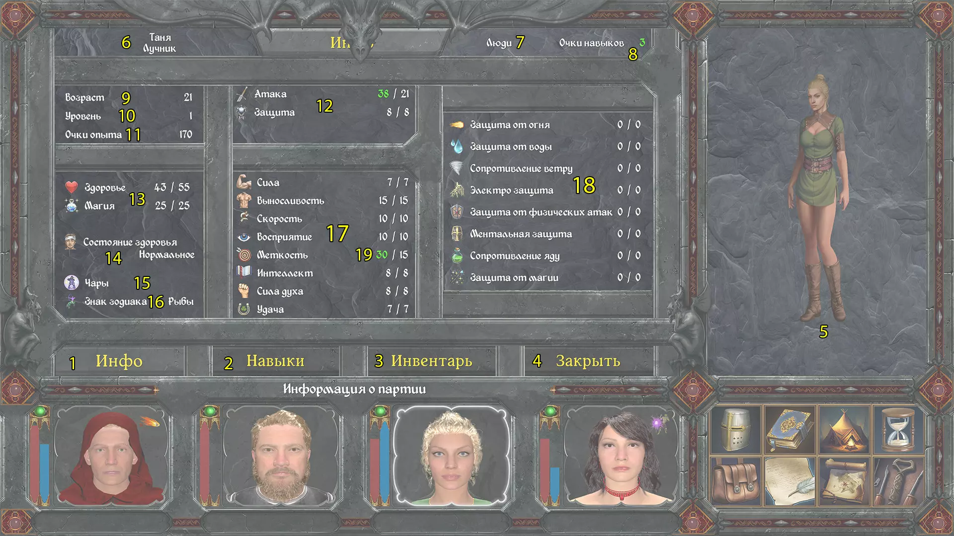 项目 1. 角色信息面板(状态) 在此处可以查看英雄的状态及其当前属性。 2. 角色技能面板 在此处可以消耗技能点(第8项)来升级技能与能力。 3. 角色物品栏面板 在此处可以管理英雄的装备。 4. 关闭面板 5. 当前所选英雄的外观 6. 角色姓名与职业 7. 种族 8. 技能点 技能点在英雄升级时获得。可以在城市中的训练中心提升等级。 9. 年龄 英雄年龄越大,会变得越睿智,但力量会相应减弱。 10. 等级 等级越高,生命值、魔法值及其他属性也会越高。 11. 经验 当经验值变为绿色时,你可以在城市中的训练中心提升等级。 12. 攻击/防御/护甲 角色当前的伤害输出和防御能力数值。生命值与魔法值 生命值与魔法值等级。若生命值降至0以下,角色将陷入昏迷且无法攻击。若因敌人攻击导致生命值持续下降,角色甚至可能死亡。 14. 健康状态 显示当前健康状况。建议在角色状态异常时立即进行治疗。 15. 特性 显示当前施加在角色身上的特性 16.1. 星座:英雄出生时的星座,会影响游戏中的各种事件。 2. 战士属性:英雄的基础属性,会影响其他属性的计算。 3. 战士防御:对不同元素和魔法的防御能力。防御值越高,受到对应类型攻击时的伤害抵抗就越强。指标的绿色/红色 绿色表示该指标暂时(在装备物品、法术生效或角色患病期间)高于正常水平。红色表示低于正常水平。 队伍 - 补给品 您的队伍拥有旅途中所需的补给品。 请始终确保您有足够的补给品来执行各项行动。