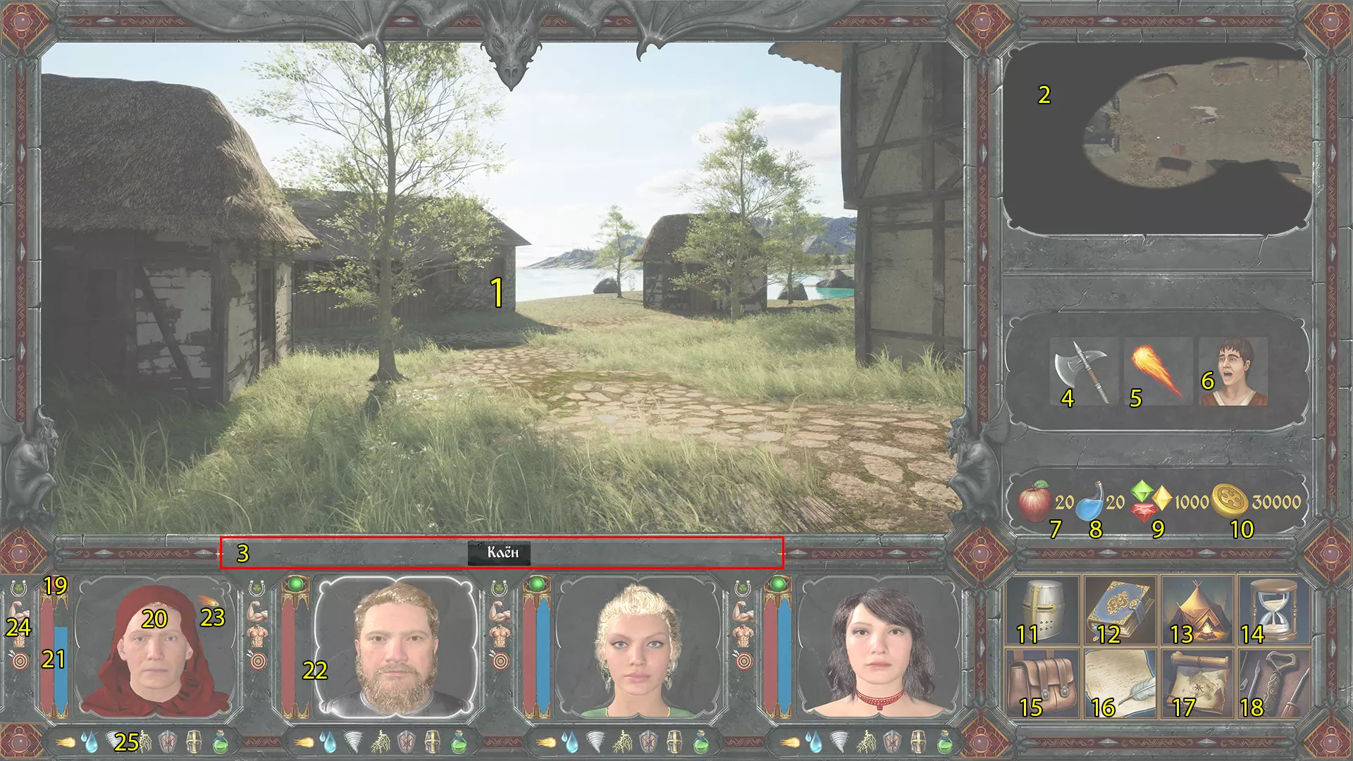 项目: 1. 3D世界观察窗口 2. 小地图 3. 信息面板 4. 武器攻击按钮 5. 魔法攻击按钮(快速施法) 6. 与NPC对话 7. 食物储备 8. 水源储备 9. 宝石储备 10. 金钱储备 11. 当前战斗角色技能 12. 当前战斗角色魔法书 13. 营地/休息/恢复 14. 游戏内日历/当前时间 15. 当前战斗角色背包 16. 任务日志 17. 当前关卡地图 18. 主菜单/游戏设置 19.战士行动就绪指示器 20. 战士 21. 生命值/魔法值指示器 22. 白色边框 - 当前激活(已选中)战士的指示器 23. 默认当前法术(左Shift+鼠标左键) 24. 角色身上的激活法术 25. 激活的防护法术 操控与快捷键 游戏操控通过键盘和鼠标进行。在游戏中,您可以将鼠标光标悬停在物品、建筑和敌人上,在文本状态栏窗口(【3号】)中获取信息。操作控制: WASD键或方向键 - 队伍移动 EQ键 - 转身 Shift + WASD键 - 奔跑 空格键 - 跳跃 F键 - 攻击 G键 - 魔法 按住C键 - 下蹲 X键 - 轻微下蹲 鼠标滚轮/Home键/End键 - 上下查看 鼠标中键 - 看向中心(重置视角) 1、2、3、4键 - 选择活跃角色 ESC键 - 取消操作、退出 T键 - 搜索尸体、拾取物品 R键 - 装填(适用于射击武器) PageUP键/PageDOWN键 - (施法时)上下飞行 鼠标左键点击 -行动、攻击、对话(若为友好单位)。右键点击敌人 - 敌人状态窗口。回车键 - 切换至回合制战斗模式。F12 - 截图(保存路径:MW2/Content/DataFolder/PUBLIC文件夹)。M键 - 地图。队伍 - 队员状态。你的队伍最多可由4名角色组成。游戏初期你可以操控1名角色,并通过完成任务来招募队员加入队伍。游戏中的每个角色,无论是你的队友还是其他任何NPC,都拥有反映其职业和经验的各种属性与技能。 队友状态 若要查看角色状态,需先点击其头像选中该角色,然后根据其序号双击1、2、3、4键。你也可以点击右下角菜单中带有头盔图标的按钮。