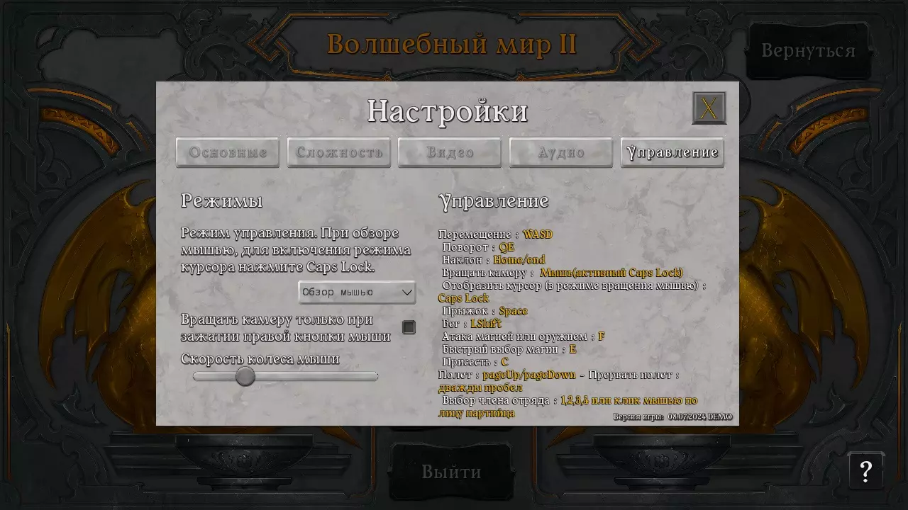 控制模式 - 可以设置为仅使用键盘进行视角操作(HOME、END、WASD键),或同时使用鼠标和键盘进行视角操作(通过Caps Lock键切换)。第一种模式为经典模式,用于早期第一人称派对角色扮演游戏。而鼠标视角操作在实时战斗或射击模式下使用武器时可能更为便捷。仅在按住鼠标右键时旋转镜头 - 若选择鼠标视角控制模式并通过Caps Lock键切换至鼠标视角,启用该选项后,镜头旋转将仅在按住鼠标右键时生效。 鼠标滚轮速度 - 鼠标滚轮的滚动速度。例如用于通过鼠标滚动镜头时。 控制 - 此部分包含当前有效的队伍控制按键。