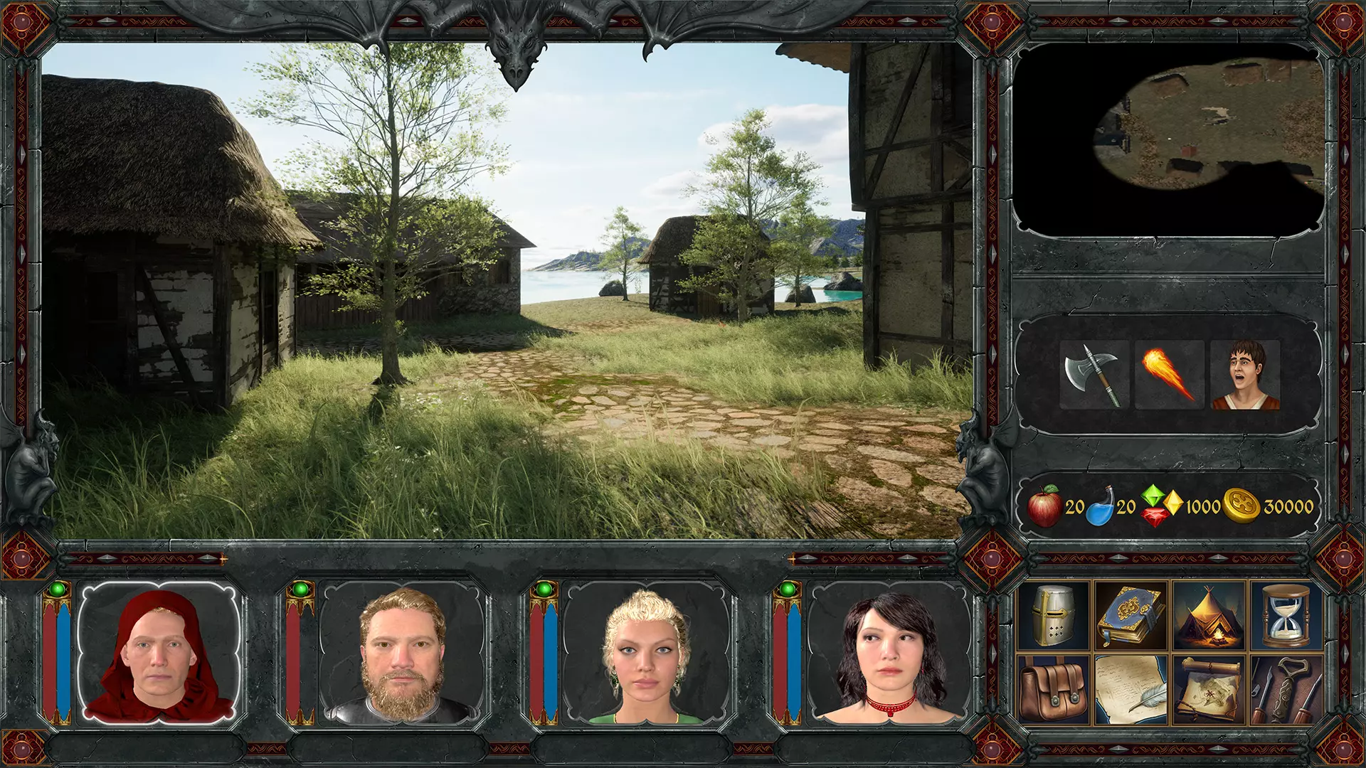 界面类似于80-90年代经典角色扮演游戏,包含大型图标、角色头像以及3D世界的裁剪窗口。 切换方式:若要在不同界面之间切换,请进入游戏设置,在【基本】选项卡的右下角会看到两个界面选择图标。