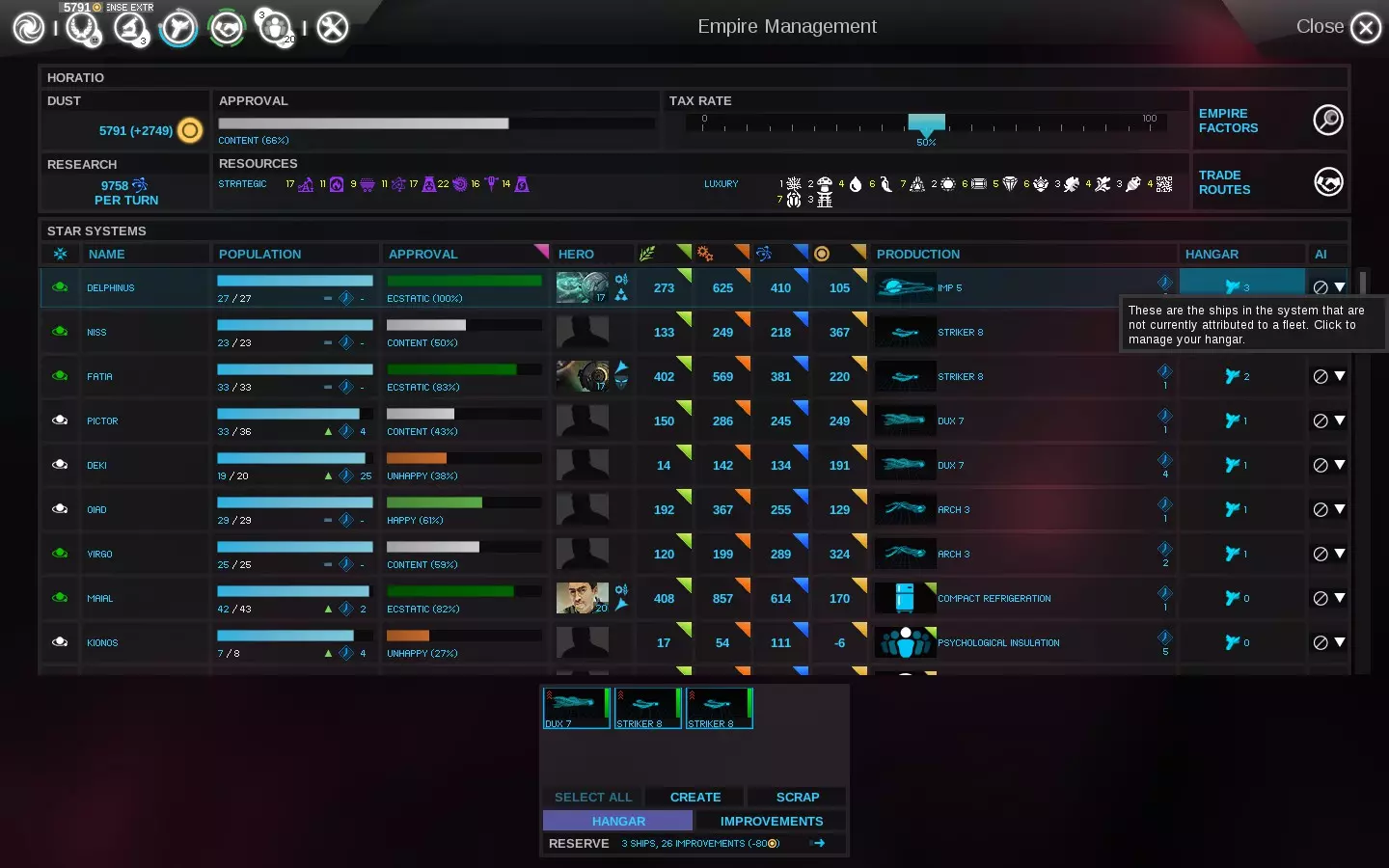我过去常常(现在如果在回合中只建造了一两艘船的话仍然会这样做)从【已完成建造】弹窗中选择刚刚建造了舰船的恒星系统,然后从机库中为这些舰船创建一支小型舰队。之后,我会查看那些没有任务的舰队,并将每支新组建的小型舰队派往某个共同的恒星系统,在那里组建我的完整舰队。 这个方法非常有效,但当舰船建造速度加快时,我更喜欢一种稍微更快、更顺畅的方法。 更快的方法 为了更快地创建舰船,我会进入【帝国管理】界面,然后选择【机库】列标题。