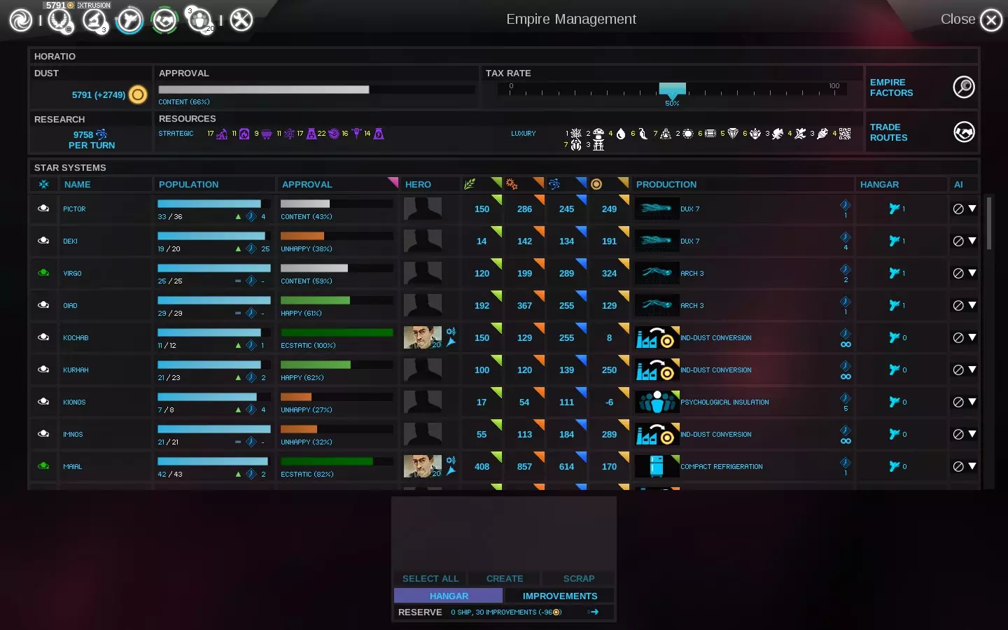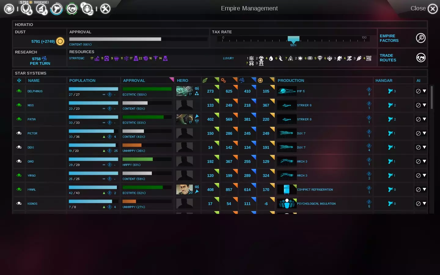 关于加快舰船建造的内容就介绍到这里。继续阅读,获取更多相关提示以及改进游戏体验的建议。 专业提示:处理“无生产力”问题 一旦你习惯使用帝国管理界面来整理机库并快速建造新舰船,你可能会发现该界面的列排序功能还有其他类似用途。你或许已经知道可以按【满意度】排序,以便找出不满意的恒星系统,不过我还经常使用【生产力】这一列进行排序。