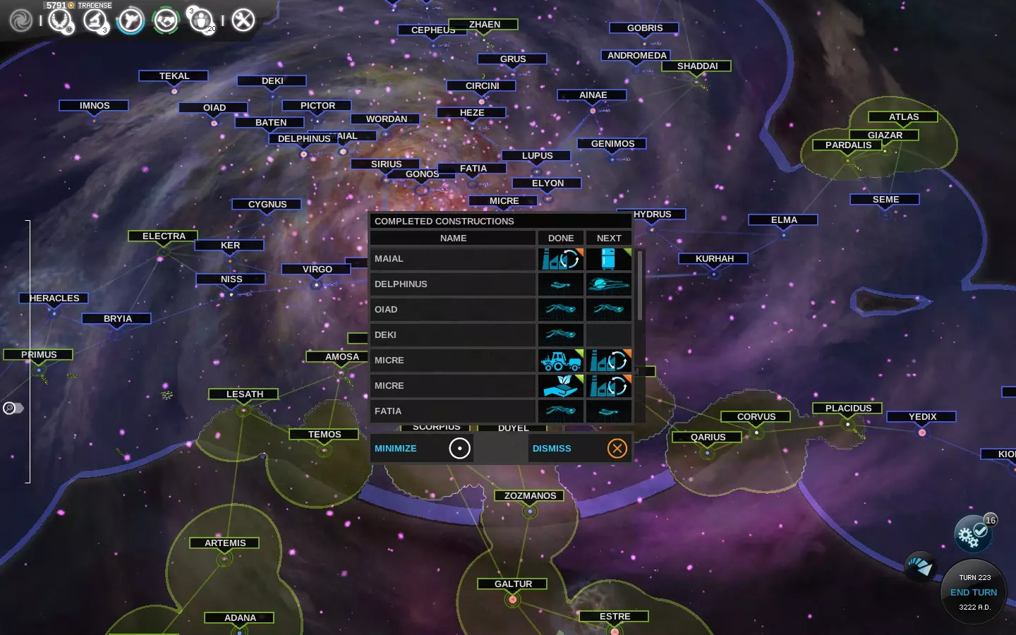 我刚刚结束了一个回合,第一件事就是打开【已完成建造】弹窗。注意到在上一回合中,我的帝国里多个恒星系统都建造了一些飞船。
