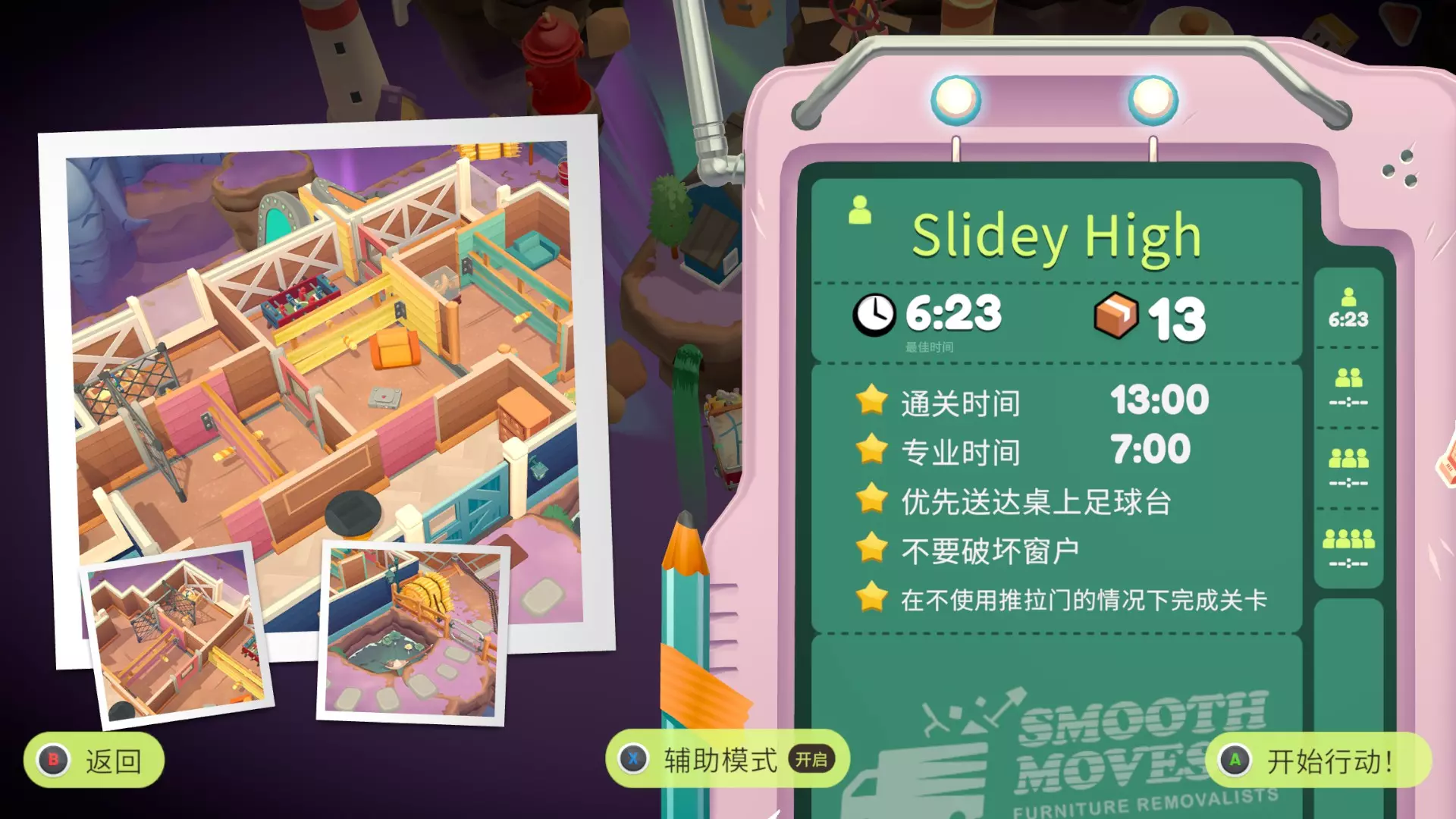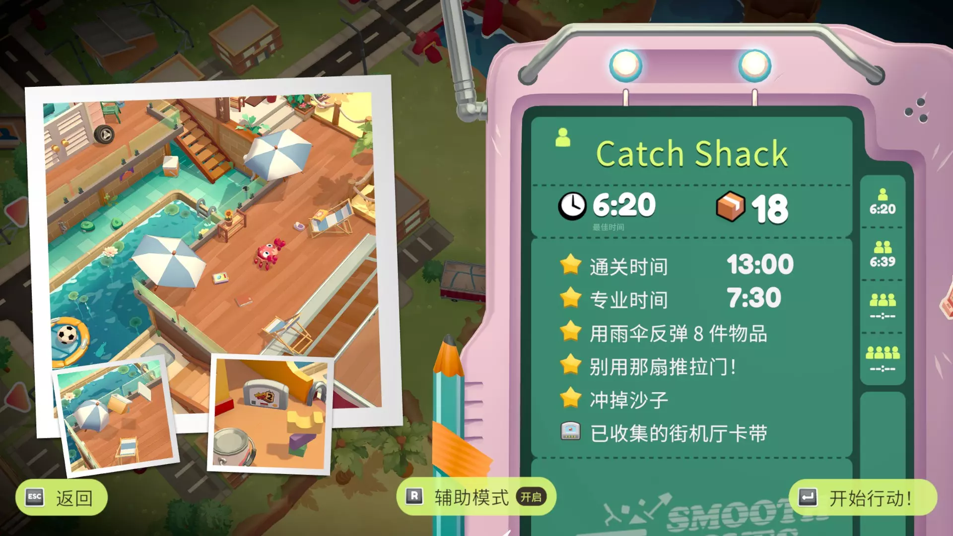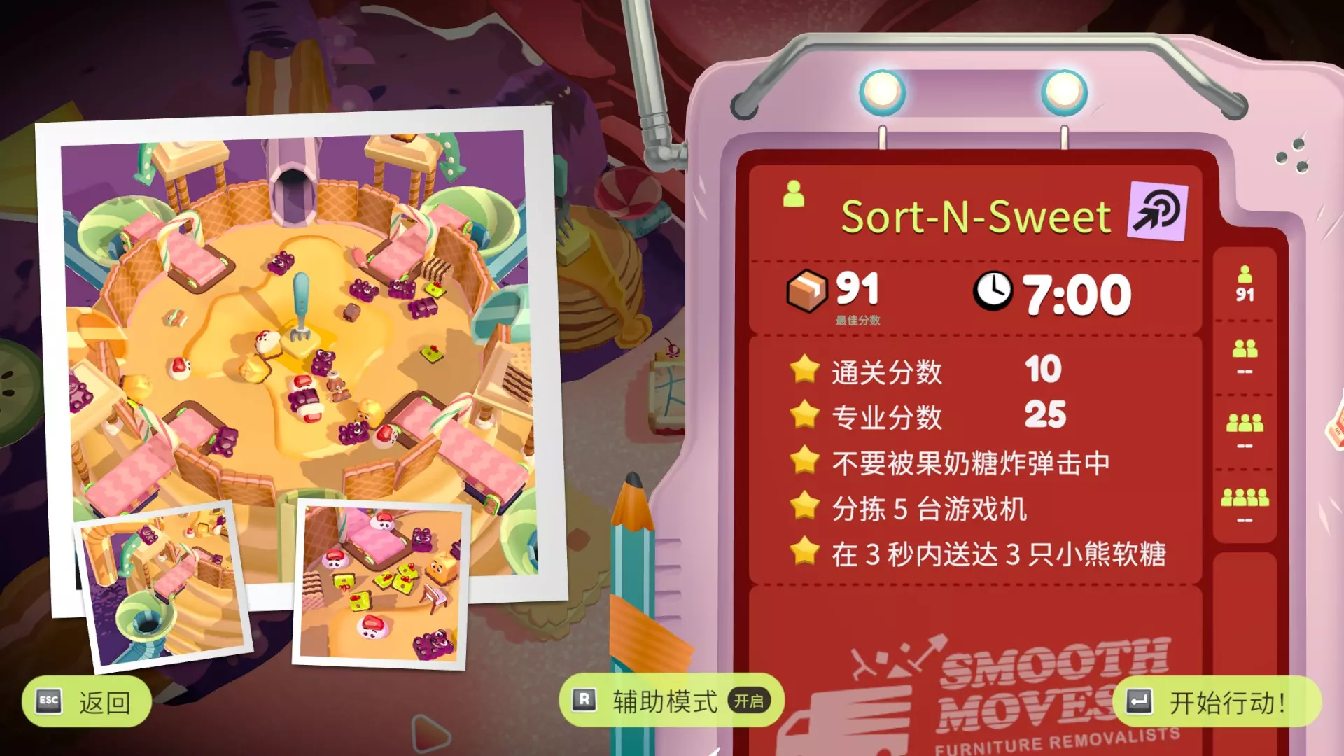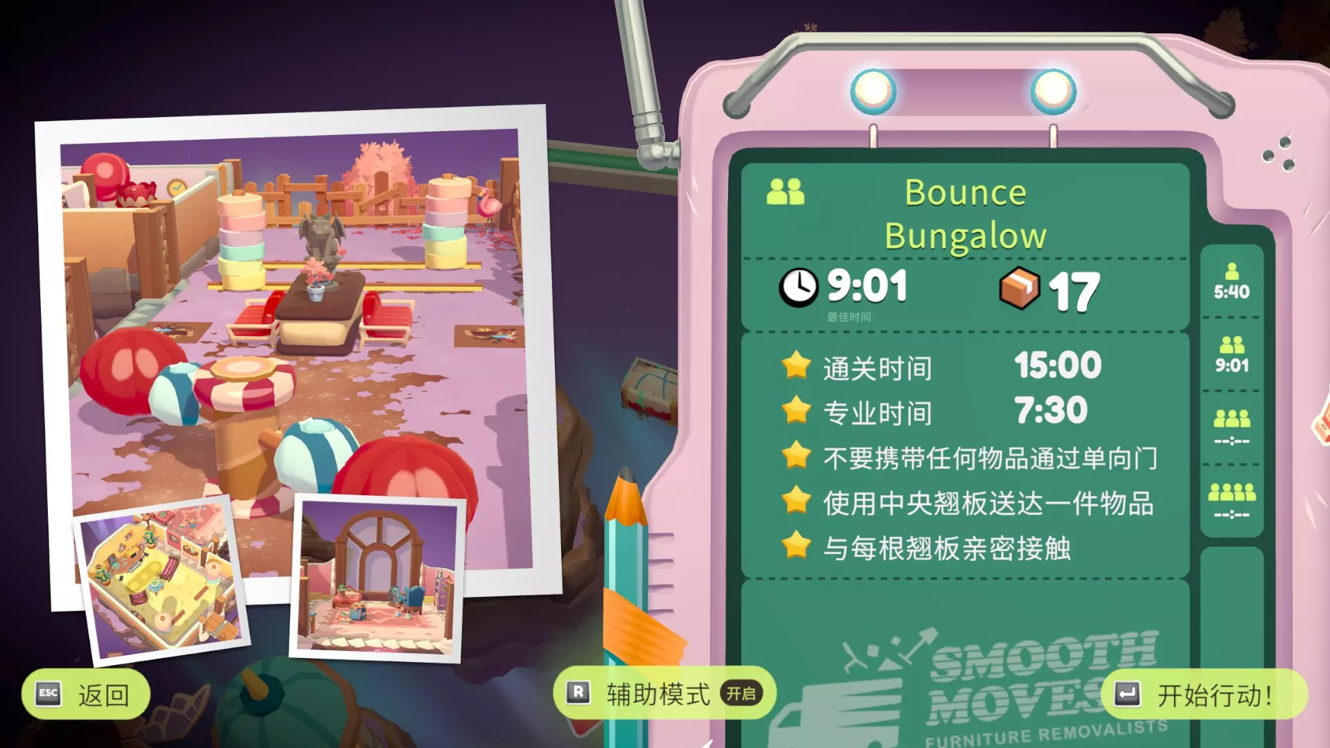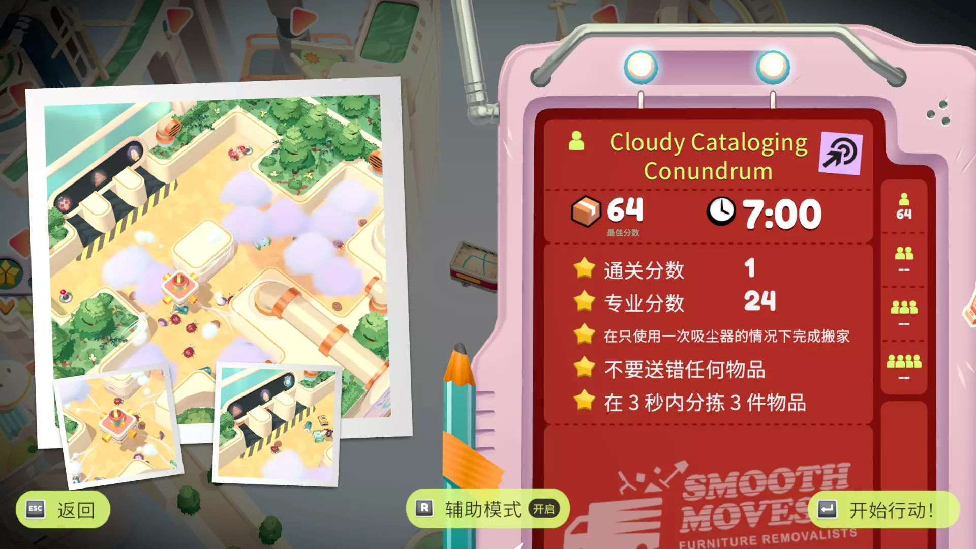 在只使用一次吸尘器的情况下完成搬家 不要送错任何物品 在3秒内分拣3件物品 可以一次性多攒几个,等门一关就往传送带上丢 泳池小屋