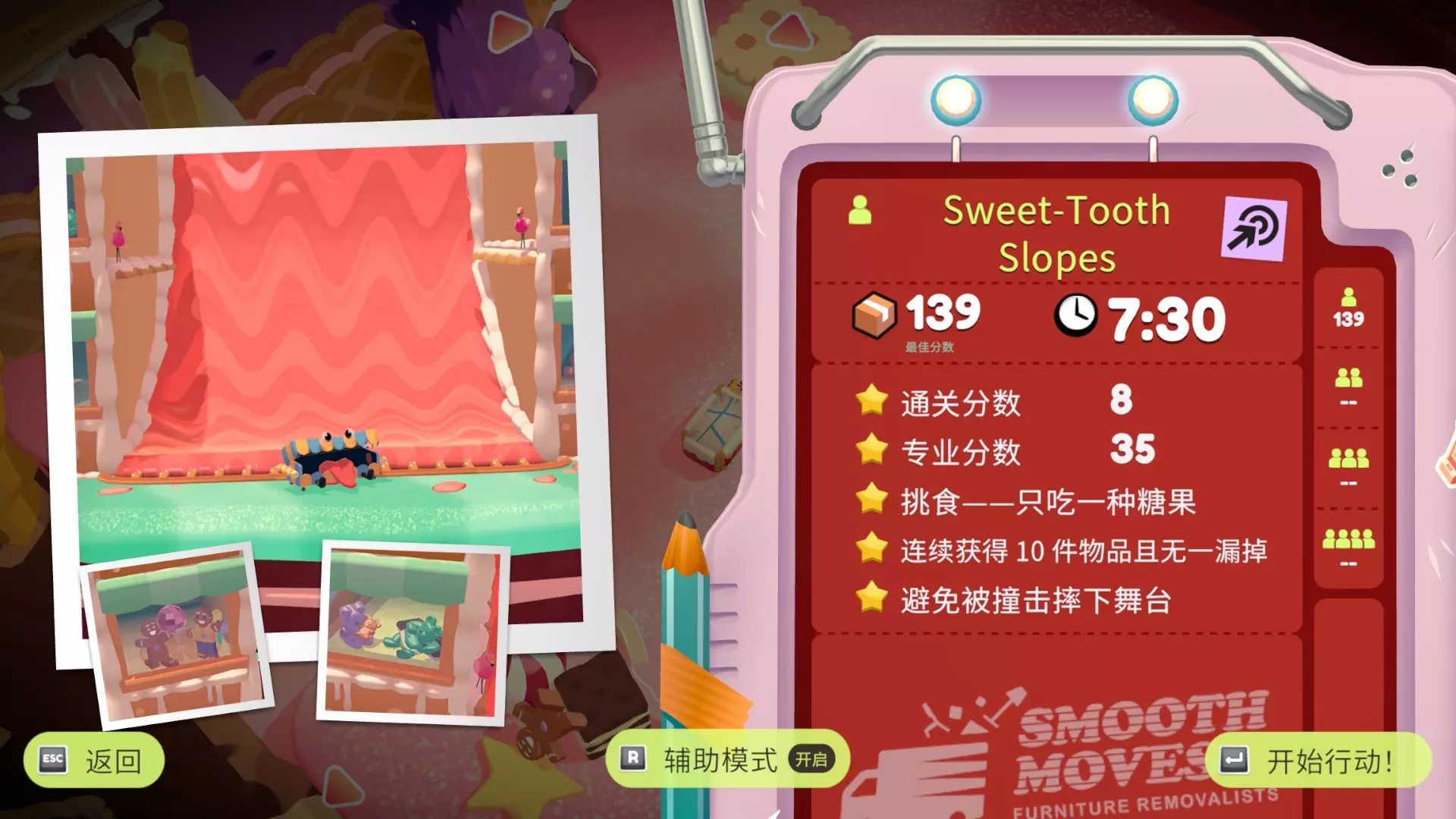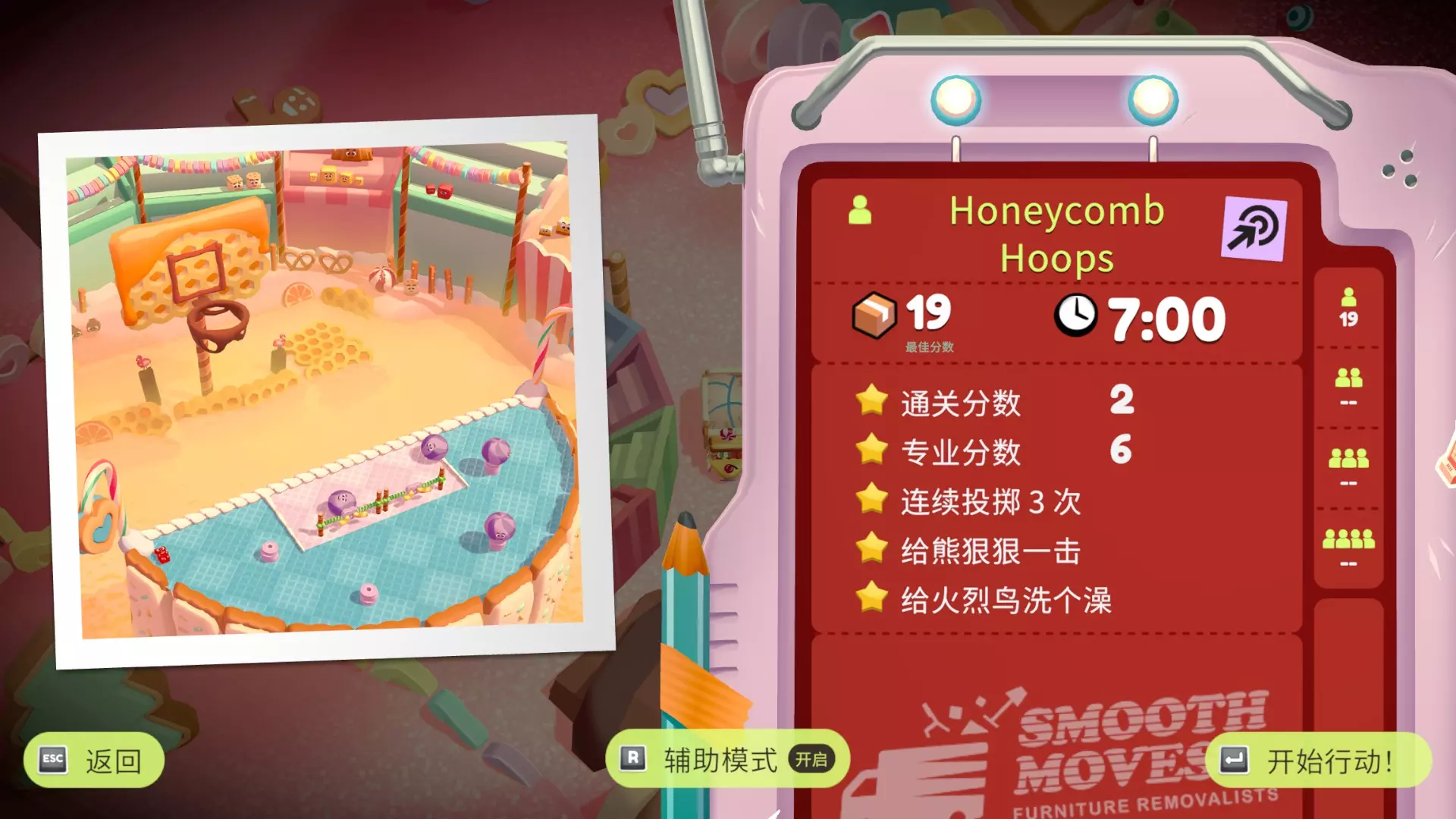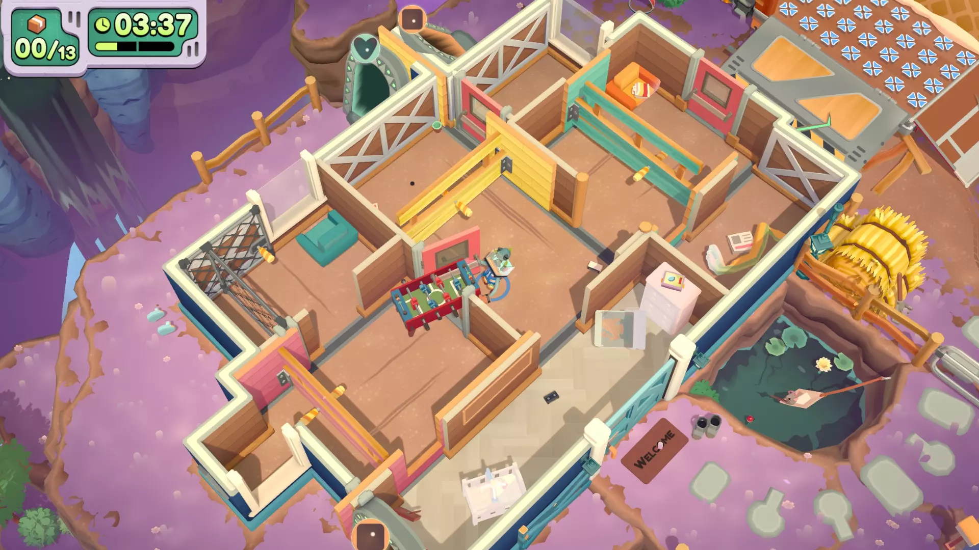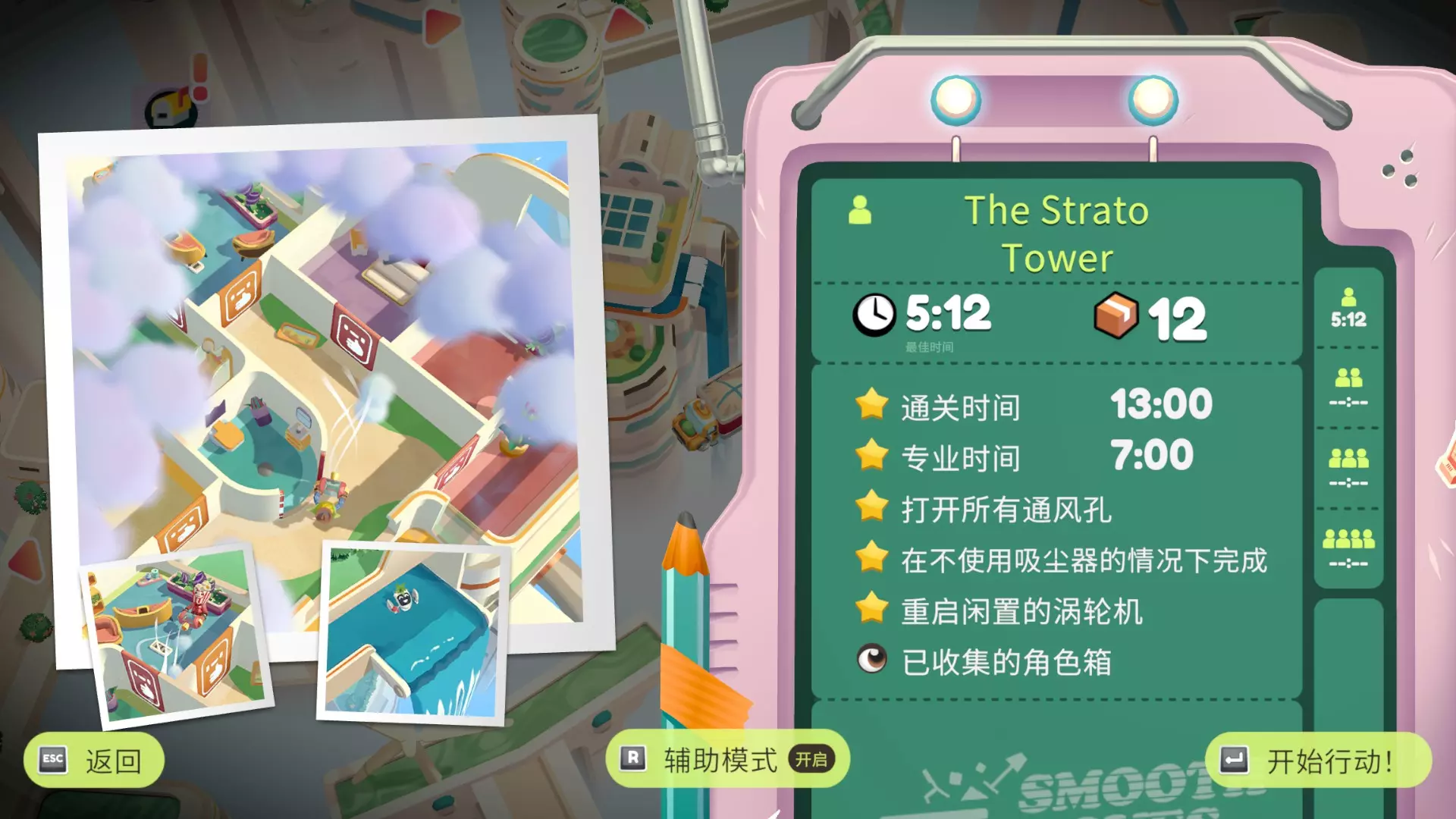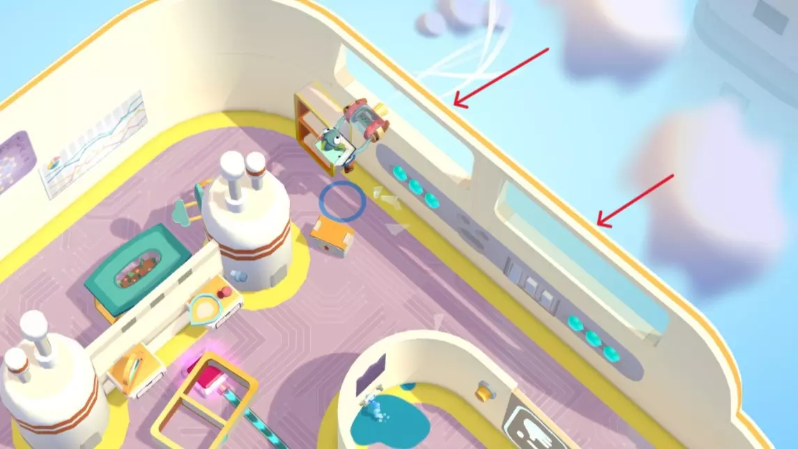 在只使用一次吸尘器的情况下完成搬家 不要送错任何物品 在3秒内分拣3件物品 可以一次性多攒几个,等门一关就往传送带上丢 泳池小屋