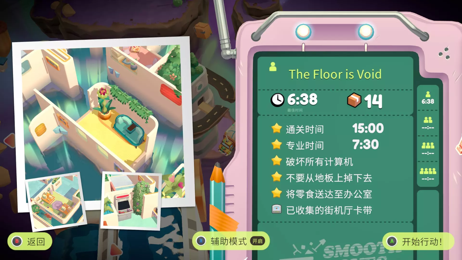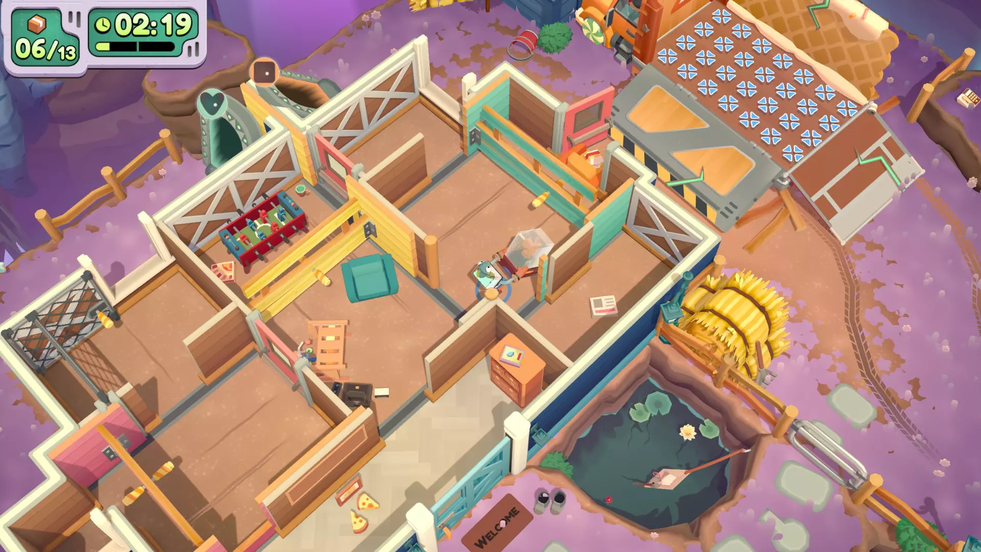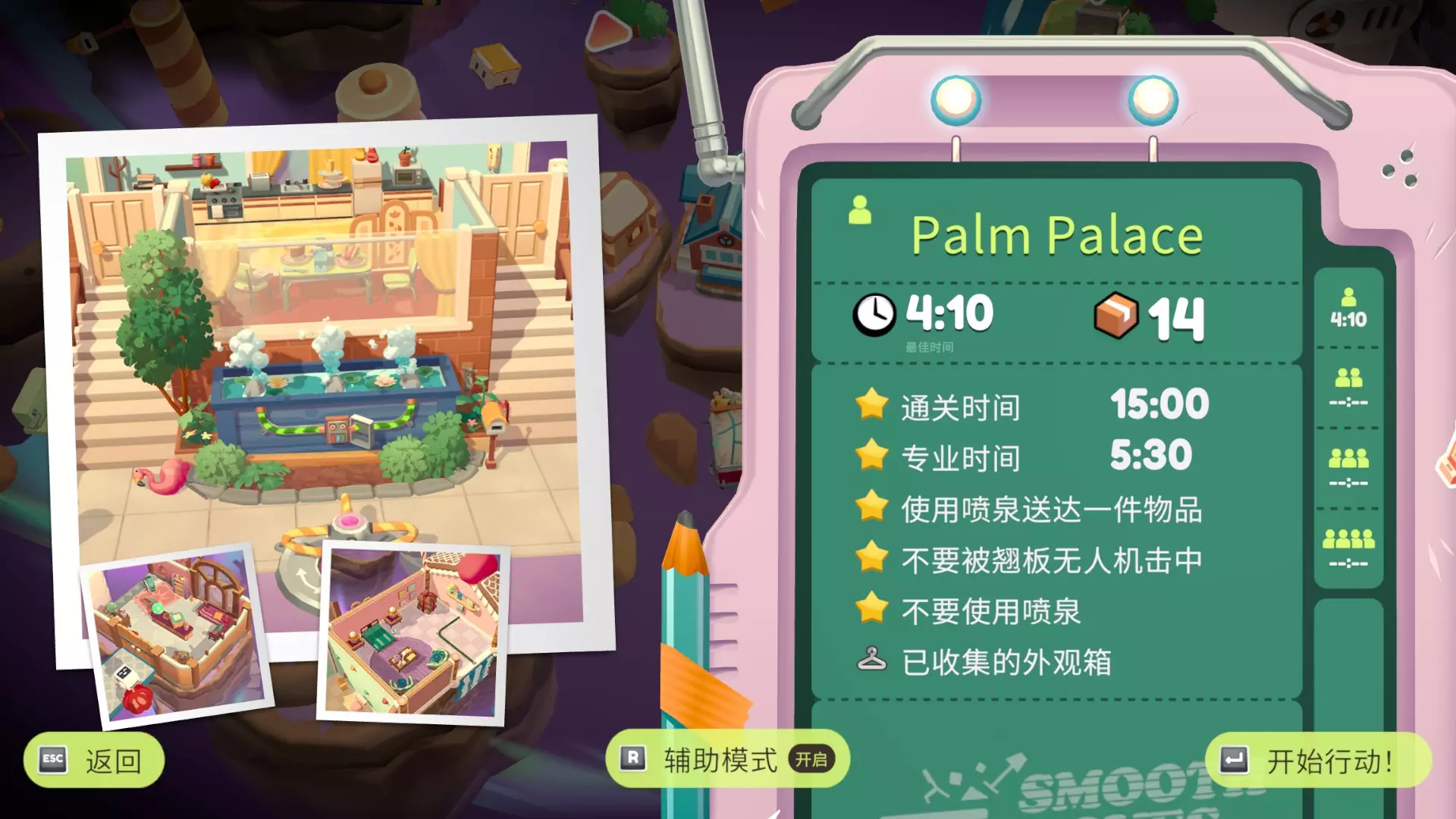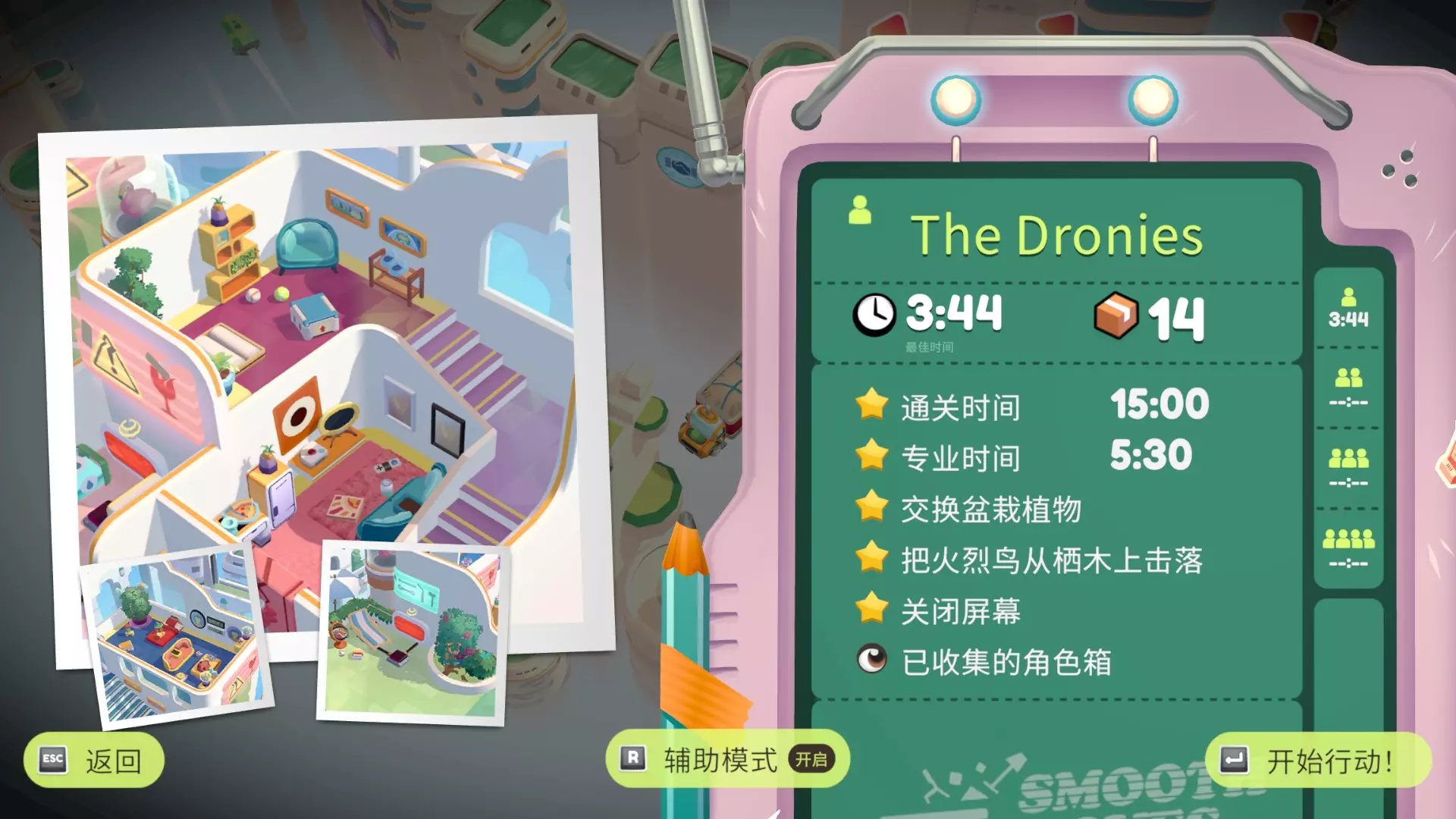 在只使用一次吸尘器的情况下完成搬家 不要送错任何物品 在3秒内分拣3件物品 可以一次性多攒几个,等门一关就往传送带上丢 泳池小屋