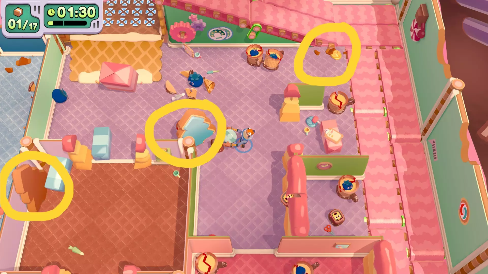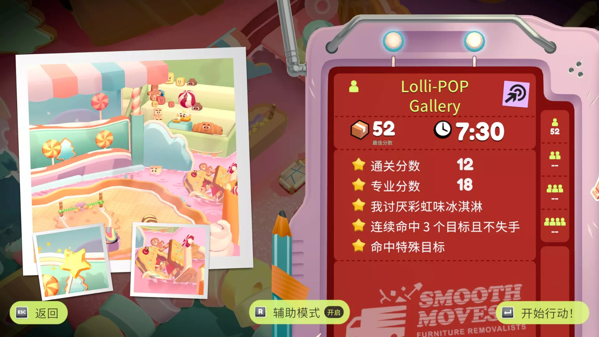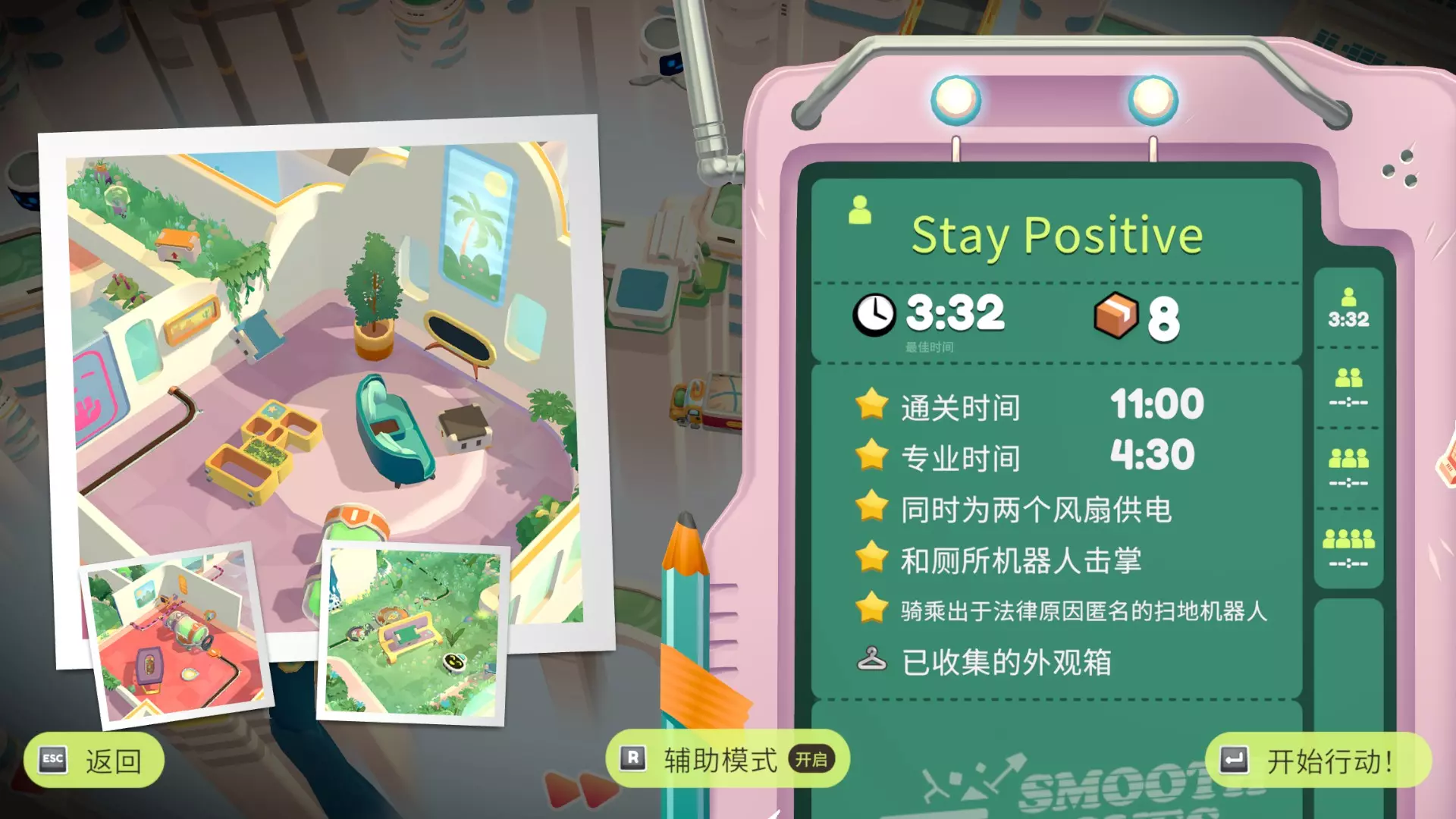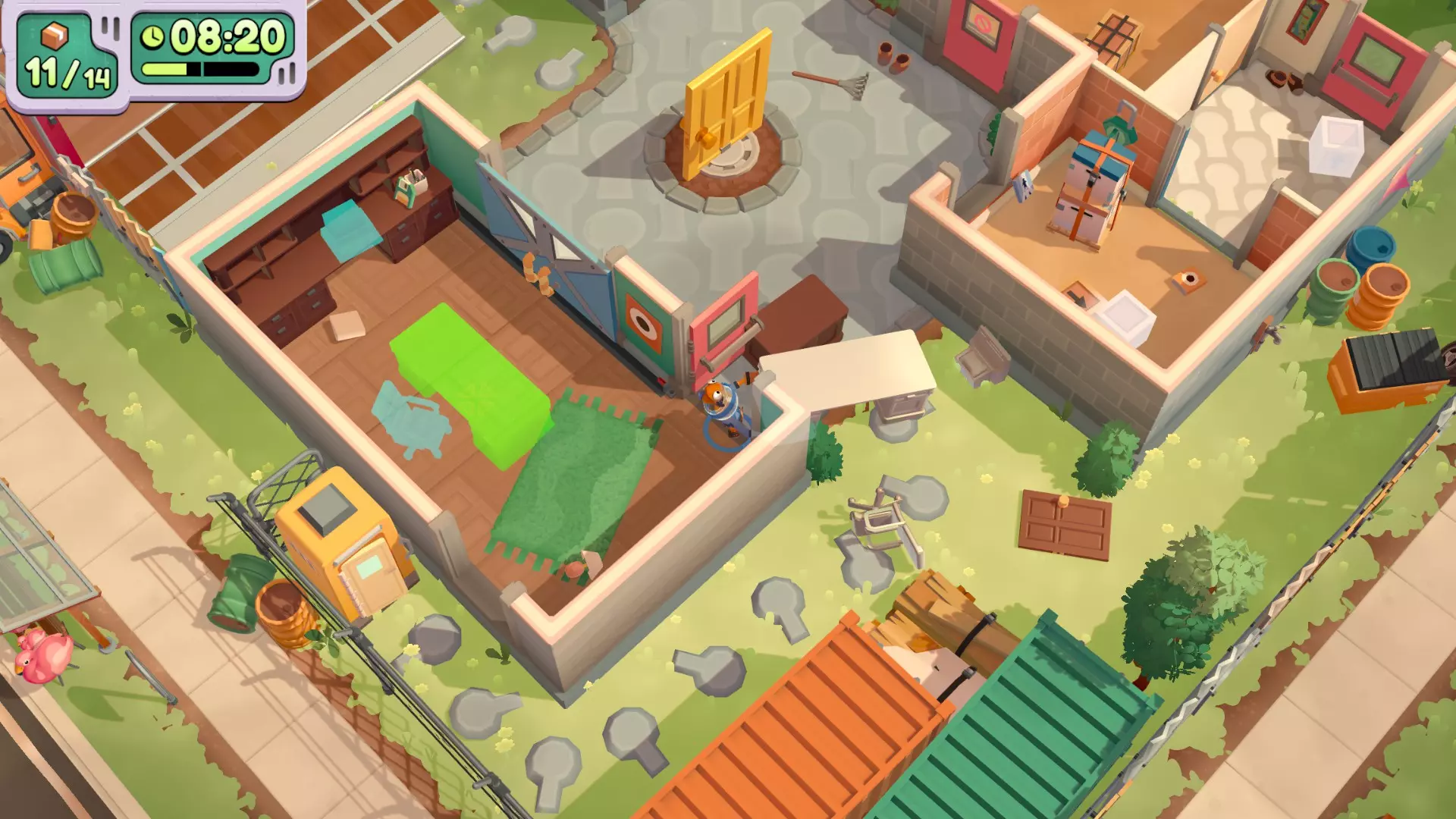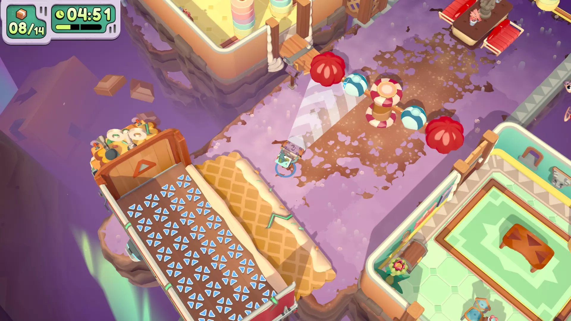 在只使用一次吸尘器的情况下完成搬家 不要送错任何物品 在3秒内分拣3件物品 可以一次性多攒几个,等门一关就往传送带上丢 泳池小屋