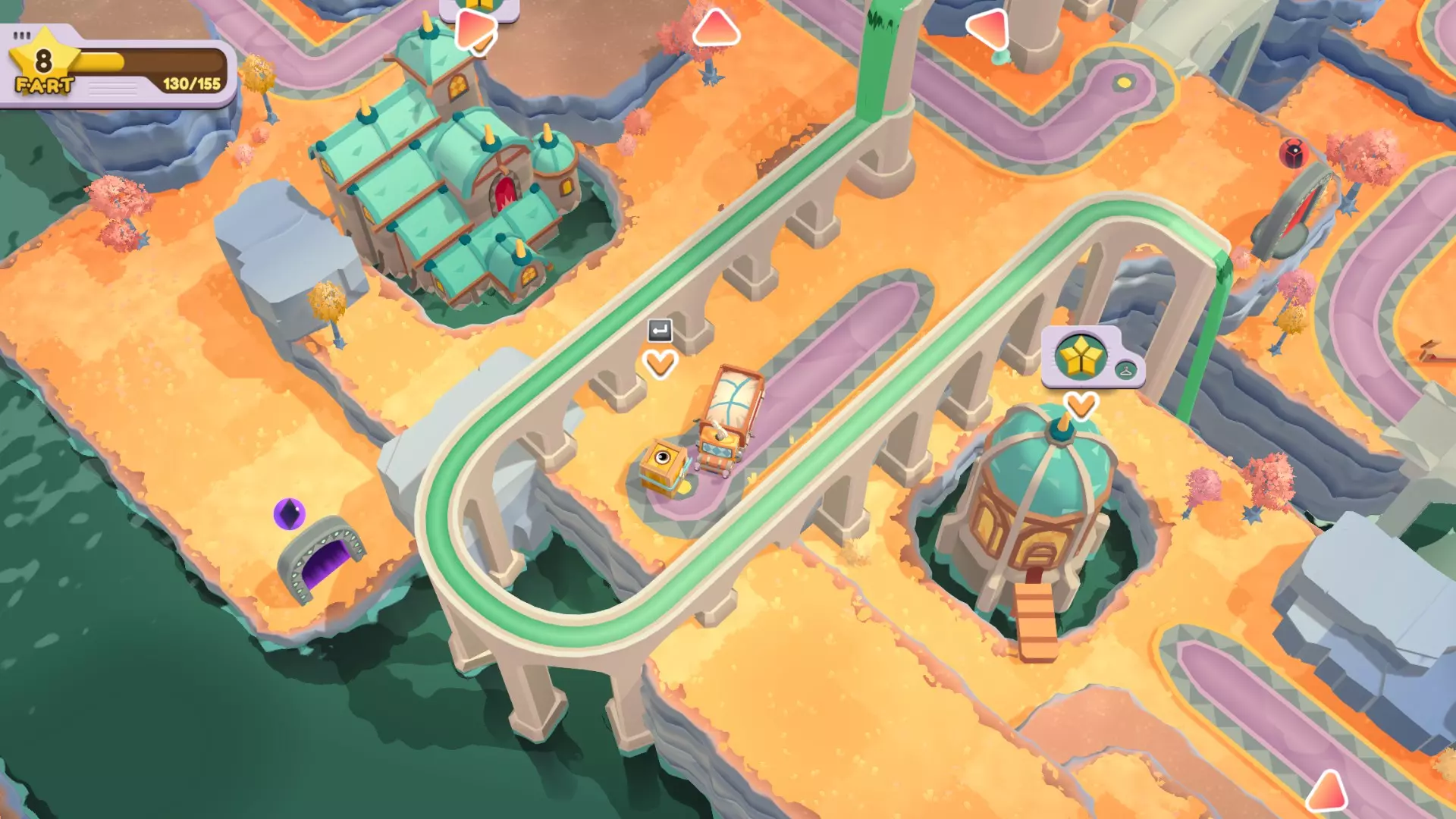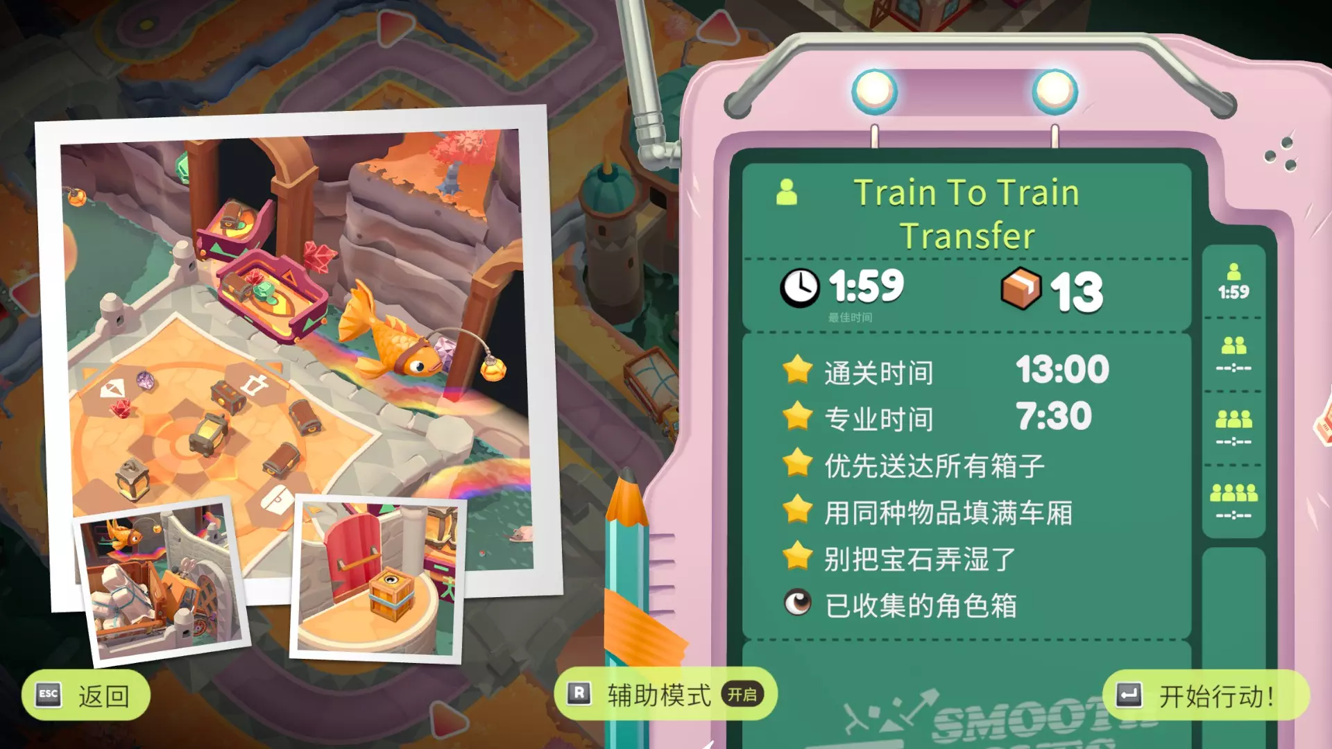 优先送达所有箱子 用同种物品填满车厢 把全部的A物品放在B车同一格车厢里 别把宝石弄湿了 角色箱在场景下方 坐火车跳过来